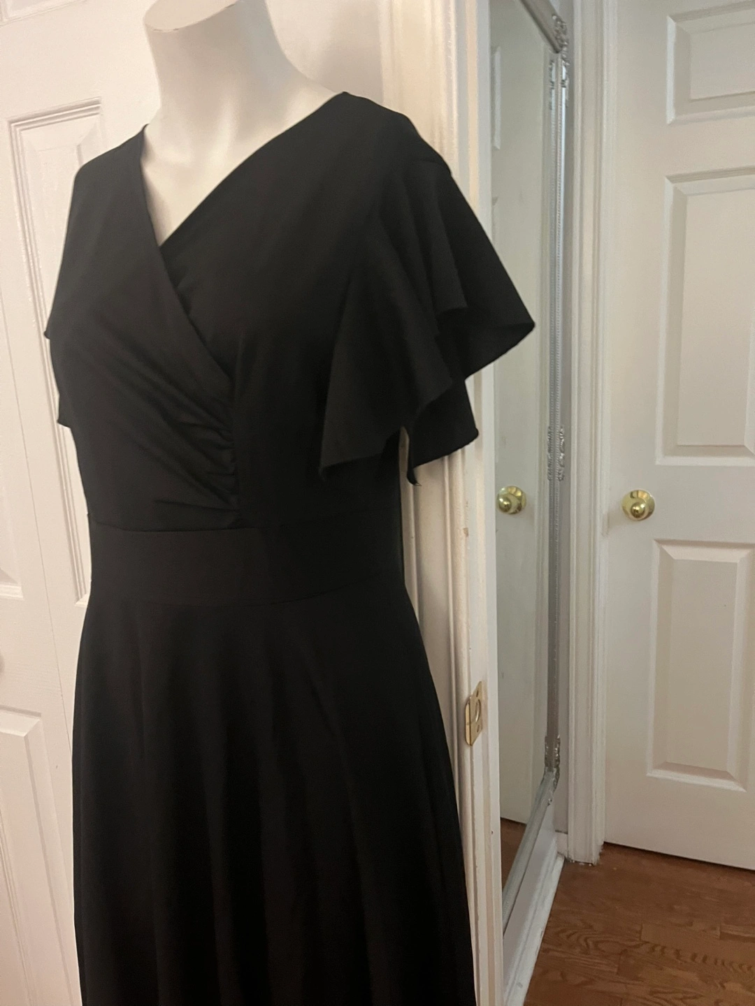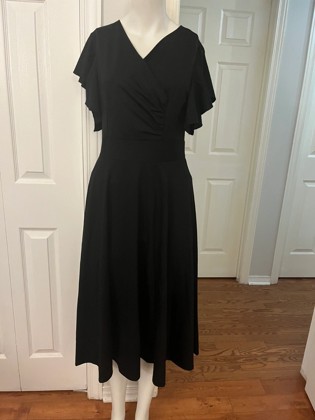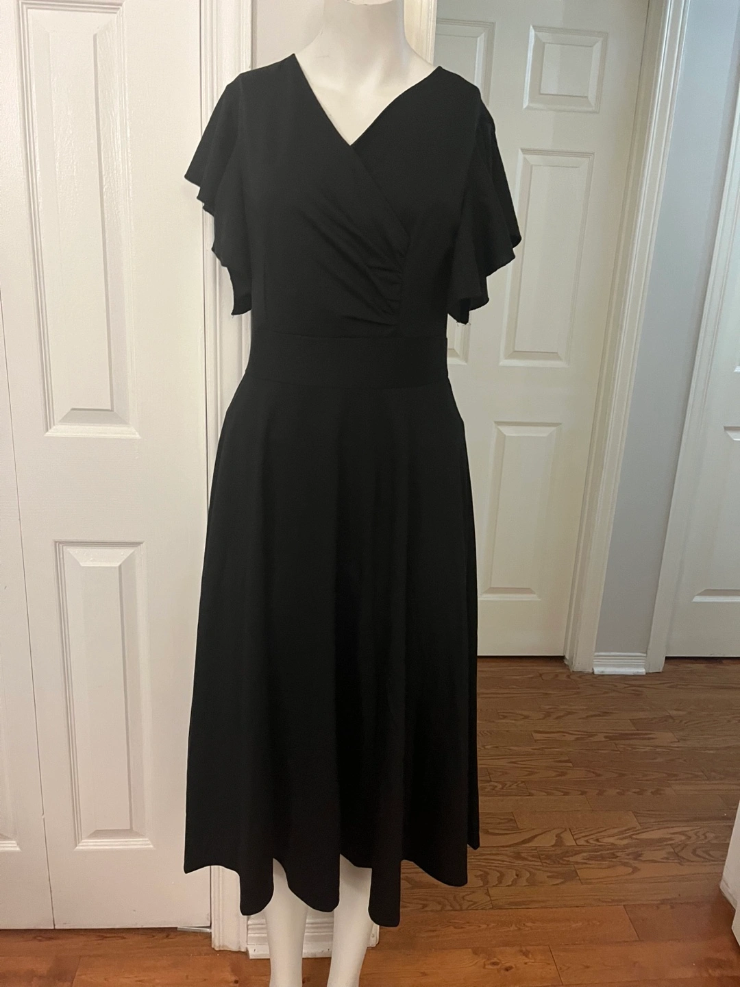 This is a lovely black midi dress with ruffle sleeves. It's made of 65% cotton and 35% polyester. Perfect for any occasion
