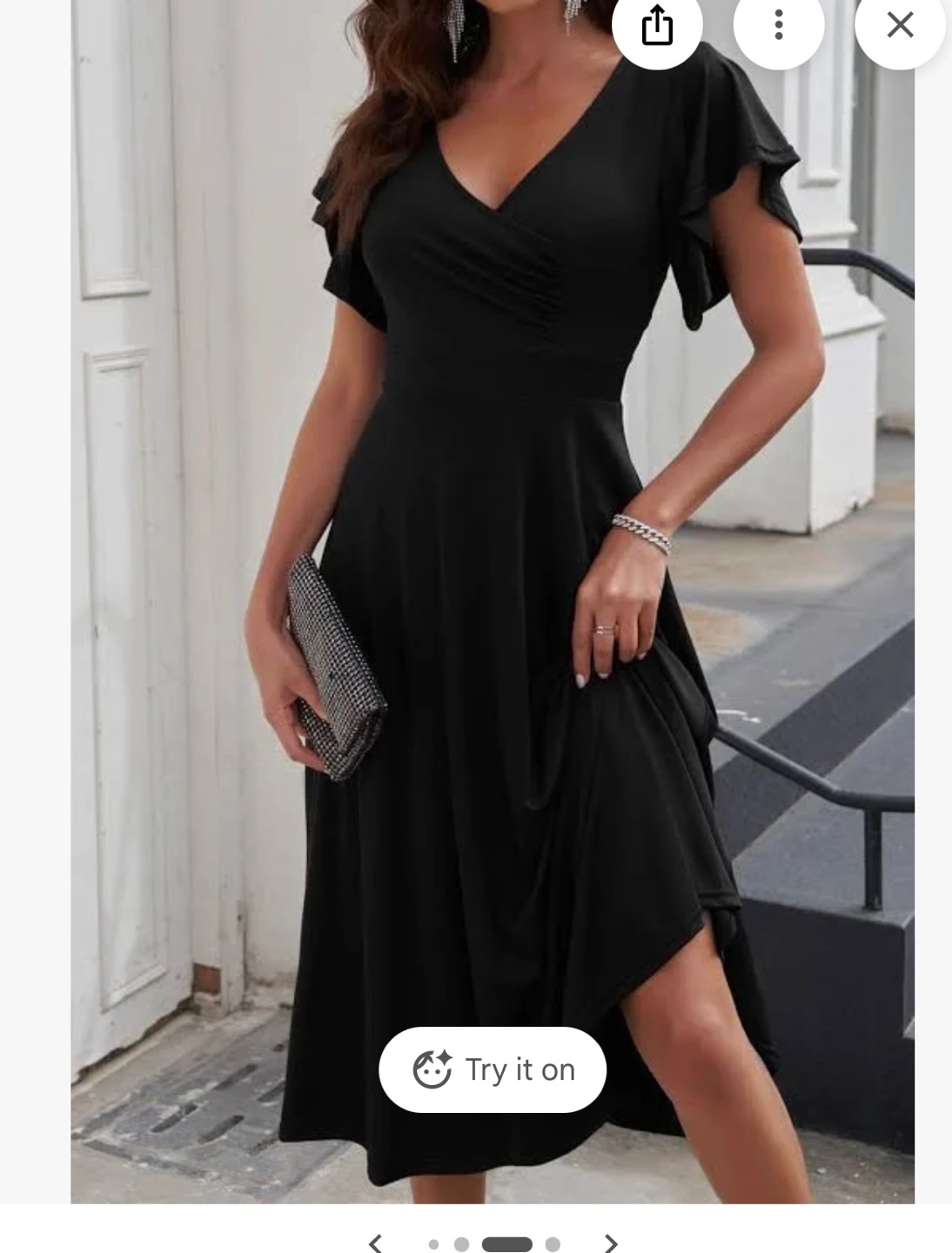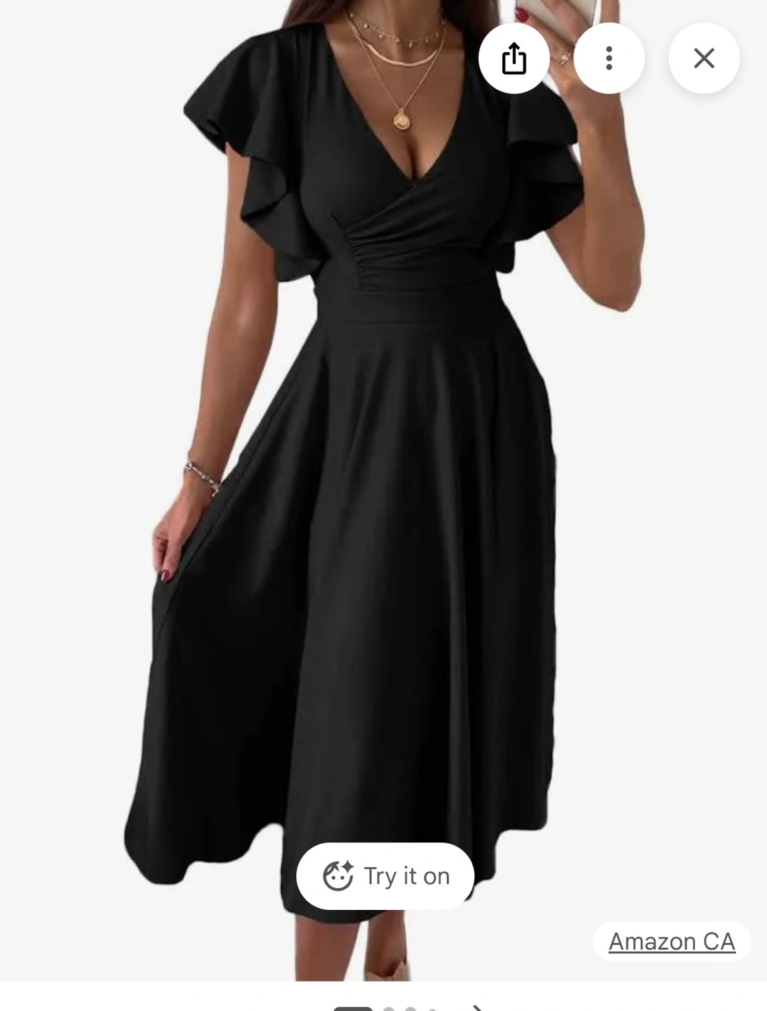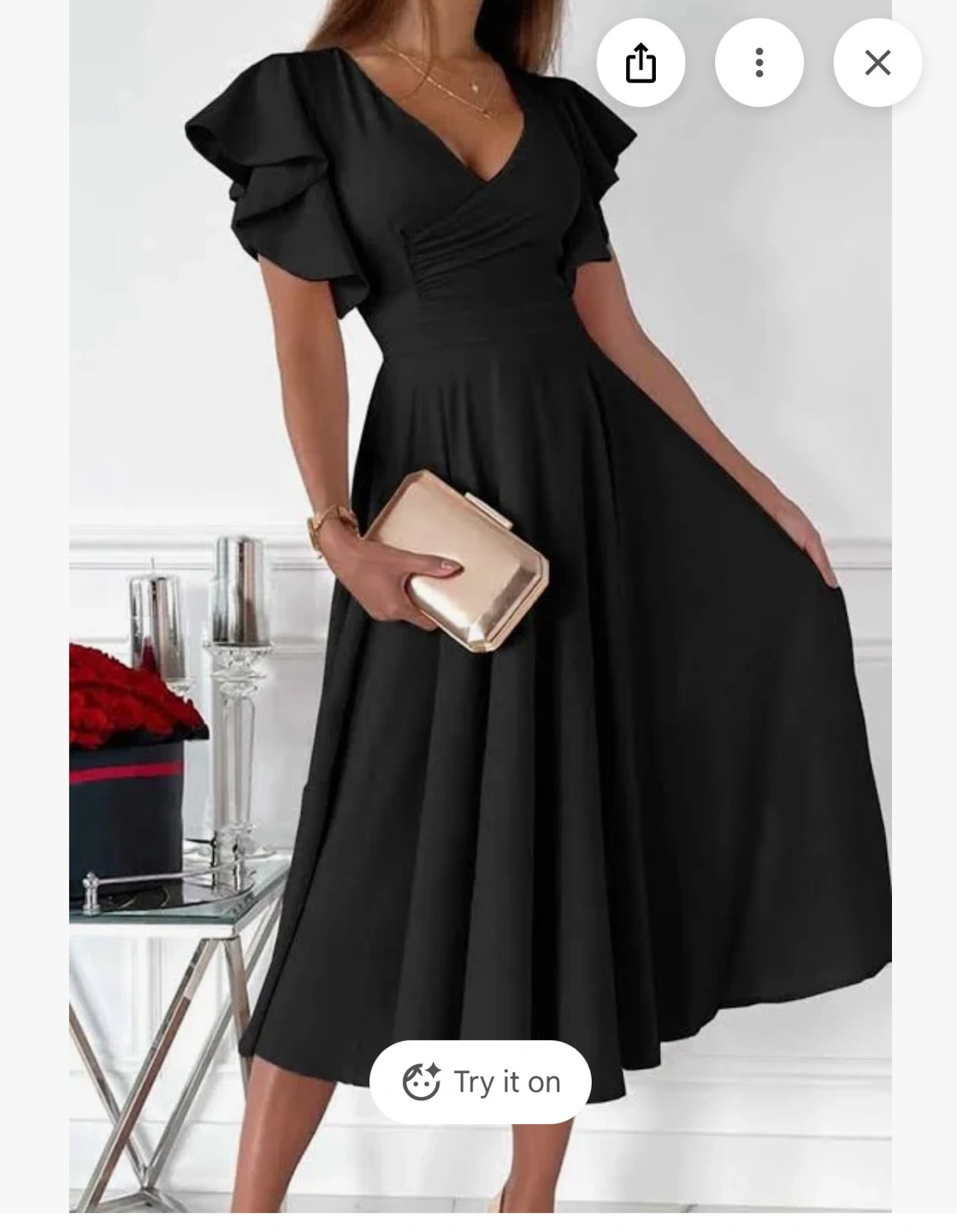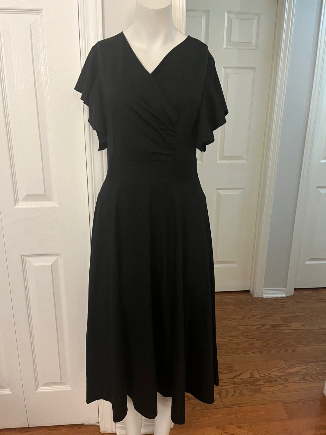This is a lovely black midi dress with ruffle sleeves. It's made of 65% cotton and 35% polyester. Perfect for any occasion