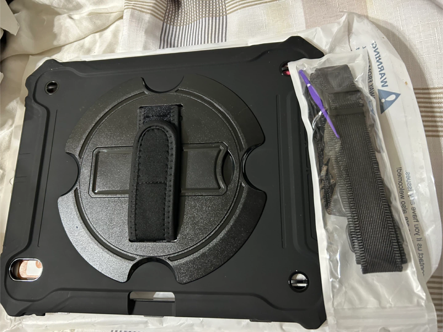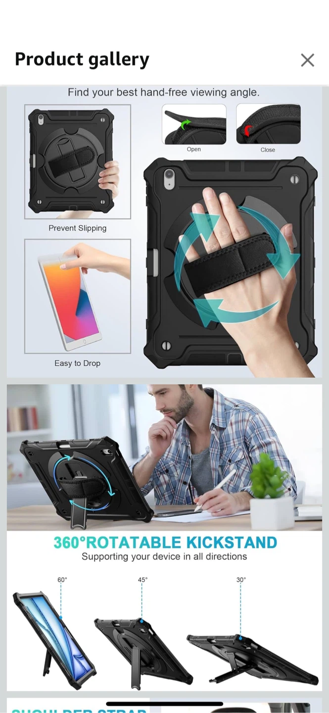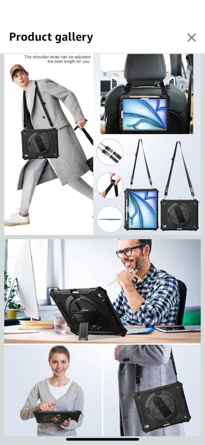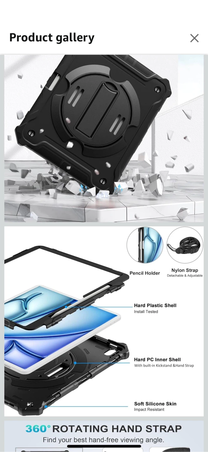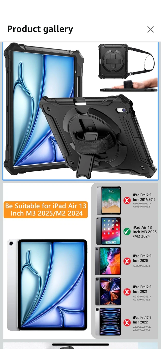 Selling a brand new ZtotopCases iPad Air 13 inch case, compatible with the M3/M2 ! It's black and comes with a 360° rotatable kickstand, providing support in all directions. The case is made of high-quality TPU and silicone materials, and it also features a pencil holder design to easily store your Apple Pencil. Also included is a shoulder strap for easy carrying and hand straps to prevent slipping!