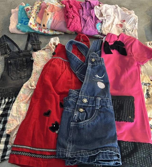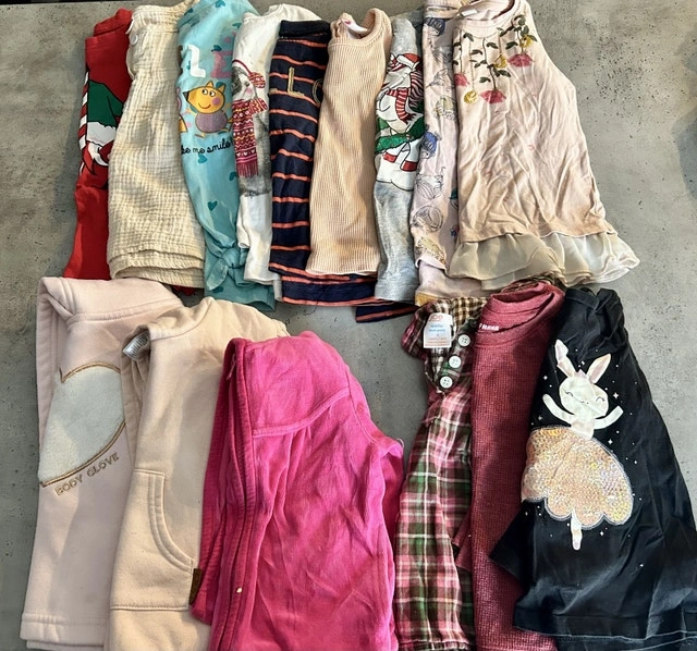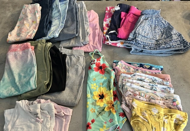 T-shirts, pants, shorts/skirts, long sleeve shirts, sweaters, dresses/overalls, undies, bathing suit, and undershirts. All in good quality. Some never worn or worn only a few times.