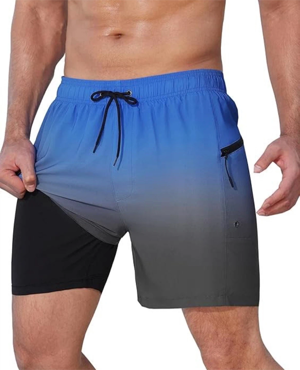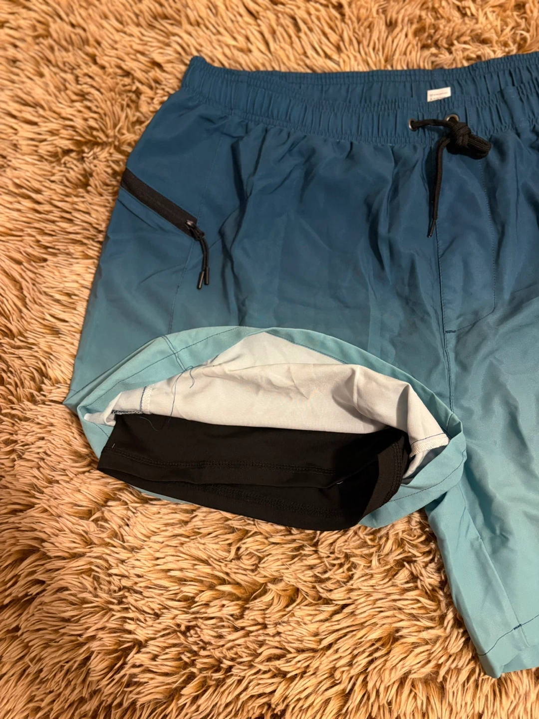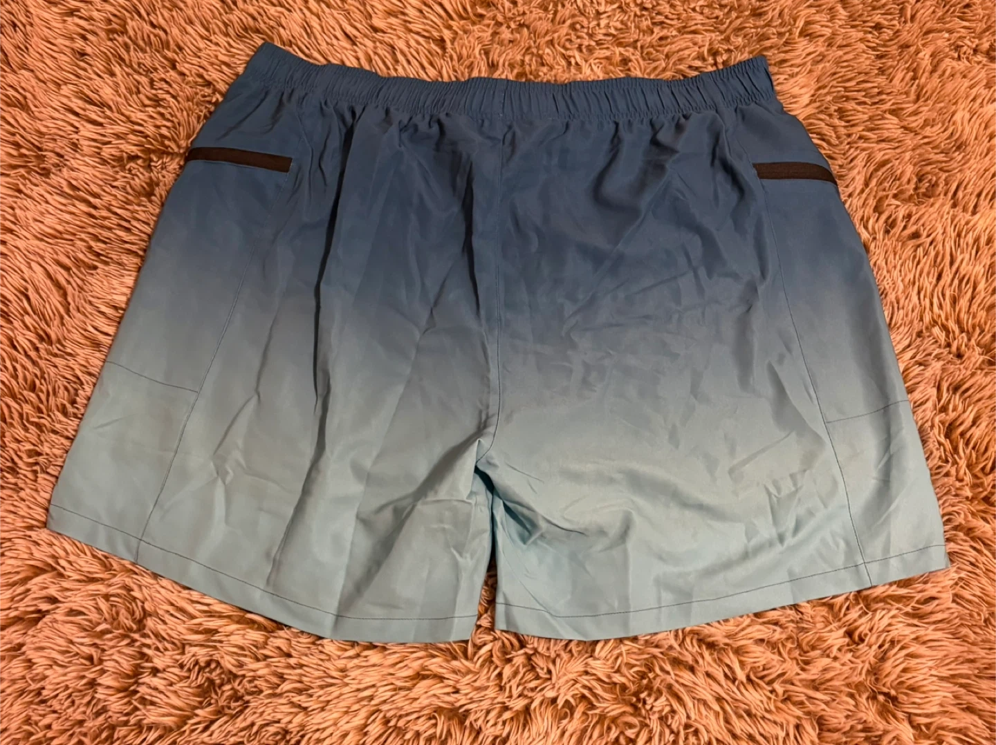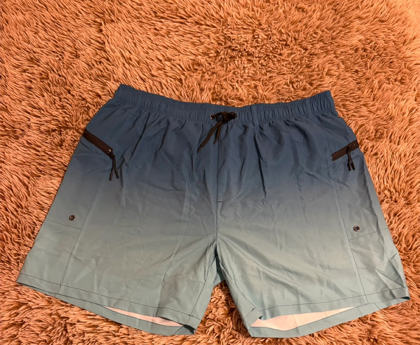 Selling a pair of blue ombre swim trunks in size XXL. They have a drawstring and zipper pockets. The material is lightweight and comfortable, perfect for swimming or lounging!