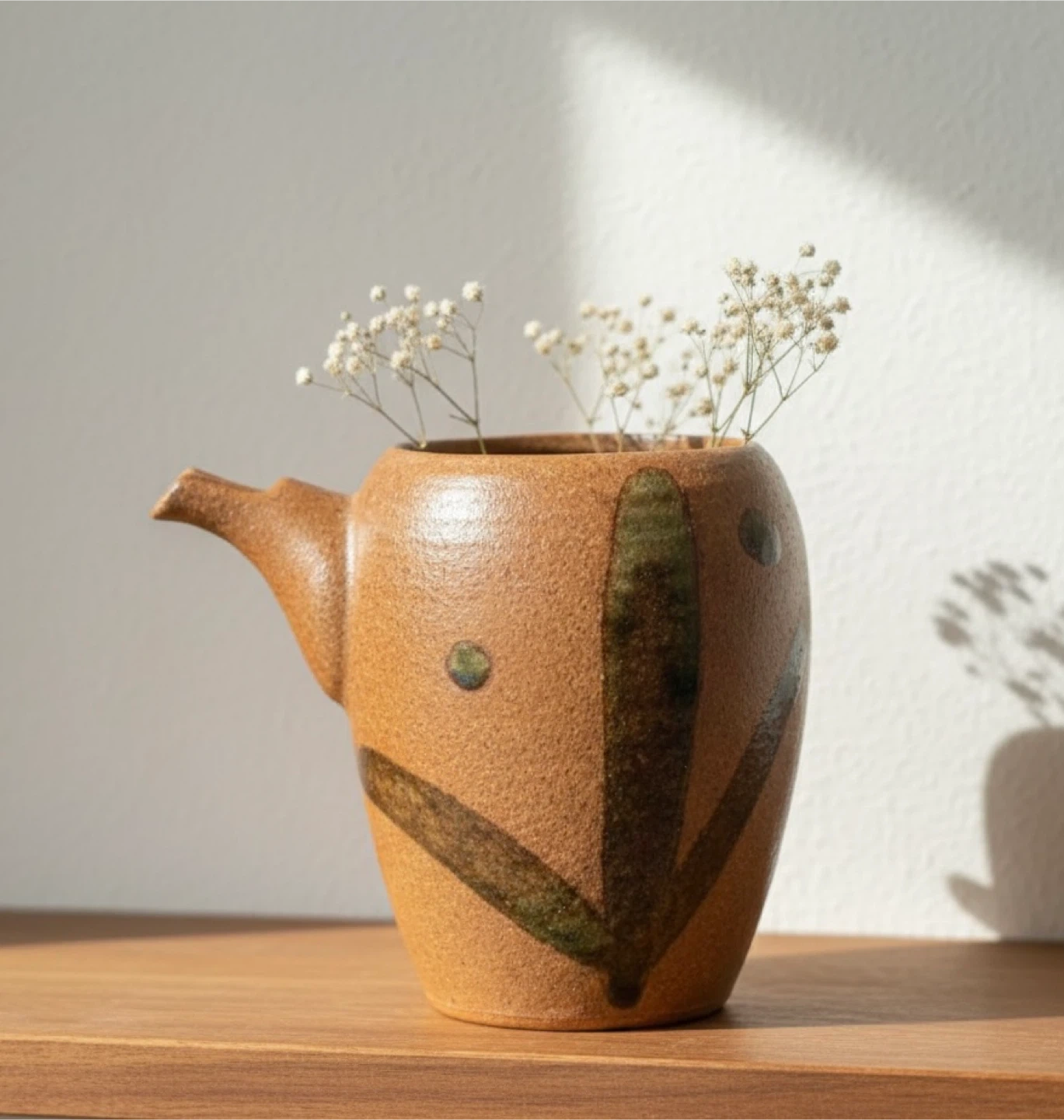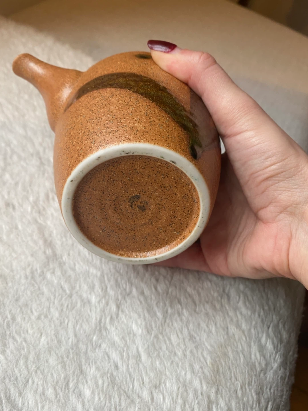Unique handmade vase or creamer cup! It has a lovely rustic look with speckled earthy tones and a distinctive spout. Has a greenish iridescent black design on front. Pickup Liberty village