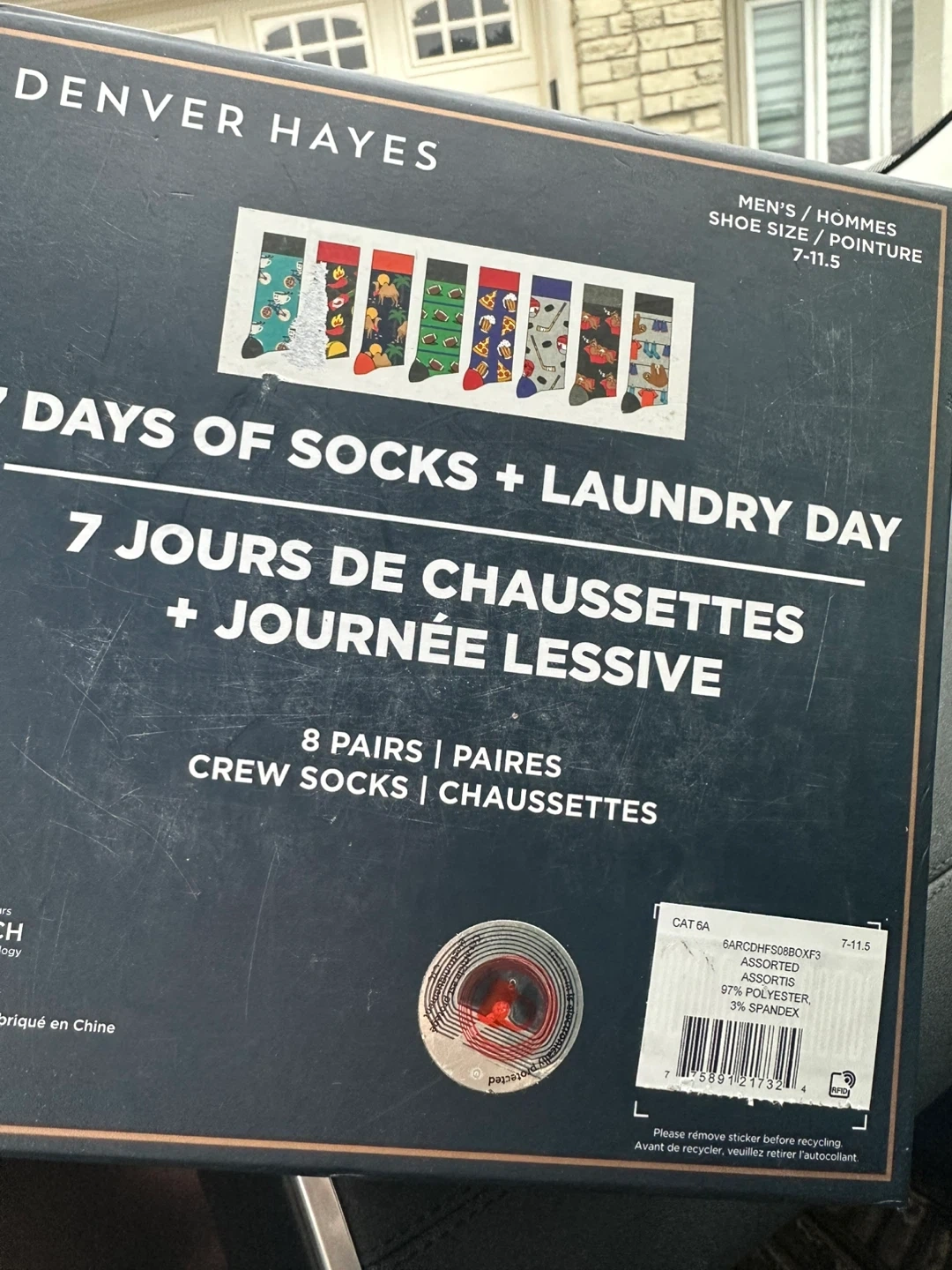 Selling a set of Denver Hayes socks, perfect for adding some fun to your week! This set includes 8 pairs of crew socks, each with a unique design for every day of the week plus laundry day. The socks are made of 97% polyester and 3% spandex, ensuring a comfortable fit. They fit men's shoe sizes 7-11.5