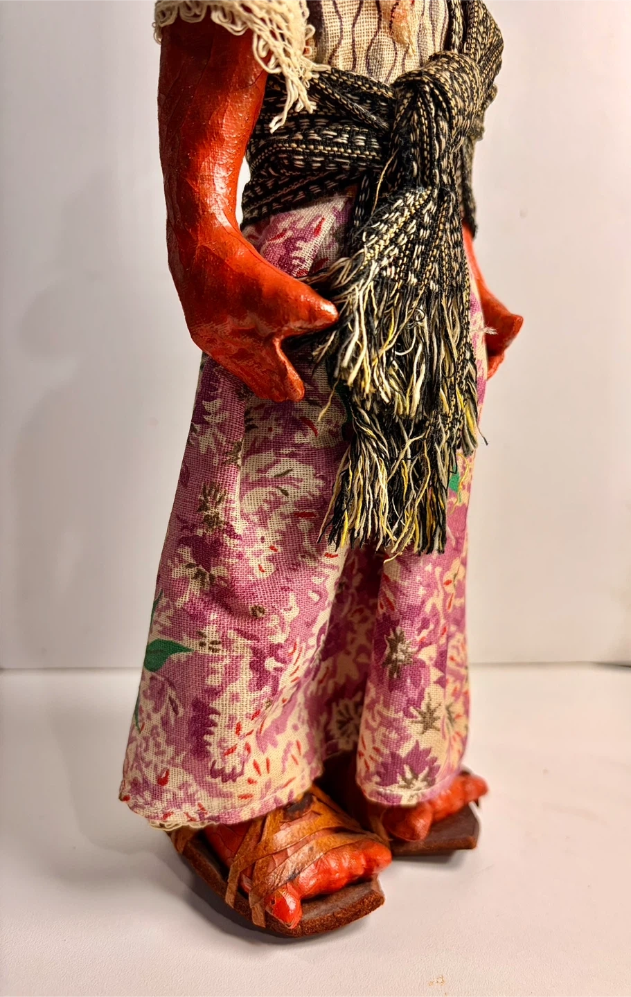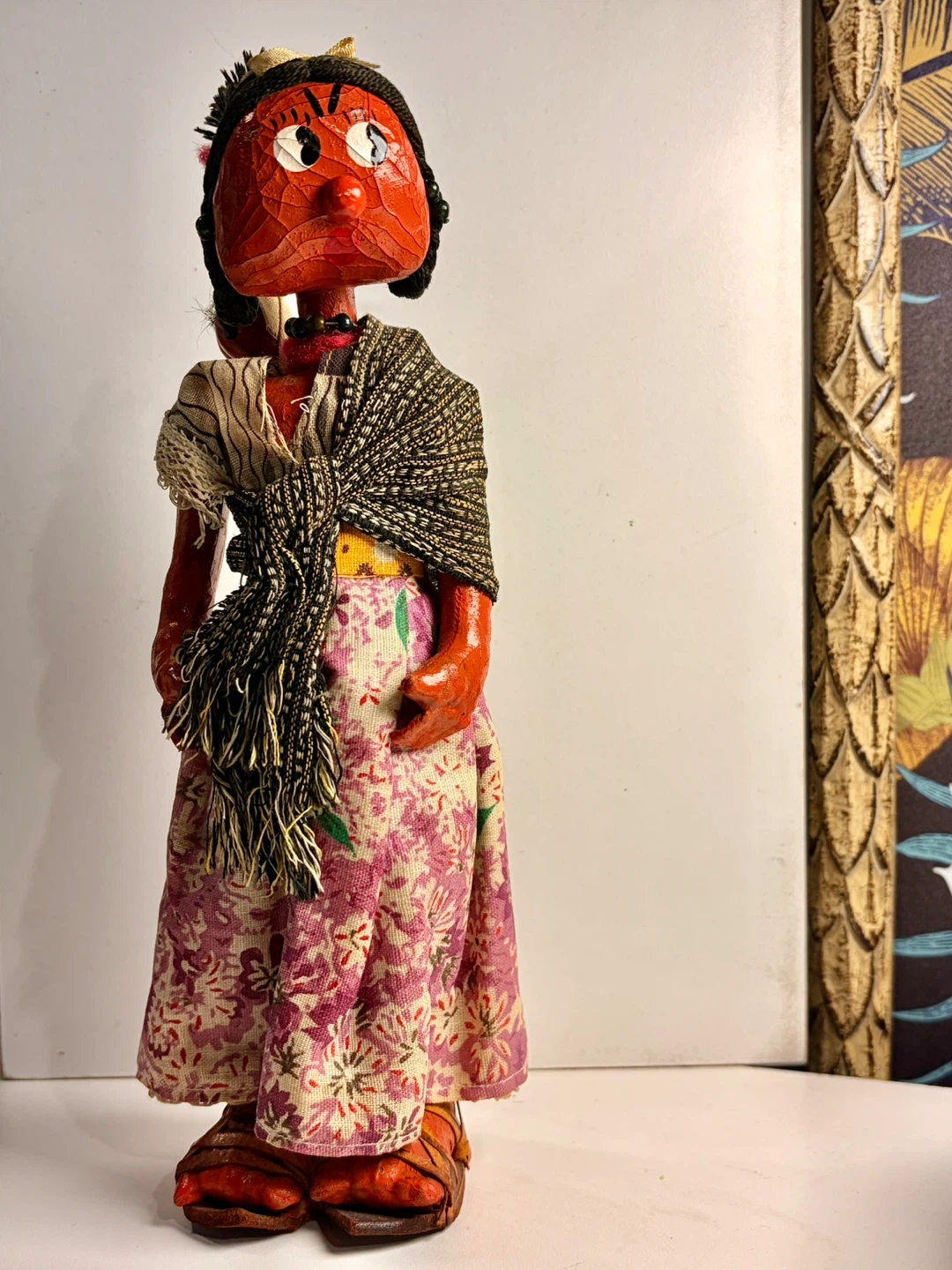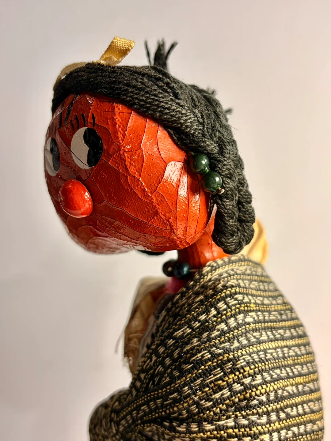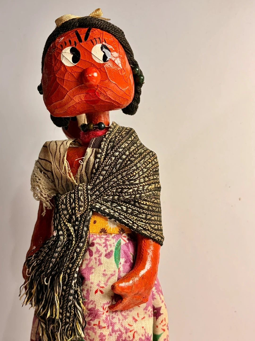 Selling a vintage Mexican oil cloth folk art doll. This unique piece features a hand-painted papier mâche face and arms/hands with a traditional woven shawl. The doll measures about 10” tall and is wearing a floral print dress with different fabric and lace trim…with leather sandals. Her hair is woven into a traditional style, and her tiny wire beaded jewelry completes her look.