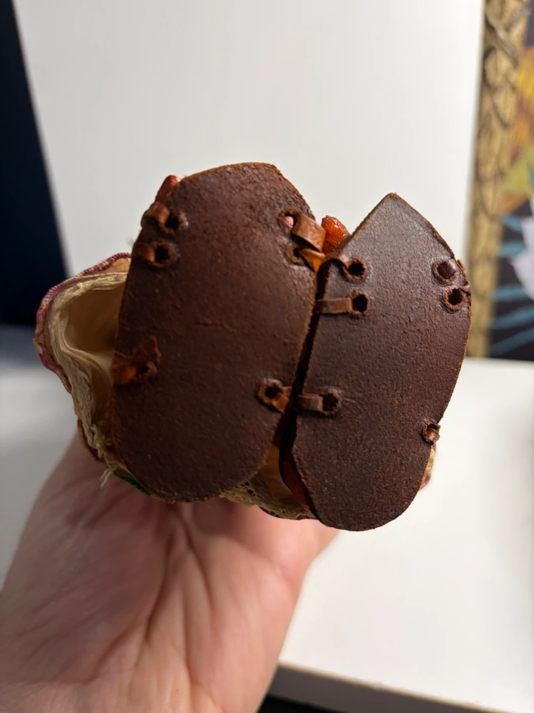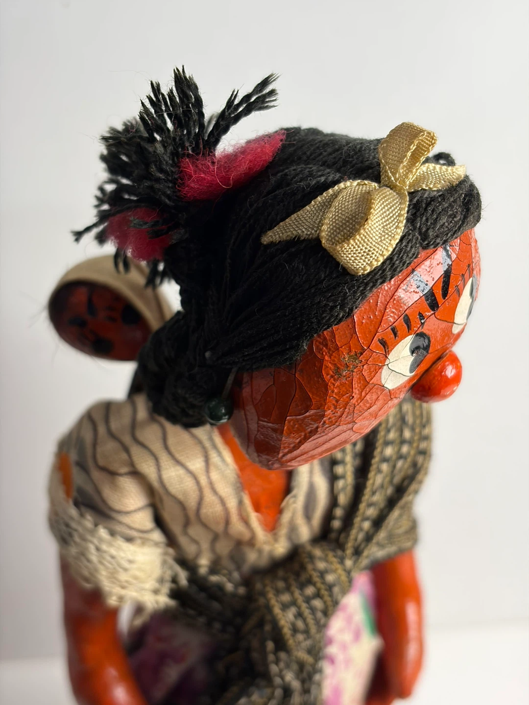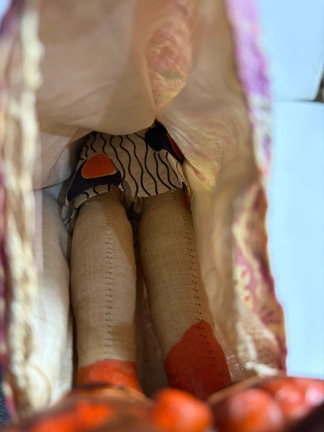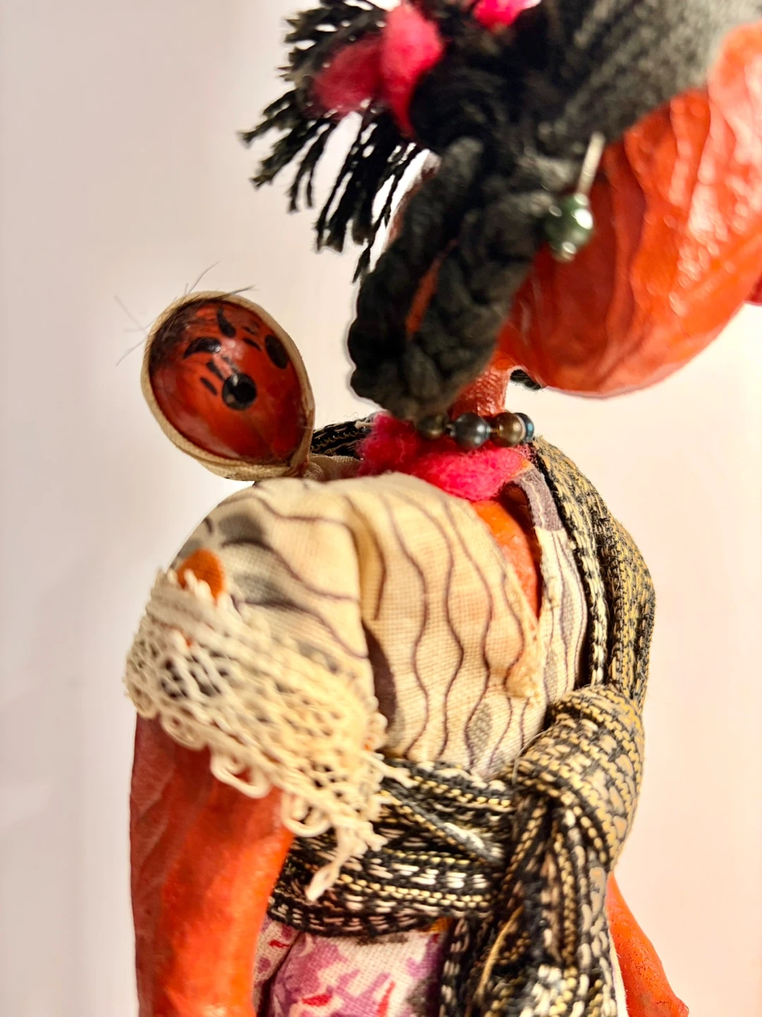 Selling a vintage Mexican oil cloth folk art doll. This unique piece features a hand-painted papier mâche face and arms/hands with a traditional woven shawl. The doll measures about 10” tall and is wearing a floral print dress with different fabric and lace trim…with leather sandals. Her hair is woven into a traditional style, and her tiny wire beaded jewelry completes her look.