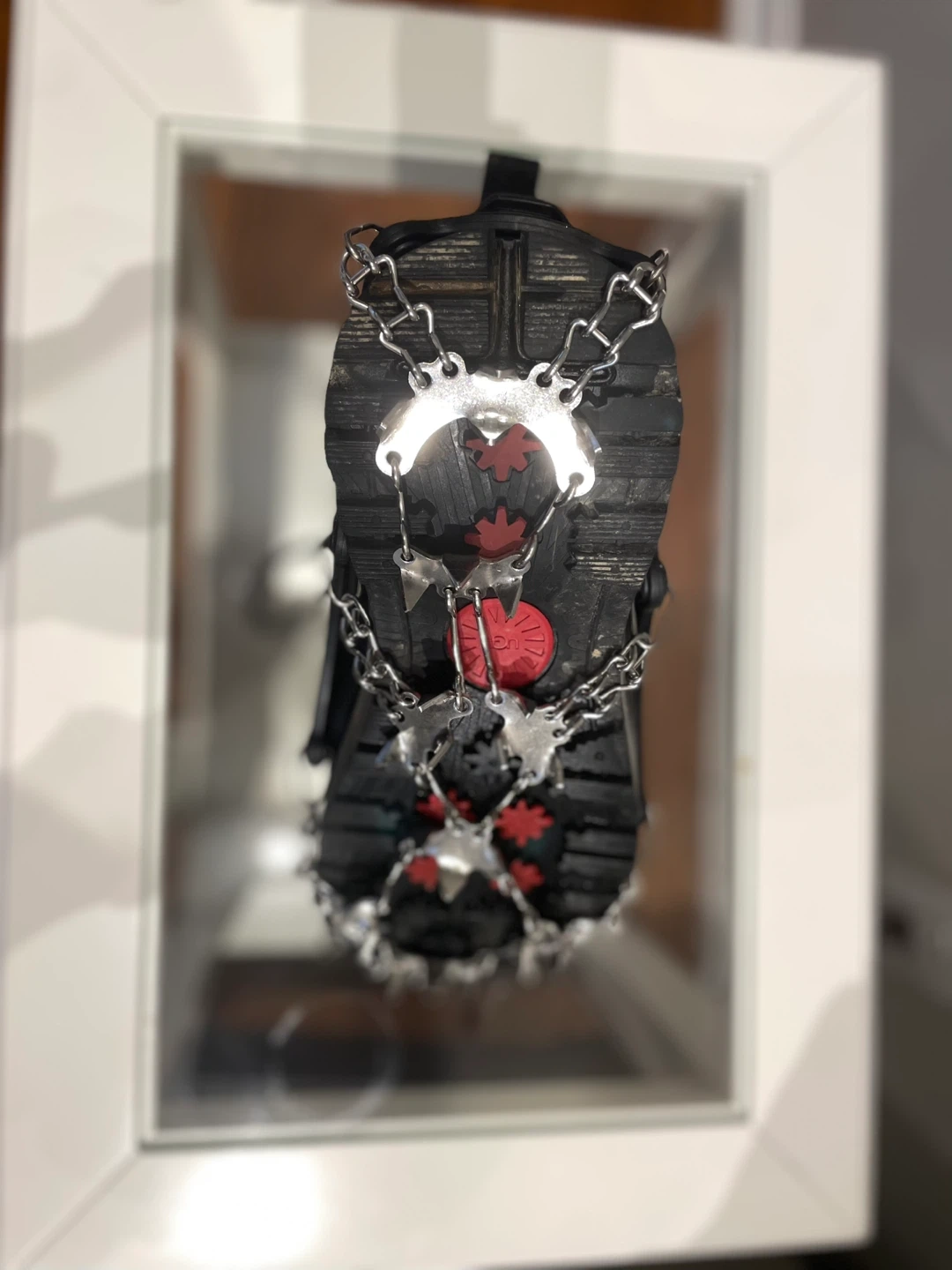 Brand new 25-spike crampons providing strong traction on ice and packed snow.
