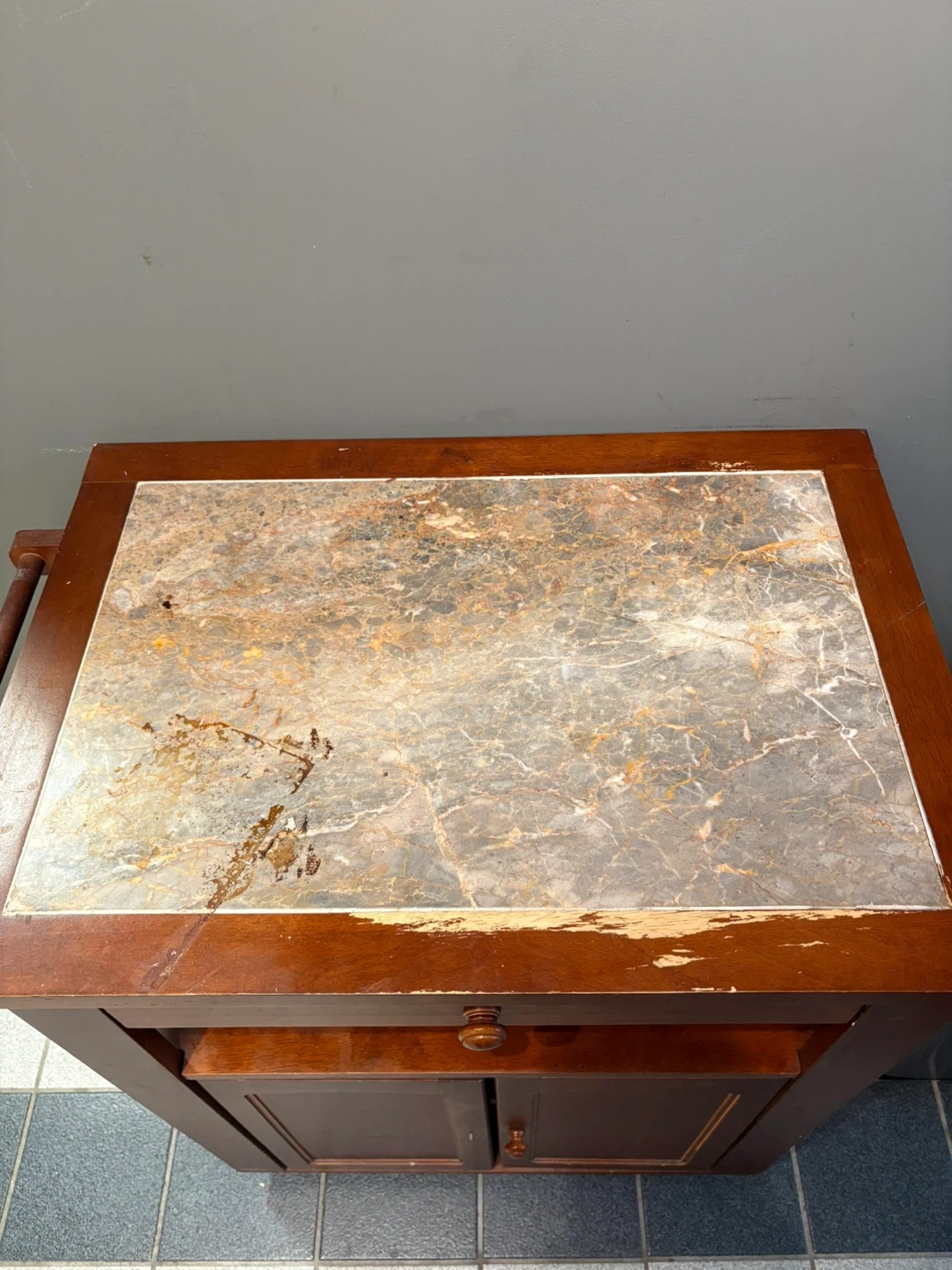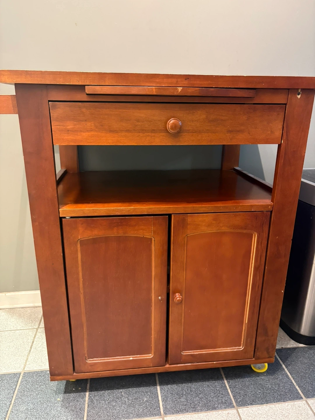Selling a wooden kitchen cart with a marble top! It features a drawer, open shelf, and a cabinet with doors for extra storage.