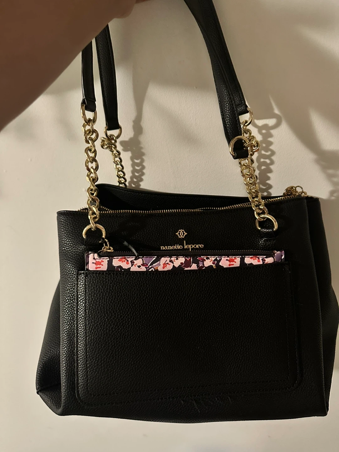 Selling a stylish black tote bag from Nanette Lepore! It features gold chain detailing on the straps and a convenient front pocket. Perfect for everyday use