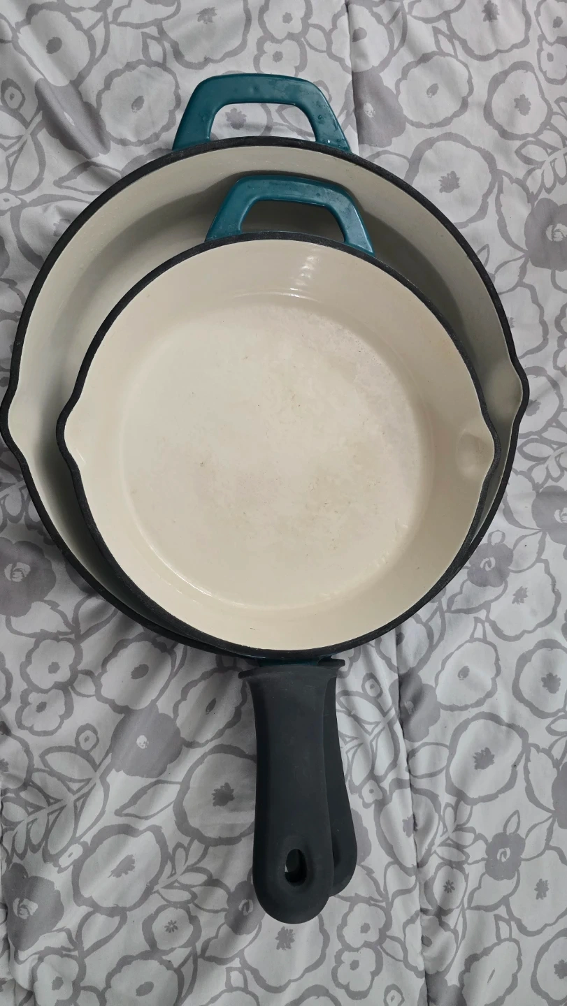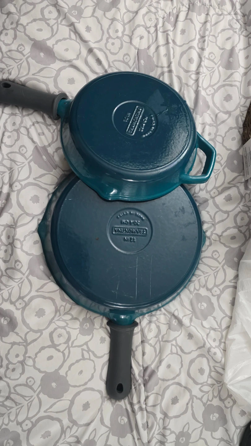 Selling a Tramontina 12-inch enameled cast iron skillet. It's in great shape and ready for your kitchen! The skillet is a beautiful teal colour and is perfect for cooking a variety of dishes. It's durable and easy to clean, making it a great addition to any cook's collection