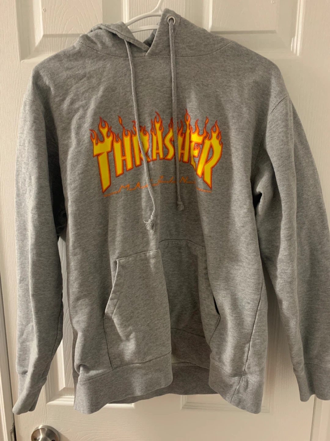 Selling a grey Thrasher hoodie with the iconic flame logo. It's in great shape and ready for a new owner! Perfect for staying cozy and showing off your style.
