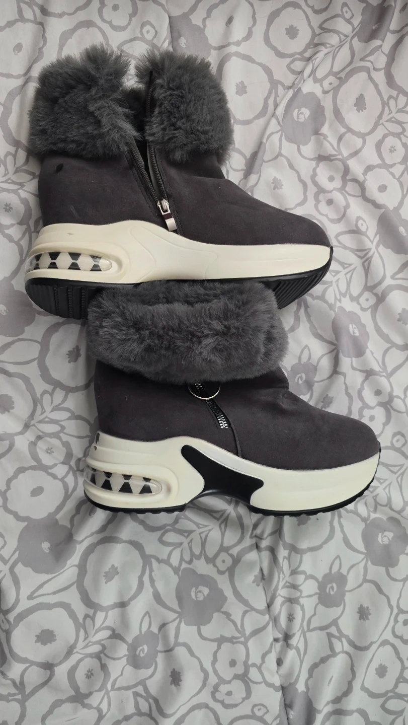 Cozy and stylish grey ankle boots with a fun fur trim! These boots are a size 41, which is about a size 10 in Canadian sizing. Perfect for adding a bit of flair to your winter outfits!