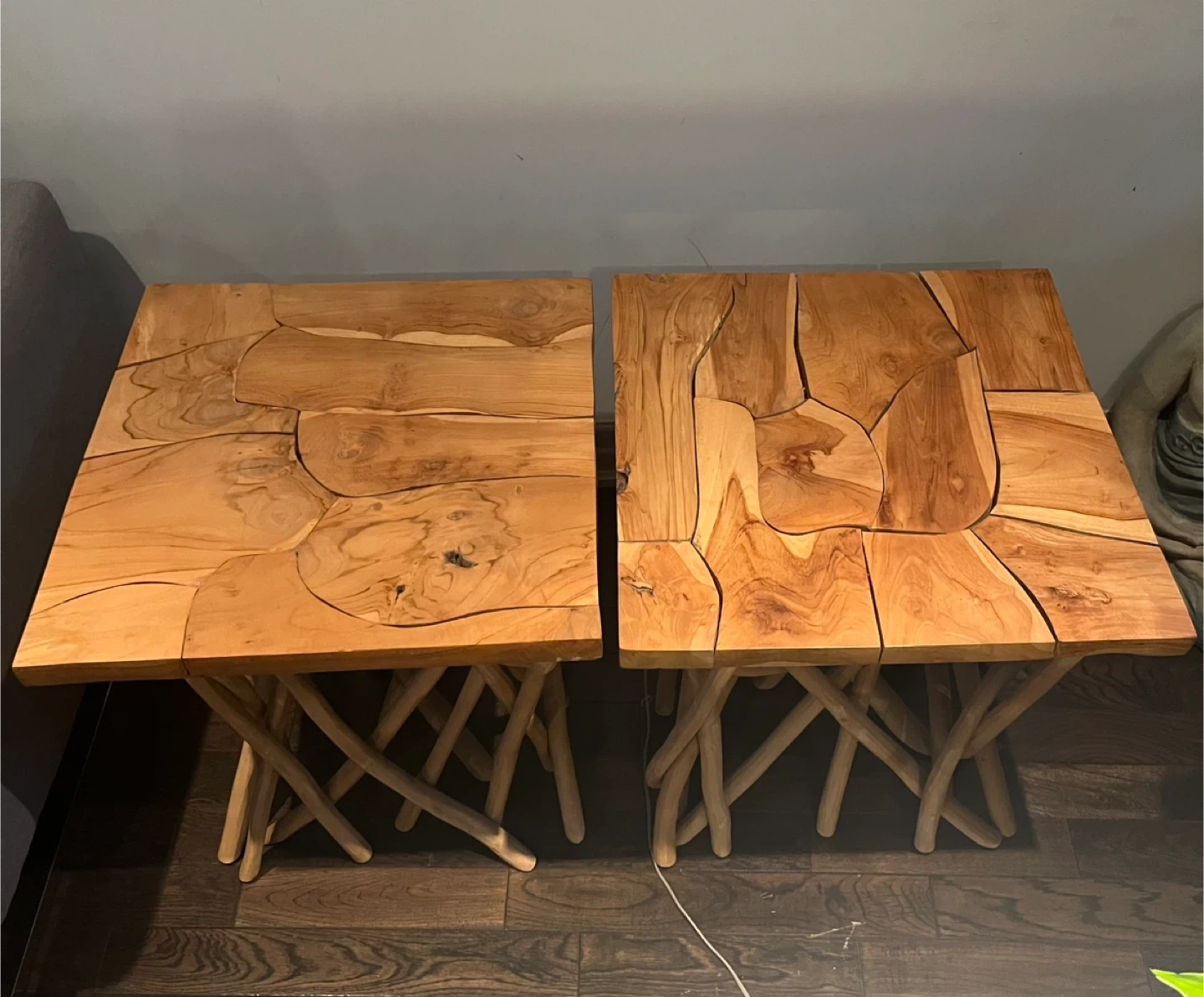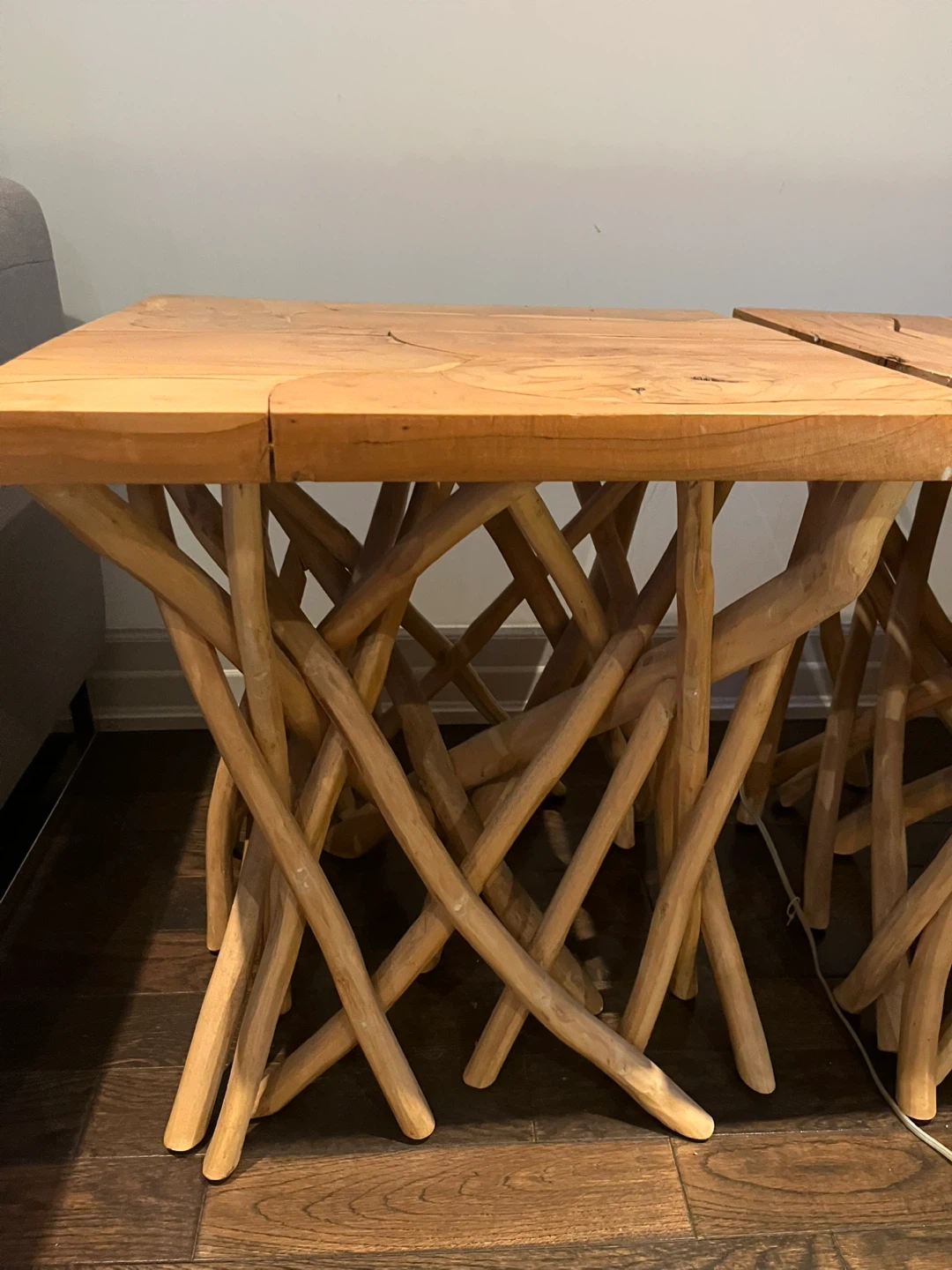 Selling a pair of wooden side tables with a unique, eye-catching design. These tables feature a natural wood finish and a distinctive base. Perfect for adding a touch of rustic charm to any room! 22" x 22" x 22" $250 for both.