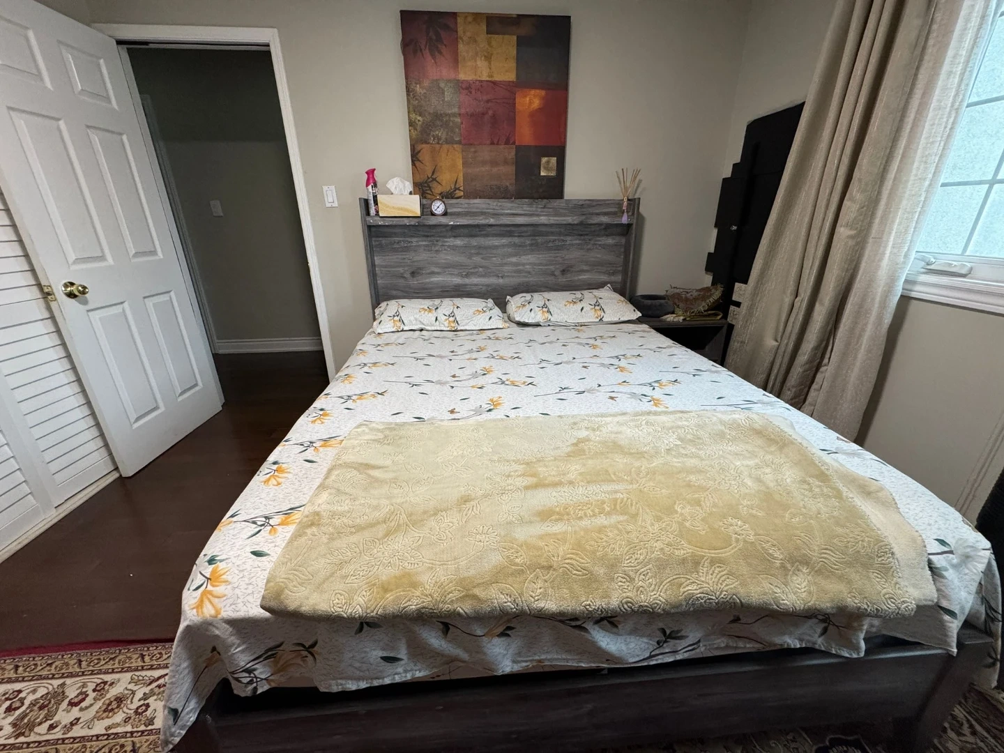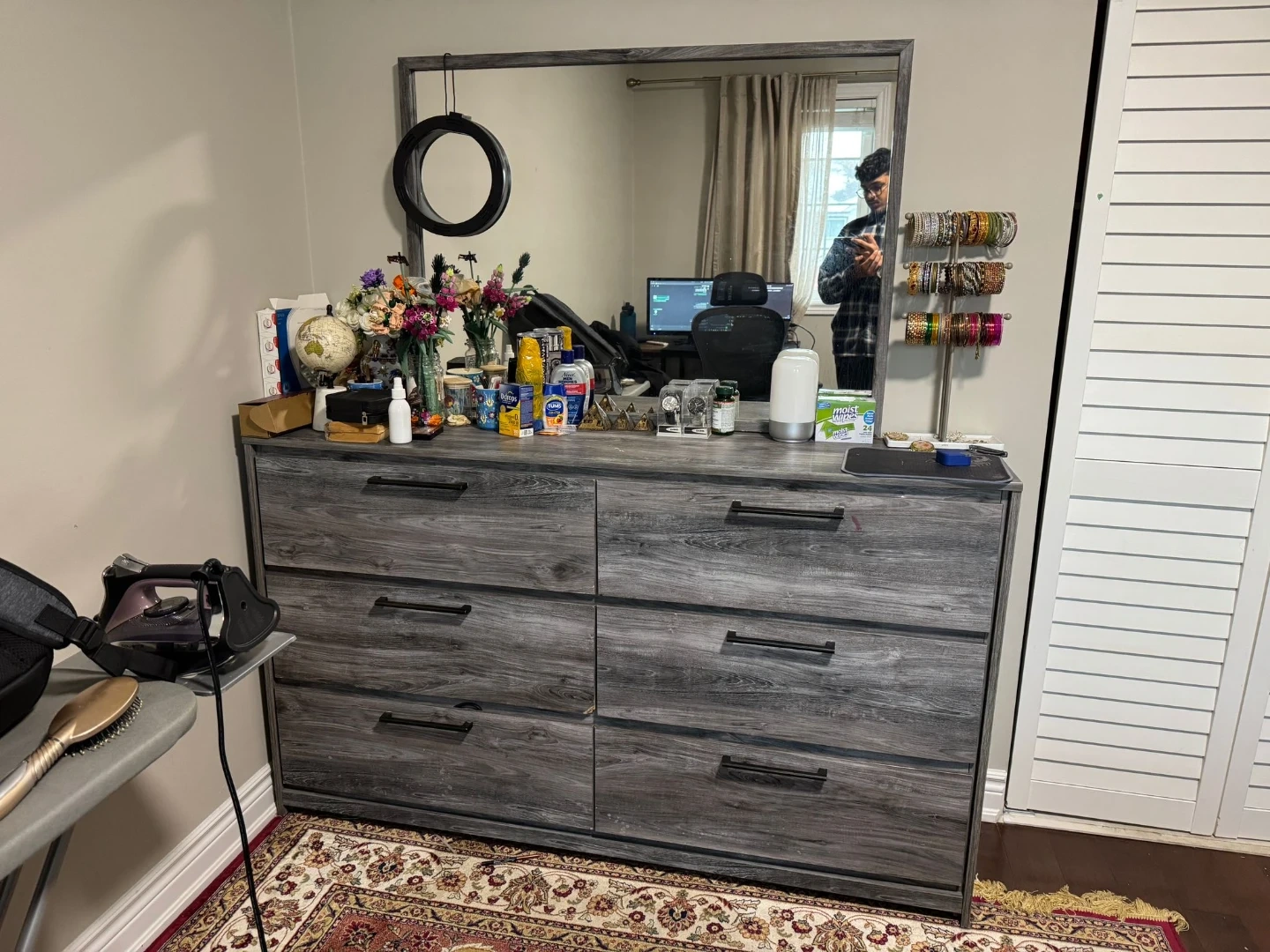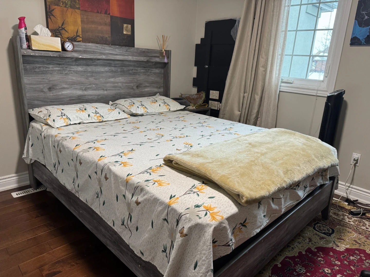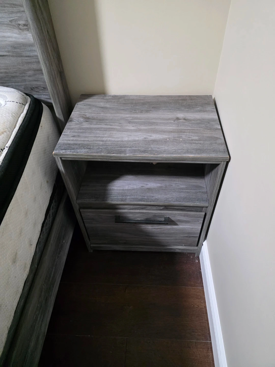 Selling a bedroom set in a grey wood grain finish. Includes a bed frame, a six-drawer dresser with a mirror, and a nightstand with a drawer and open shelf. Great for updating your bedroom's look!