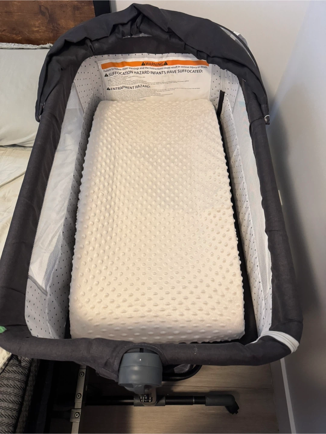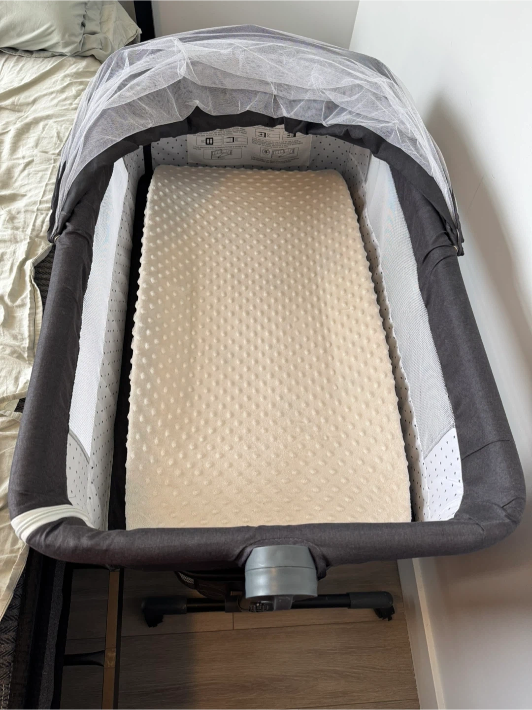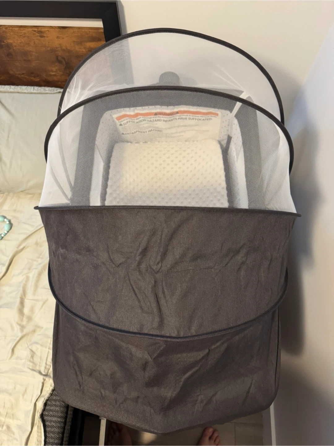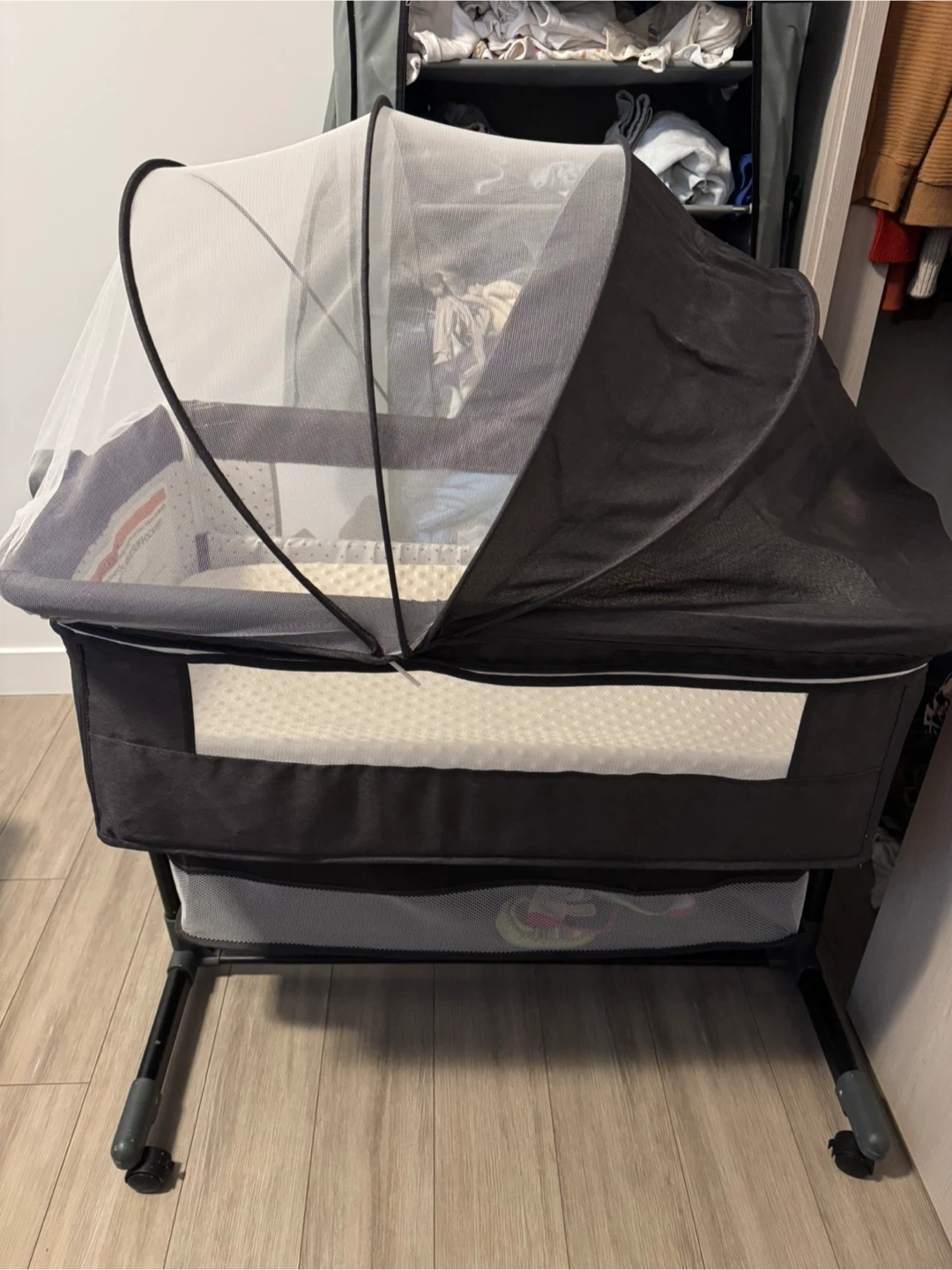 Selling a baby bassinet in great condition! It comes with a mosquito net to keep your little one protected. The bassinet has a storage area underneath for diapers, wipes, and other essentials. It's lightweight and easy to move around the house used for month only