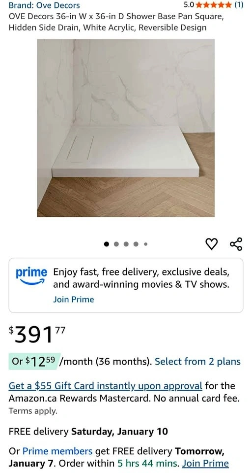 Brand New: OVE Decors® 36-in W x 36-in D Shower Base Pan Square, White Acrylic. Amazon Price = $ 390 + Taxes, asking only $180 (Brand New still in Box).