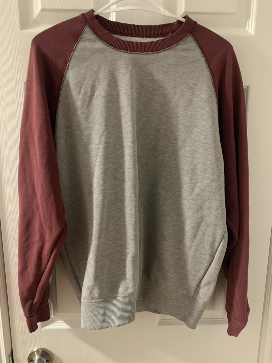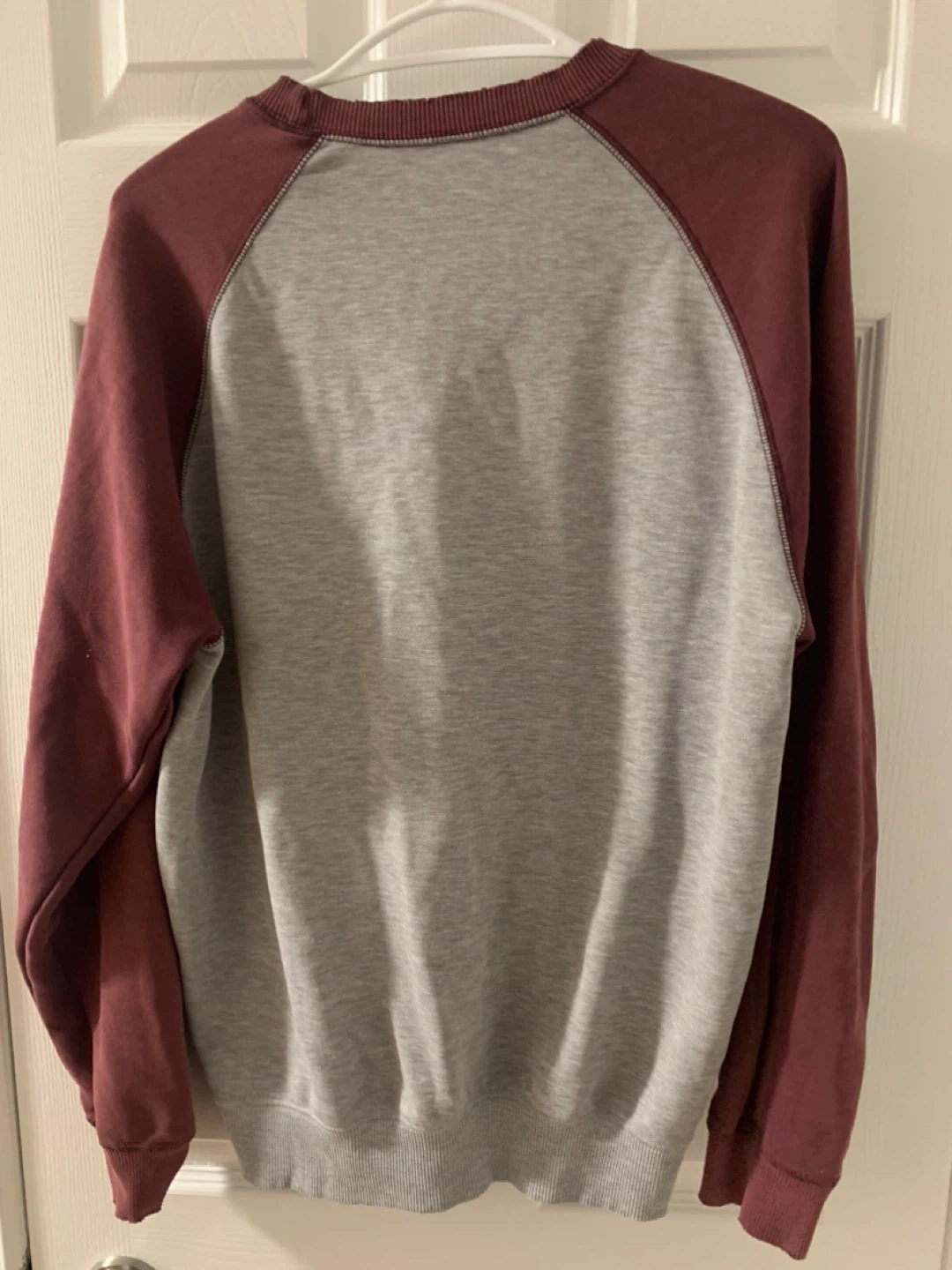 Crewneck sweatshirt with grey body and burgundy sleeves. It's in great condition and ready for a new owner! Perfect for staying cozy on chilly days