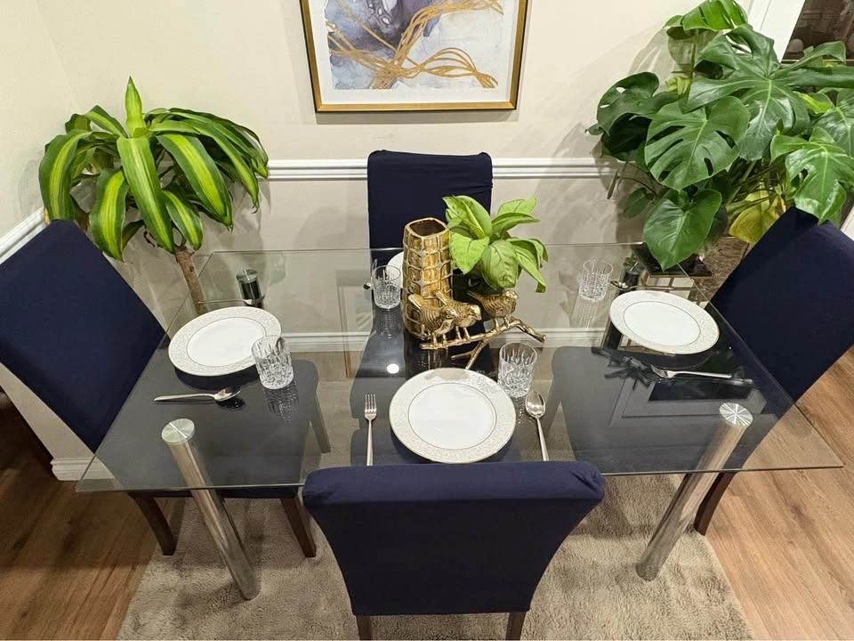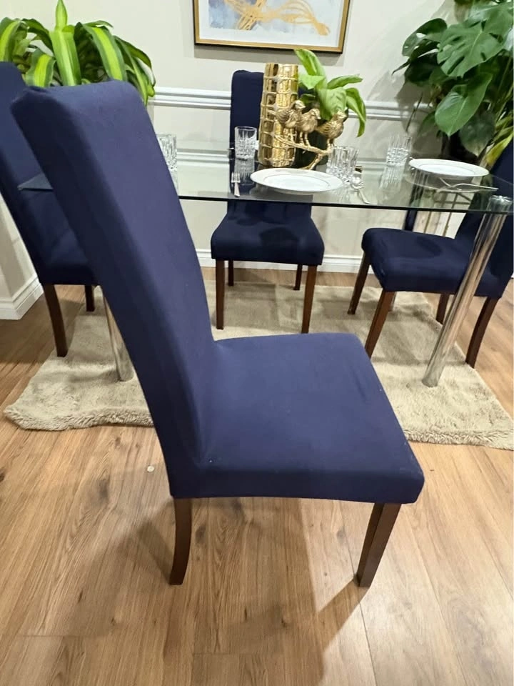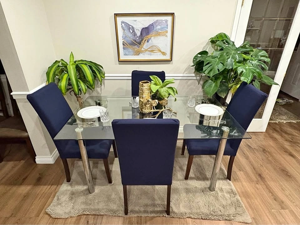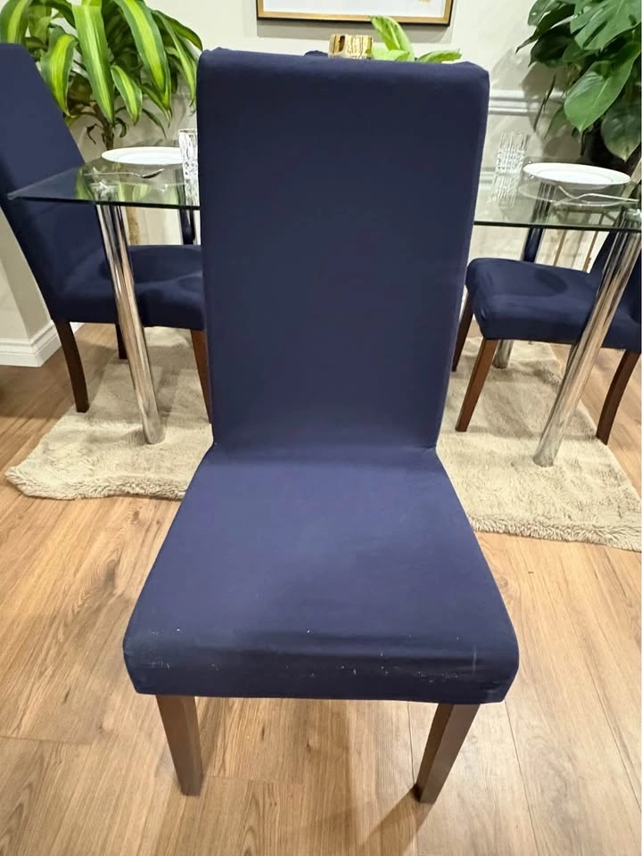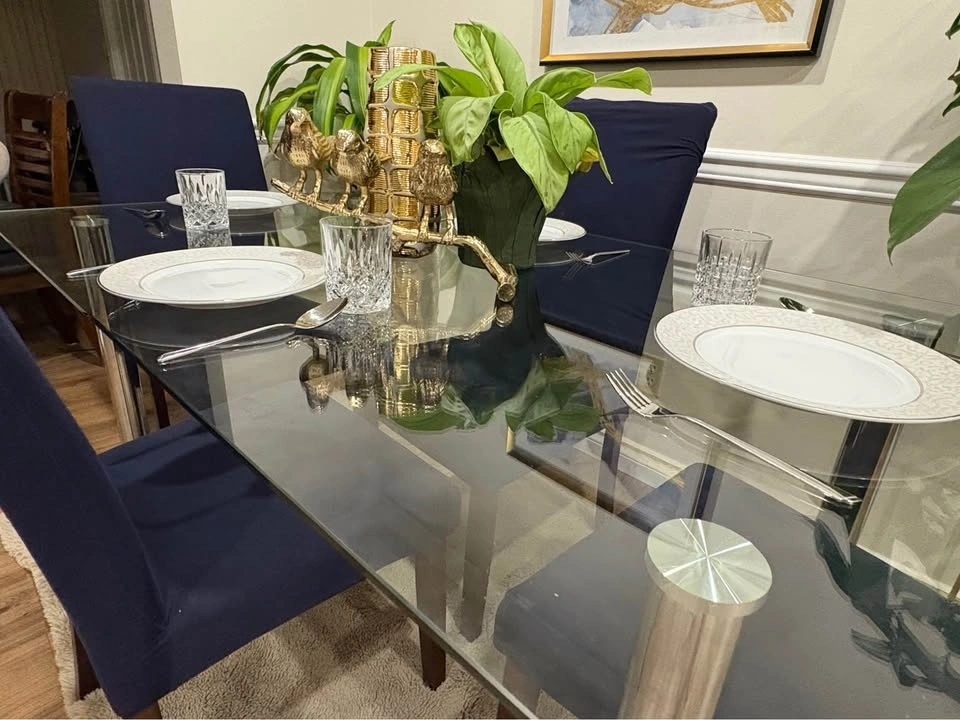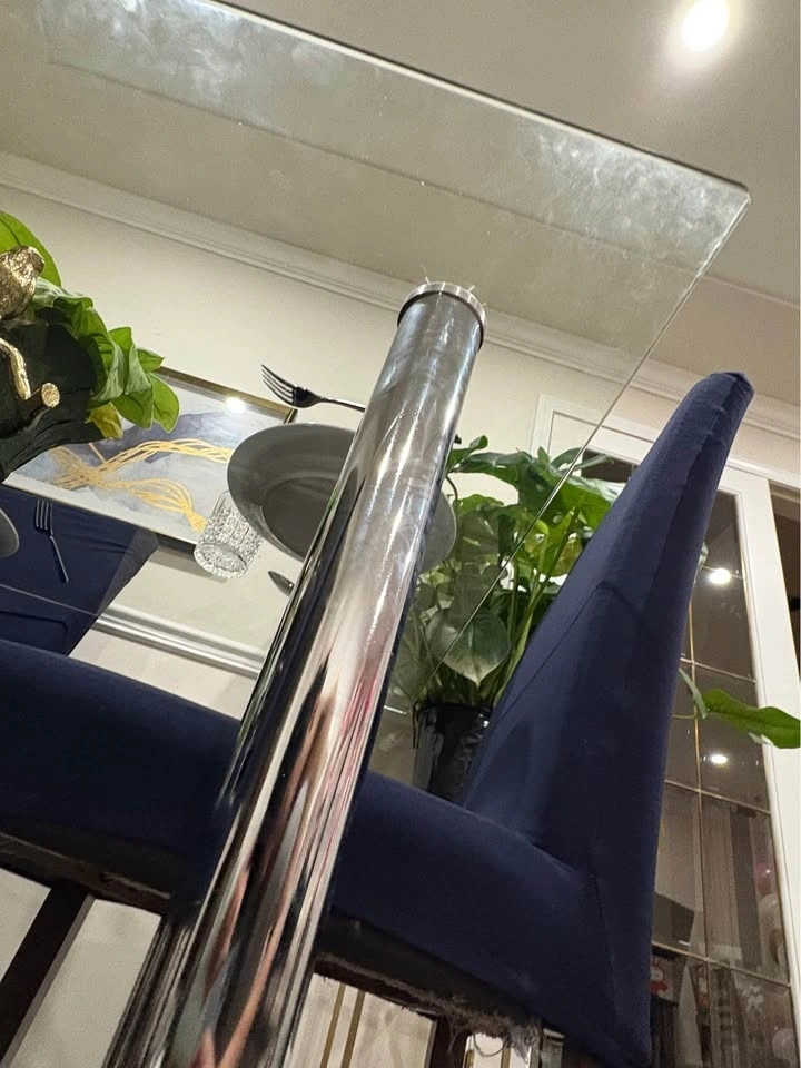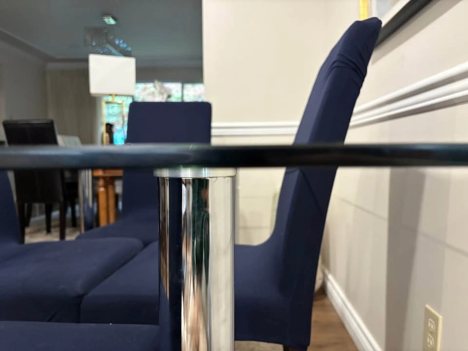 Modern glass dining table with 4 matching upholstered dining chairs. Chrome/metal legs. The rectangular tabletop is tempered glass, 1/2" thick, very sturdy, and wobble-free. No cracks or chips in the glass. Clean and well kept. The glass top removes easily for safe transport. Discounted price due to minor scratches on the surface of the glass.