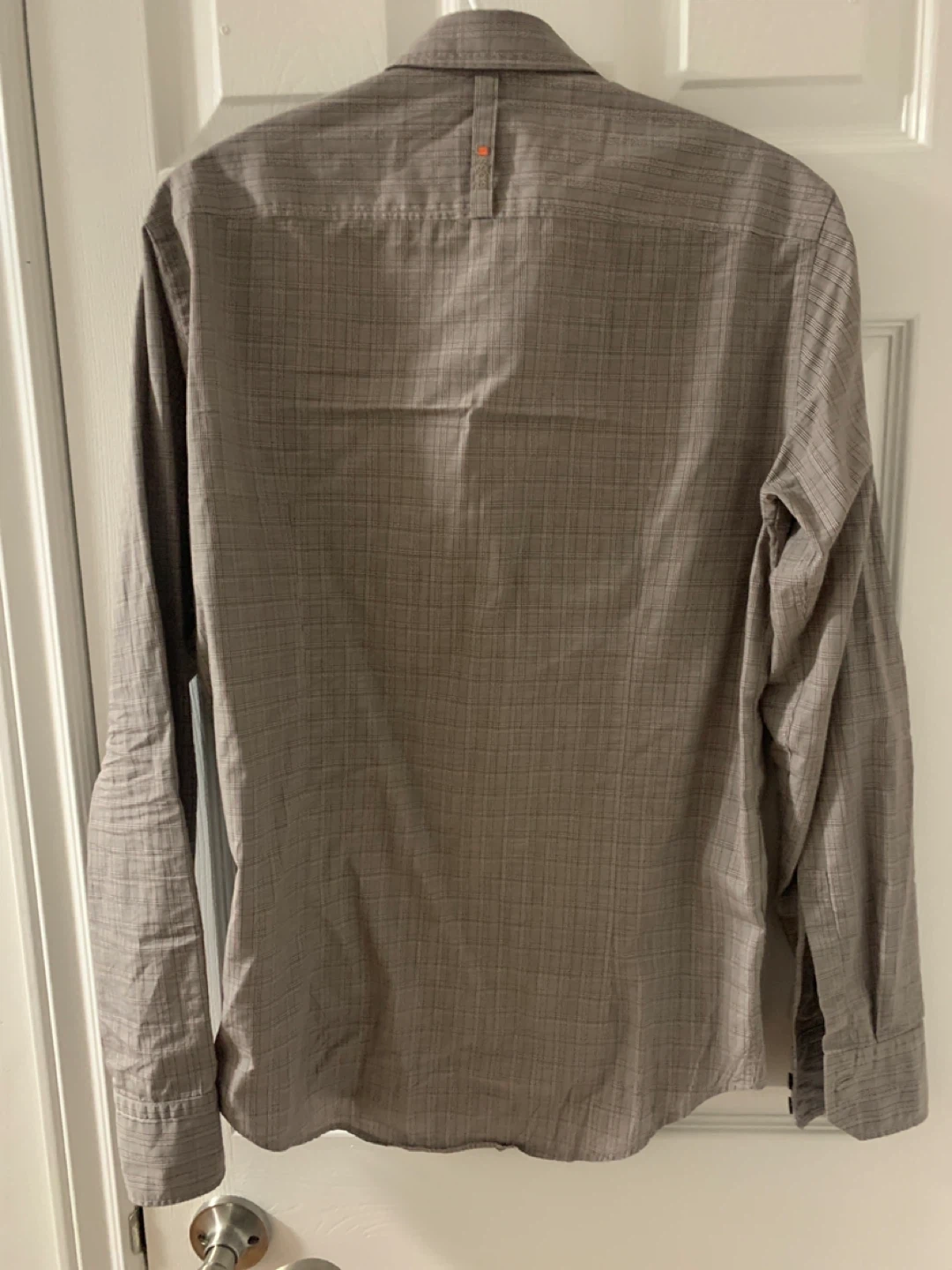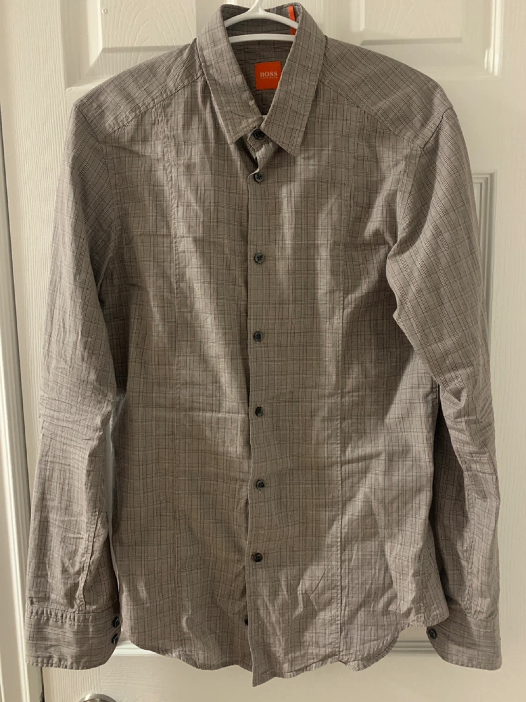 Looking to sell a BOSS men's long-sleeved button-down shirt. It features a subtle plaid pattern and is in great condition. Perfect for a smart casual look!