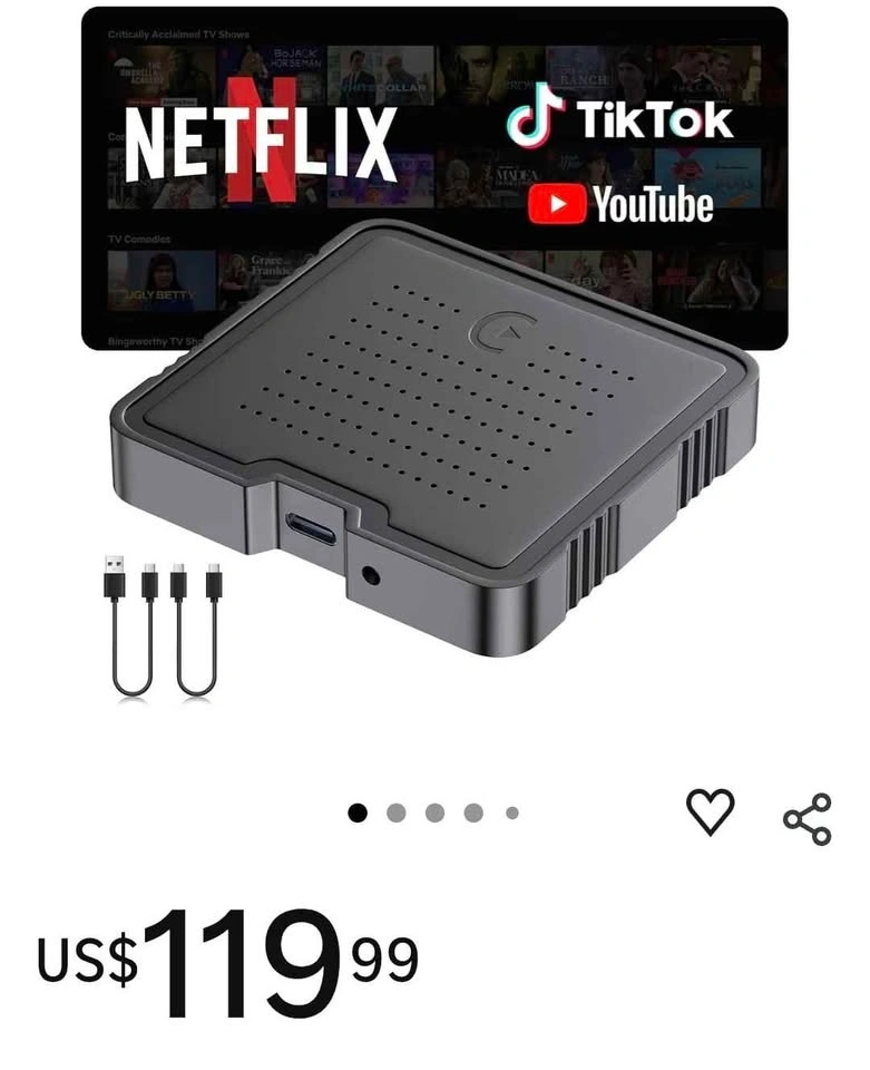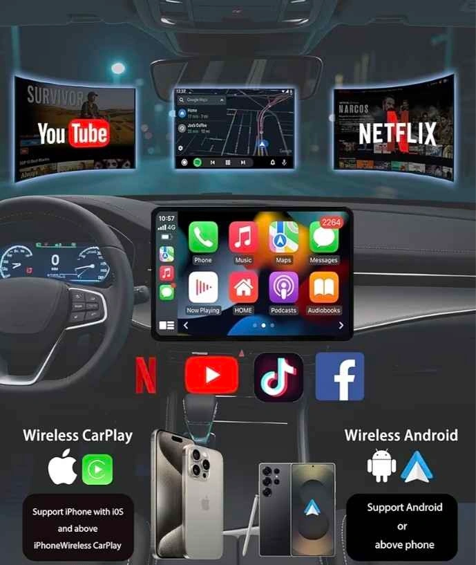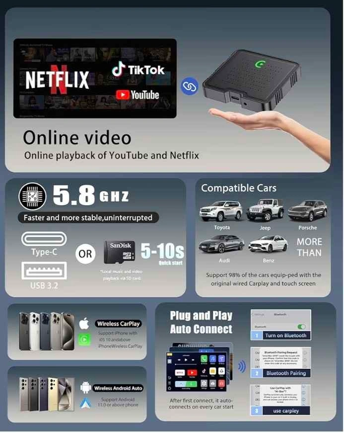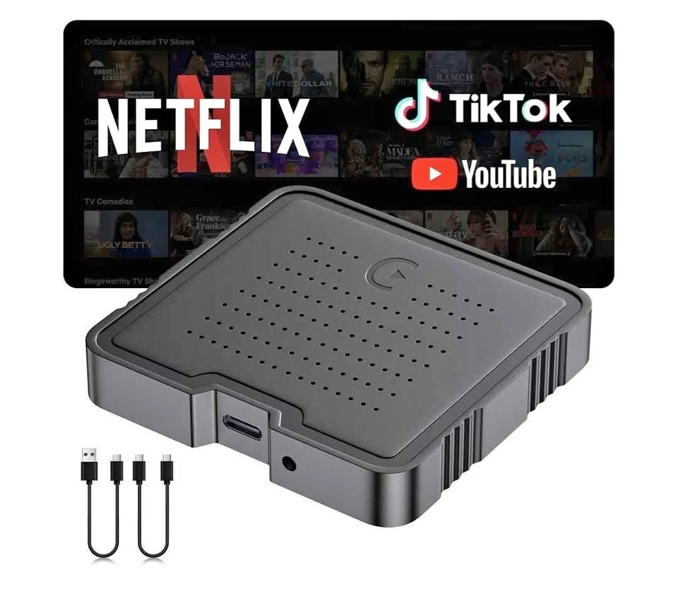 Adaptador Inalámbrico CarPlay 2025 Caja Inteligente AI para iPhone y Android Auto | Caja de Entretenimiento de Vídeo de Transmisión con Soporte para TikTok, Netflix, YouTube, Tarjeta TF |
