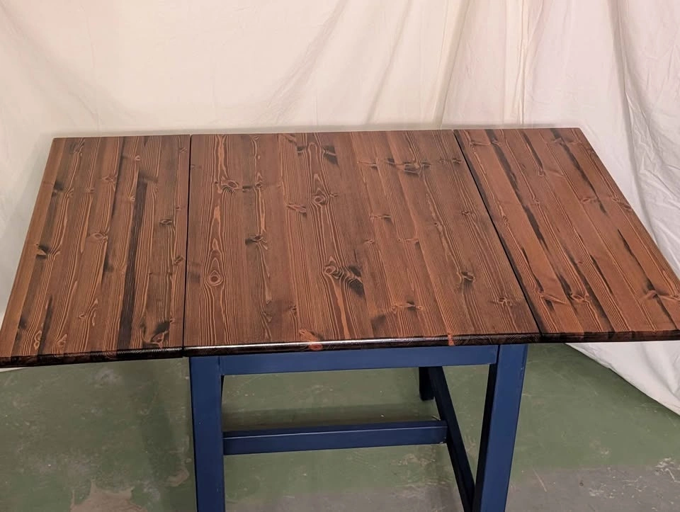 Custom Finish: The top is stained in a rich dark walnut to showcase the wood grain, sealed for durability. The base is painted in a deep "Nautical Blue" for a modern coastal/farmhouse look.