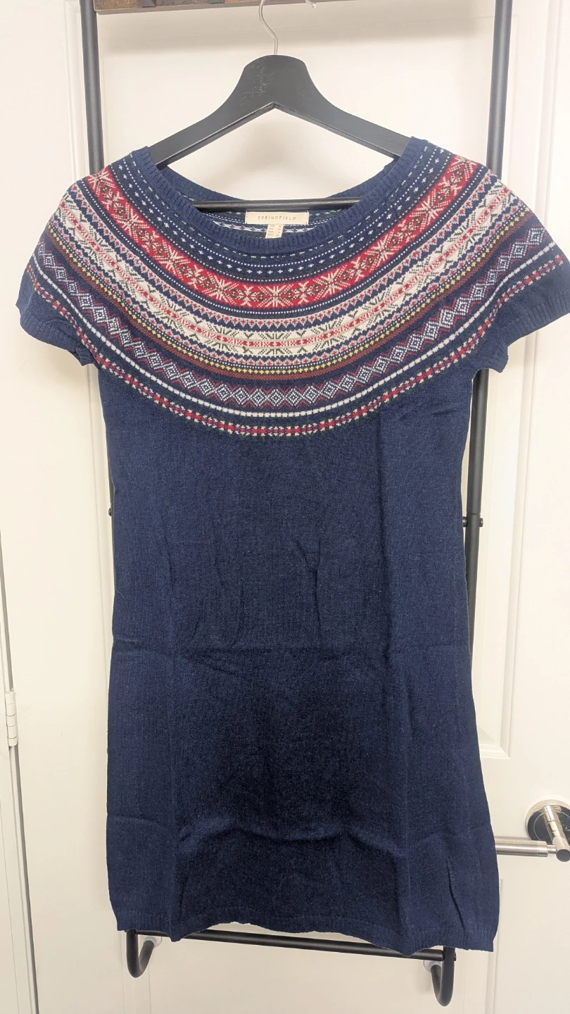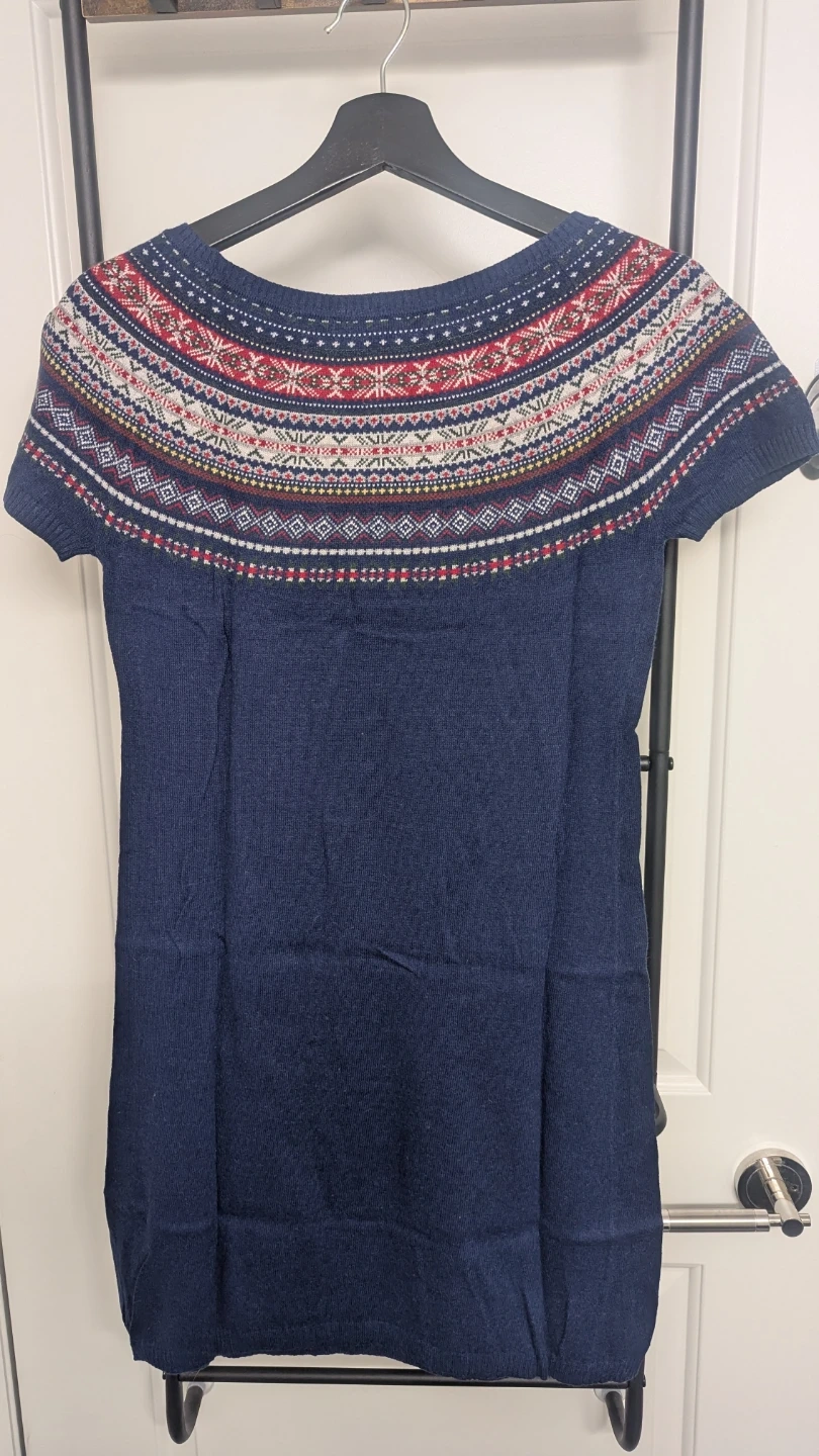 Cute Springfield knit dress in a lovely shade of blue! It features a unique patterned design around the neckline and is a size 4. Perfect for adding a touch of style to your wardrobe.