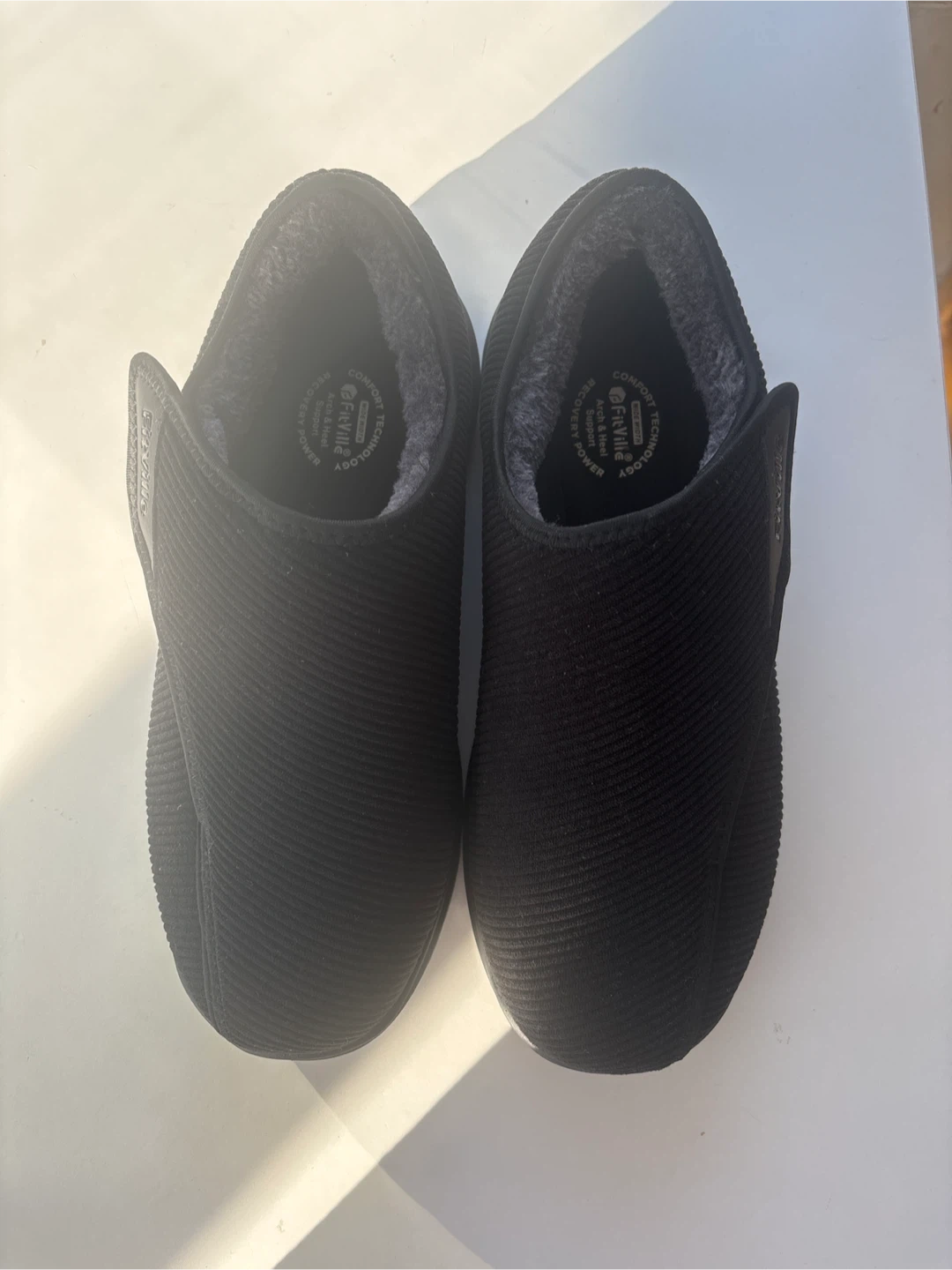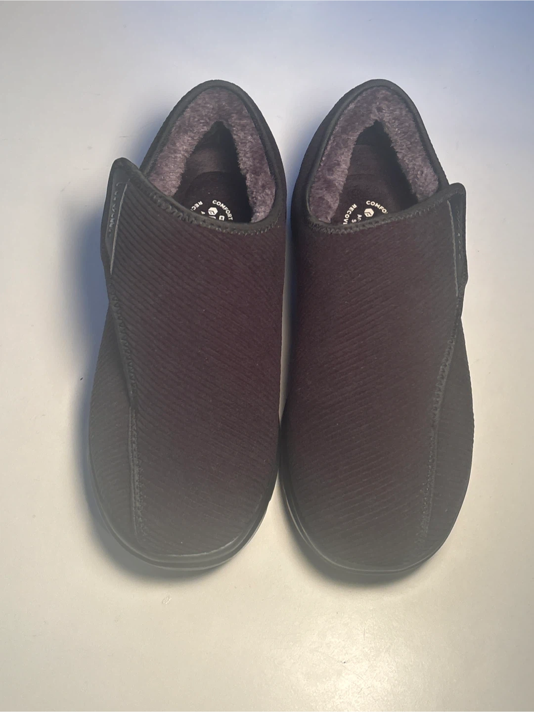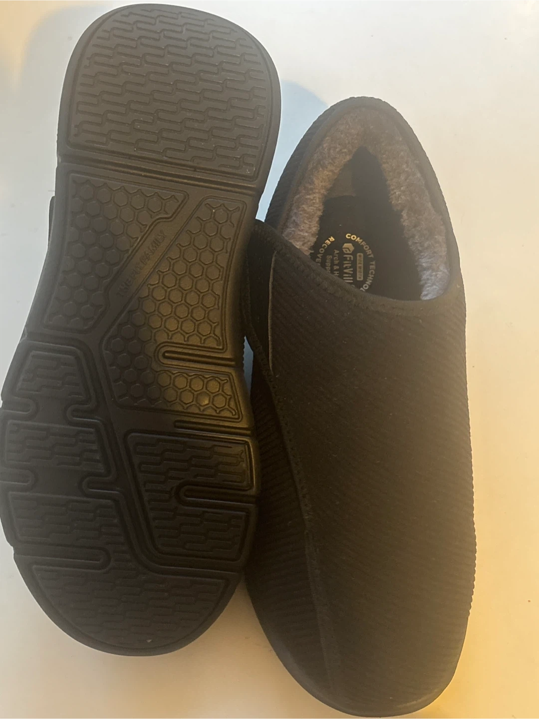 Cozy FitVille slippers with arch and heel support. These are a men's size 11W (US). They feature a comfort technology wide width design. Great for recovery and everyday wear!