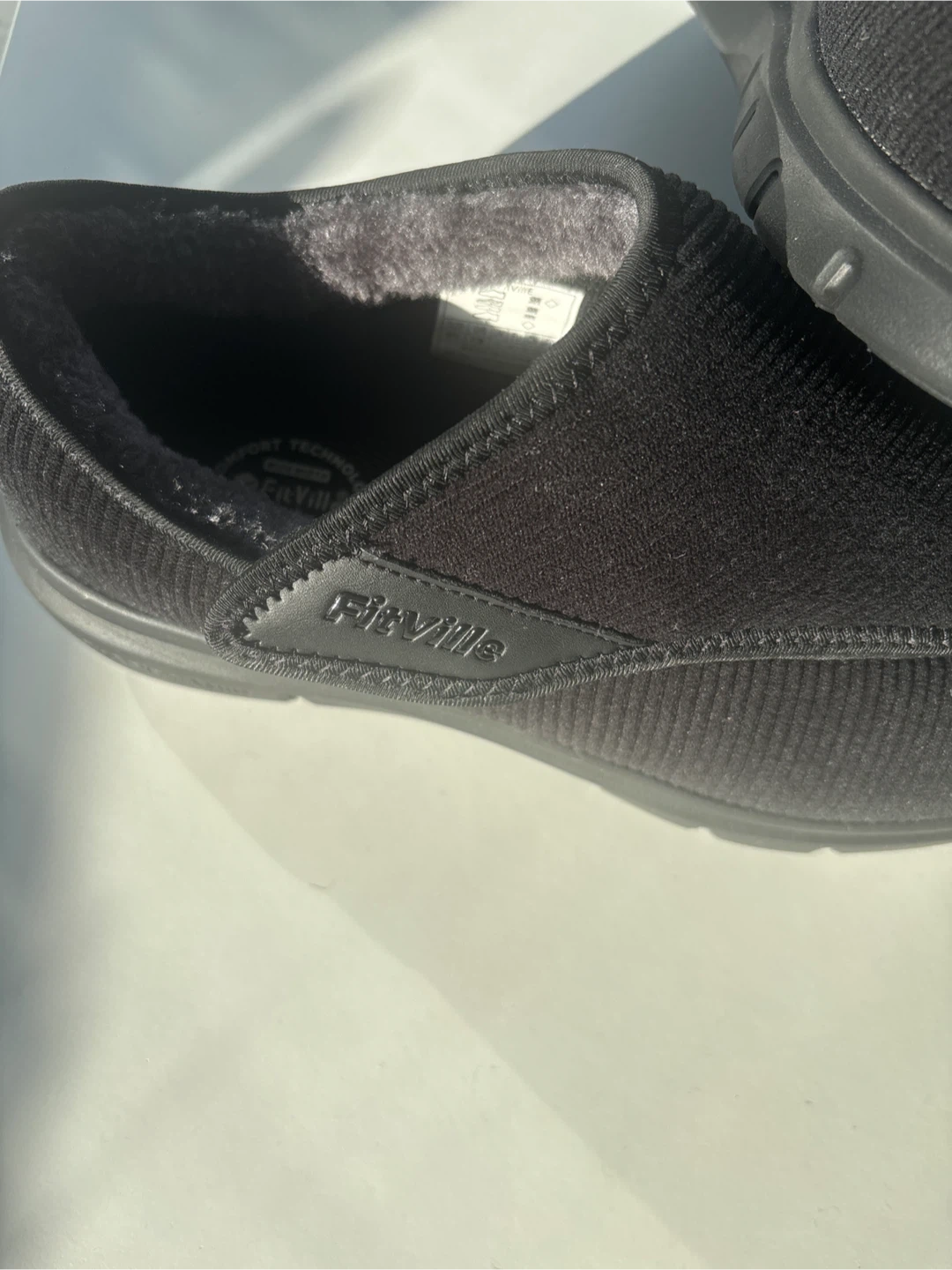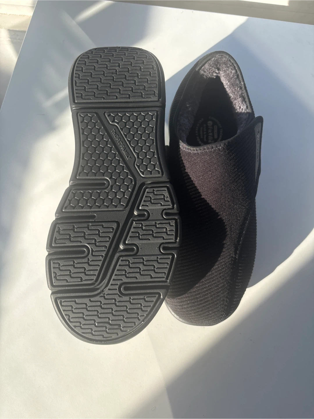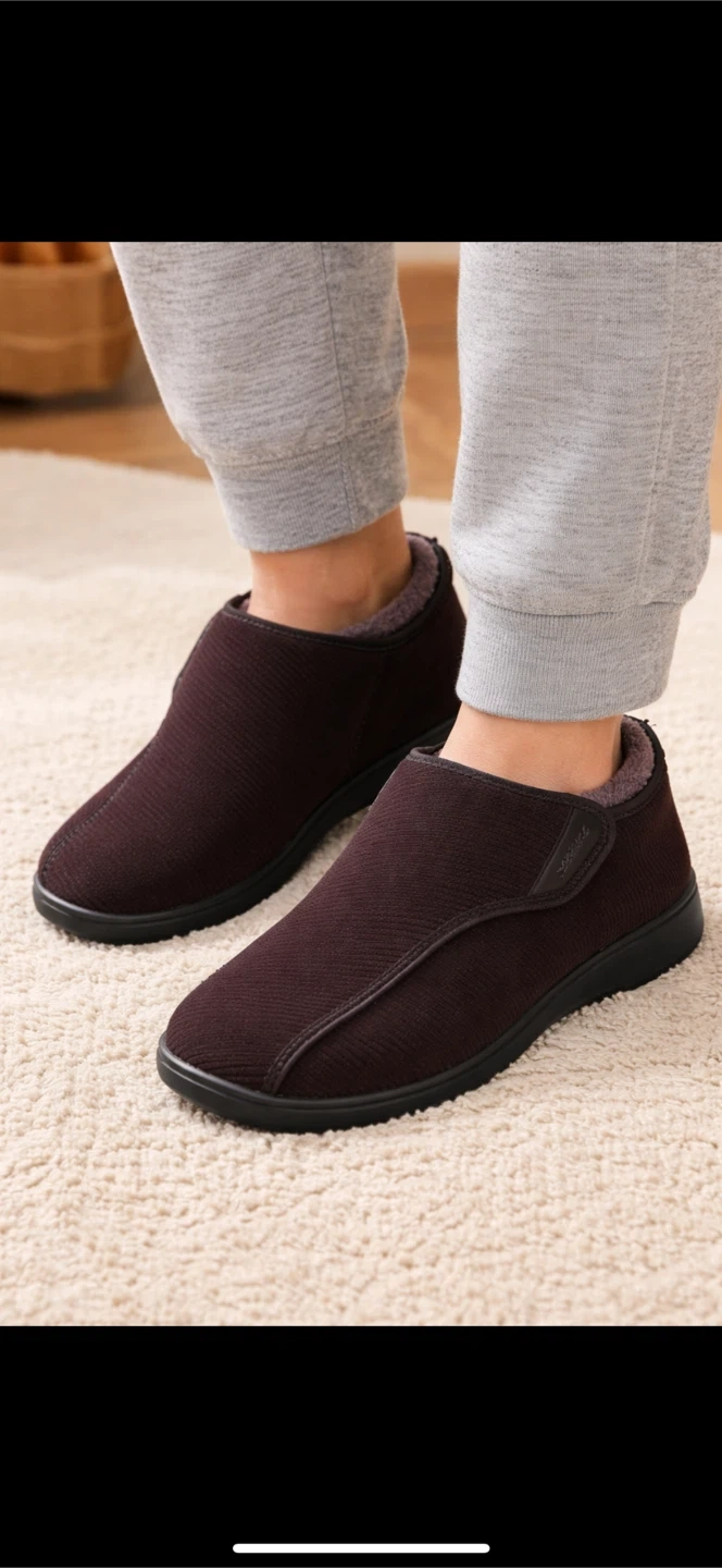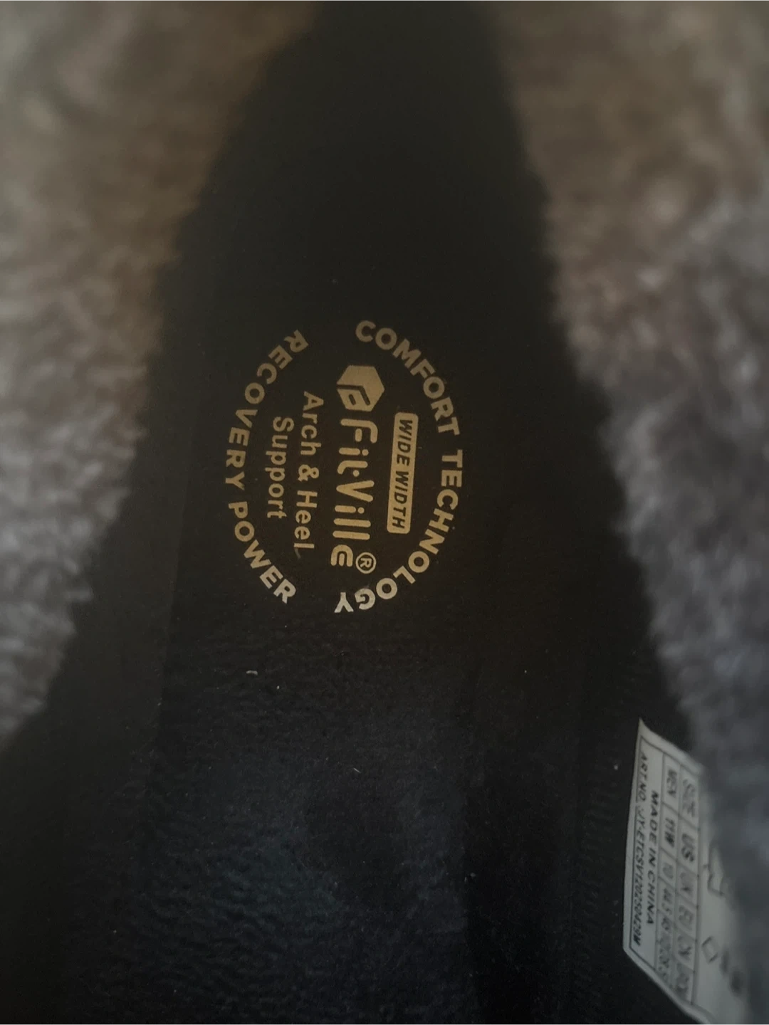 Cozy FitVille slippers with arch and heel support. These are a men's size 11W (US). They feature a comfort technology wide width design. Great for recovery and everyday wear!