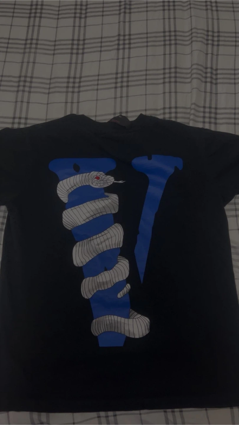 Selling a VLONE black t-shirt with the iconic snake logo. It's in great condition and ready for a new home! The shirt features a large 'V' with a snake wrapped around it, along with the VLONE logo on the back. Perfect for fans of streetwear and unique designs