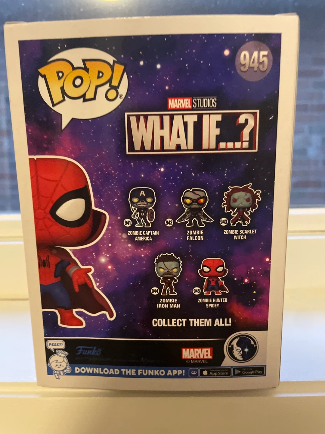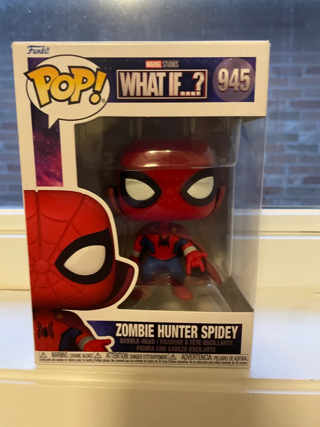 Selling a Funko Pop! figure of Zombie Hunter Spidey from the Marvel What If...? series. This is figure #945. It comes in the original box, ready for a new collector!