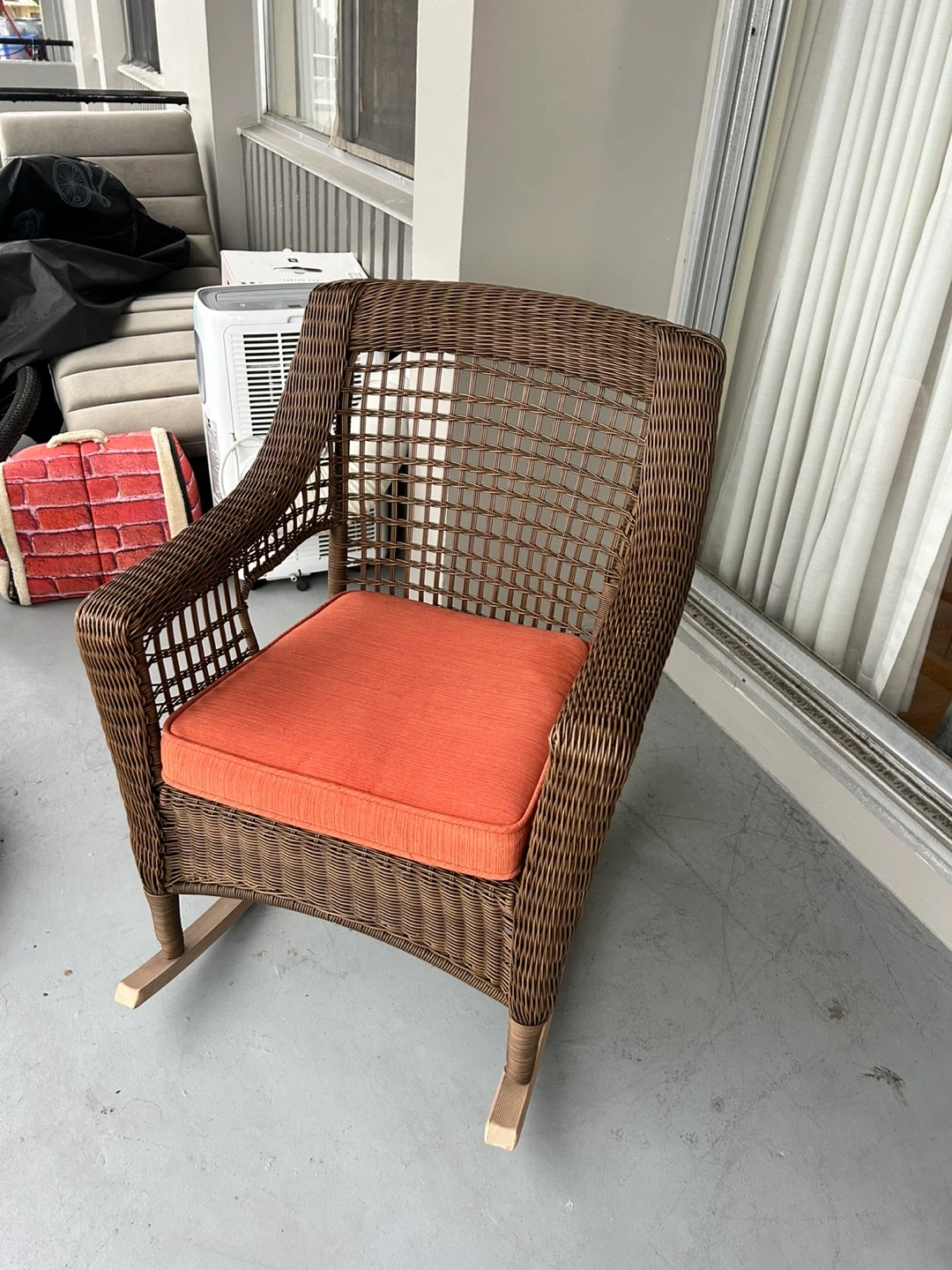 Here's a comfy wicker rocking chair with a bright orange cushion! It's perfect for relaxing on the porch or in the sunroom. The chair is in good condition and ready for a new home