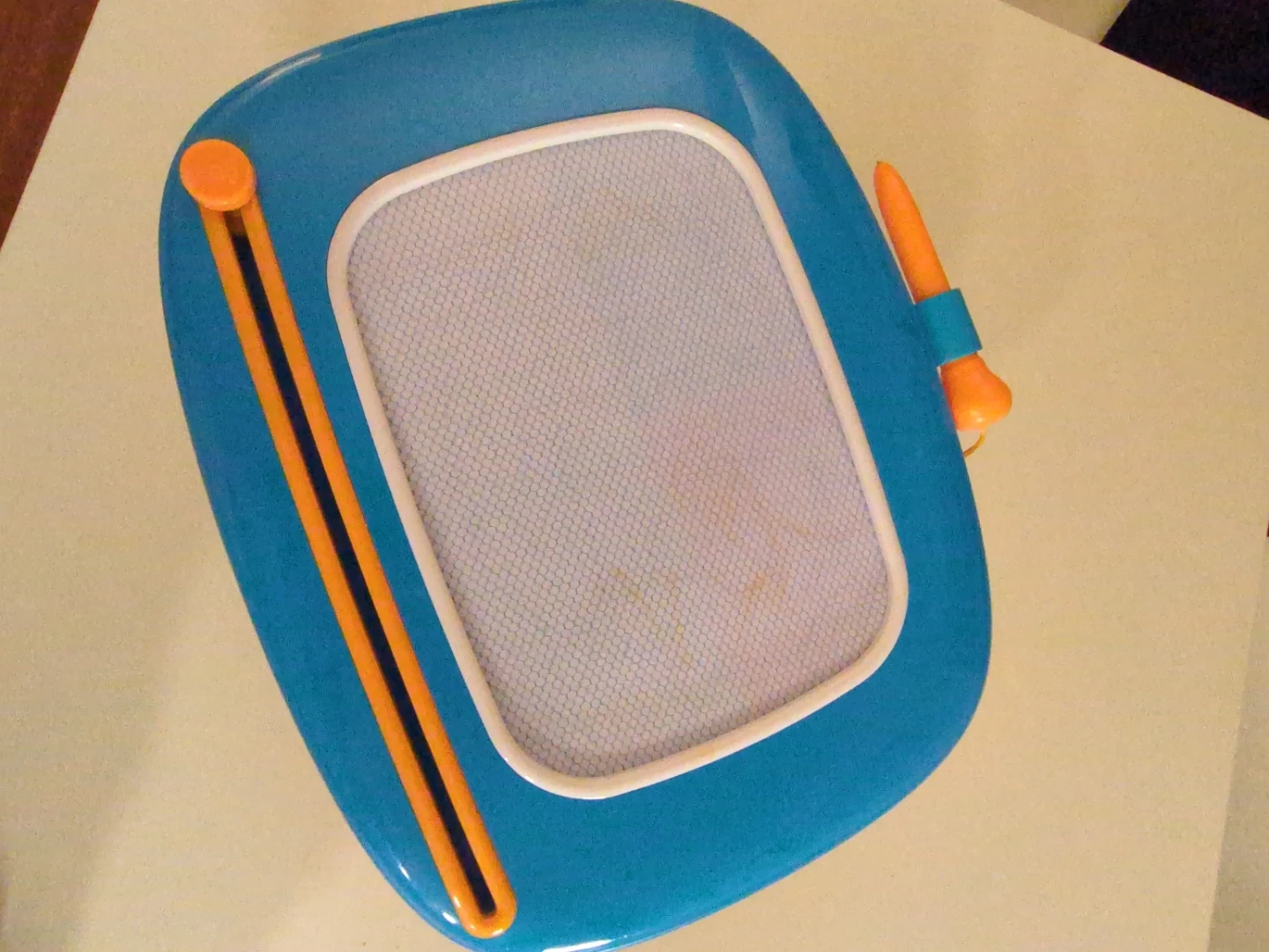 - a blue drawing board with an orange stylus and legs
