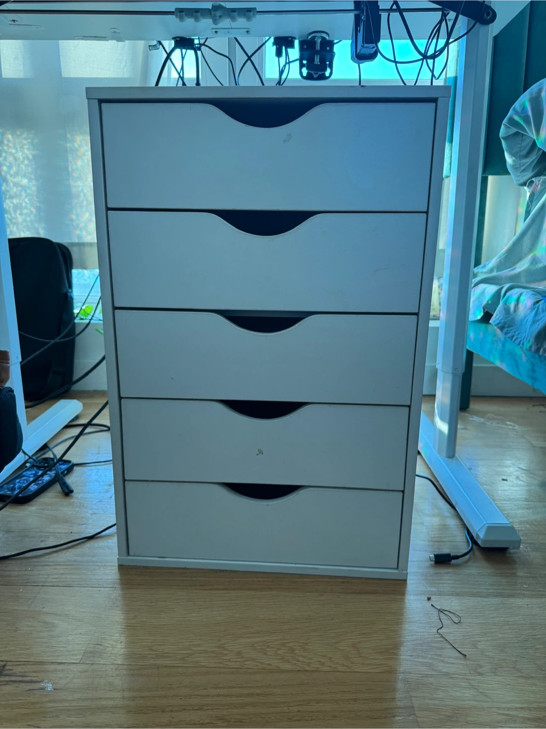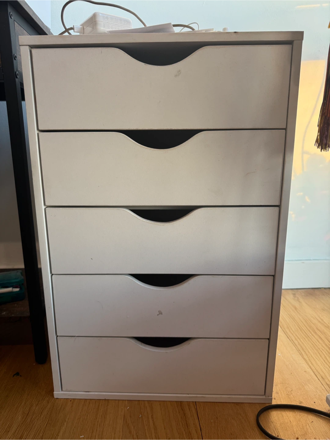 Selling a white IKEA Alex drawer unit! It has 5 drawers and is in good condition. Perfect for organizing your desk or workspace. It's a great storage solution!