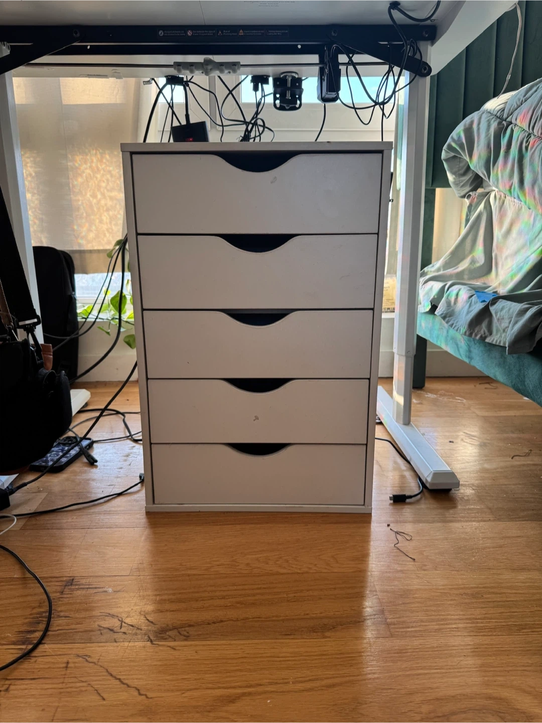 Selling a white IKEA Alex drawer unit! It has 5 drawers and is in good condition. Perfect for organizing your desk or workspace. It's a great storage solution!