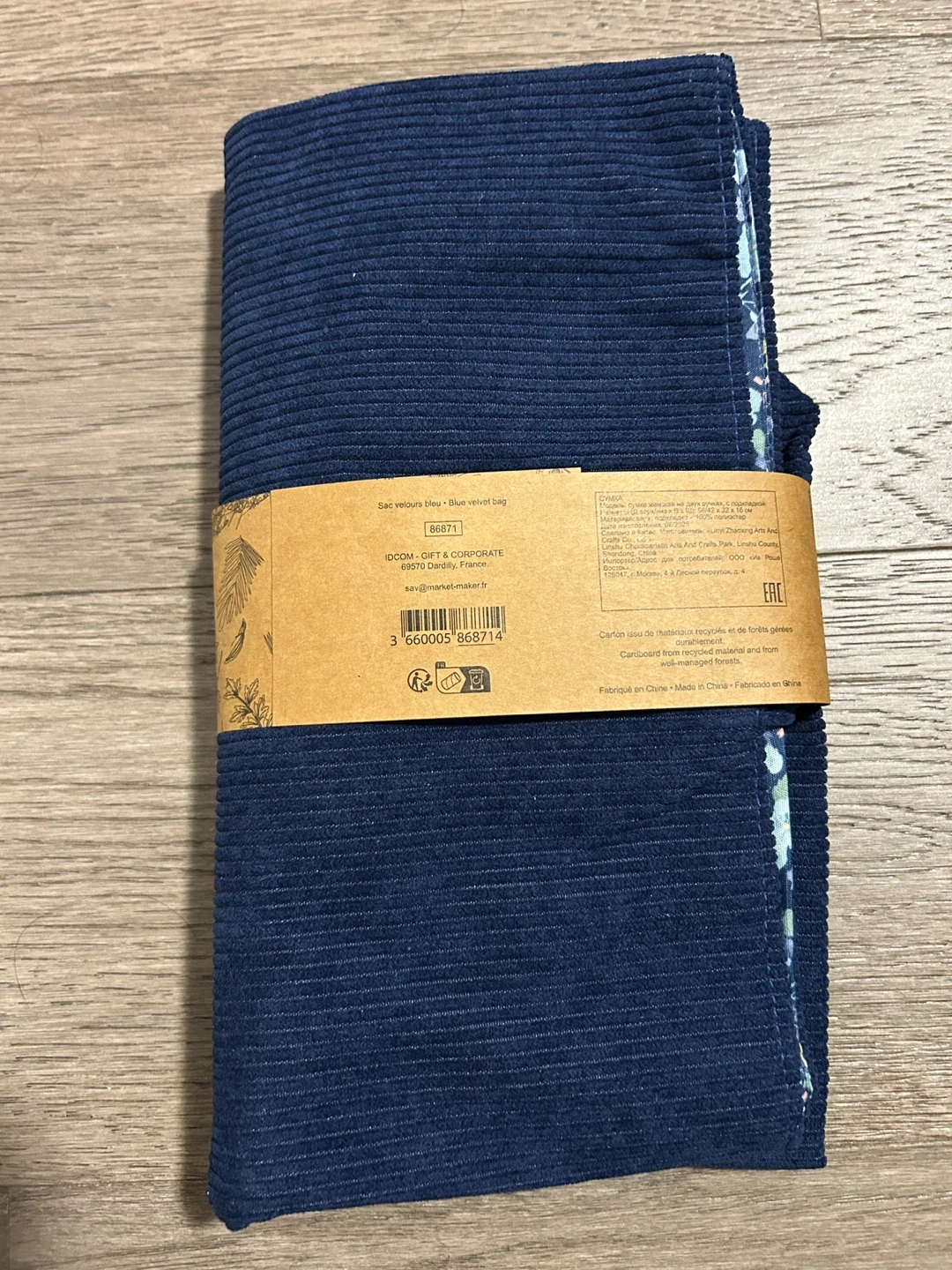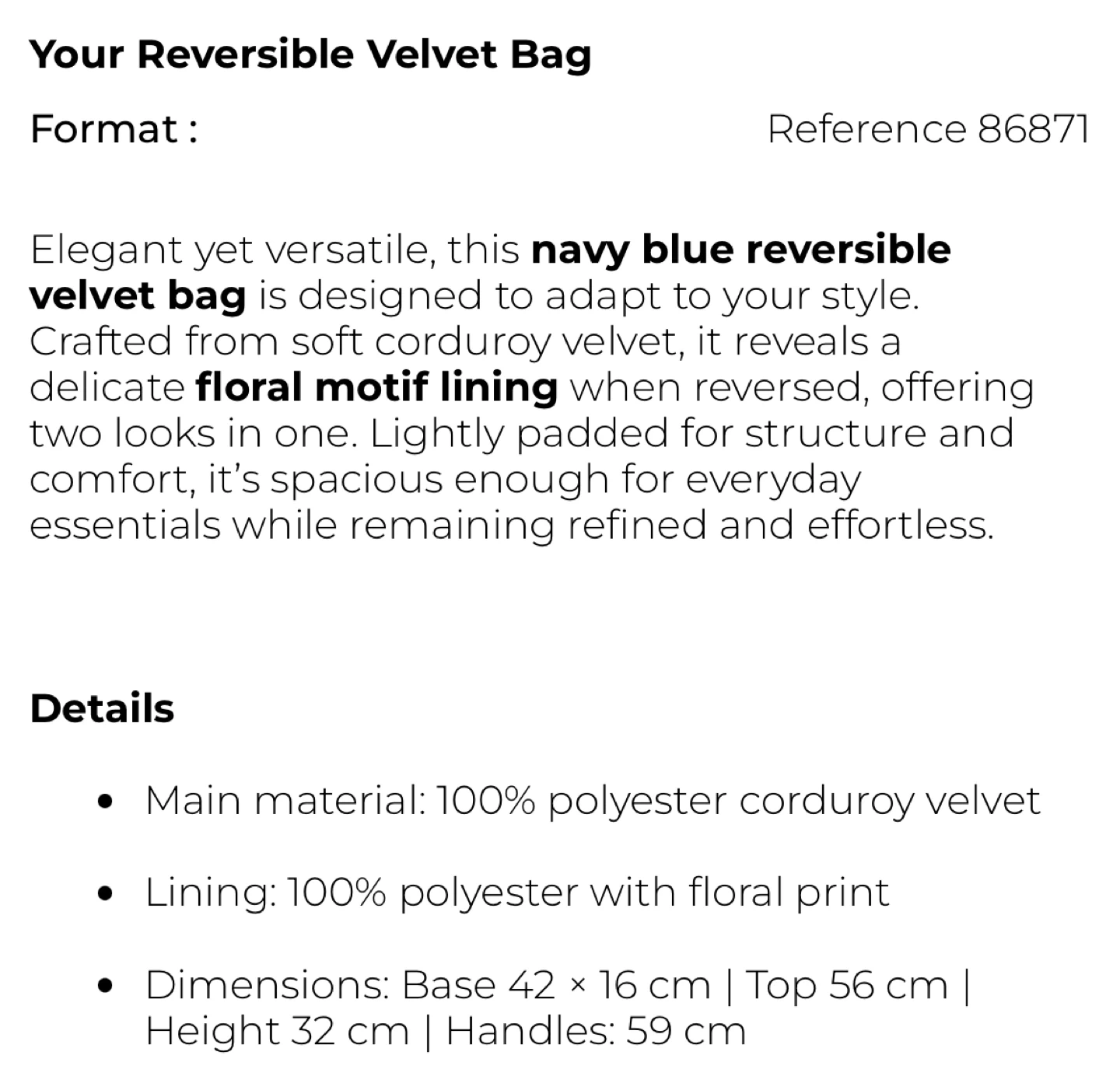 This navy blue reversible velvet bag is designed to adapt to your style. It's crafted from soft corduroy velvet and features a delicate floral motif lining when reversed, offering two looks in one. It’s spacious enough for everyday essentials while remaining refined and effortless.