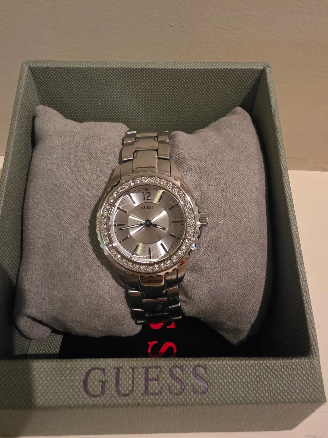 Selling a beautiful Guess women's watch in silver tone. It features a crystal-accented bezel and a sleek design. Making it a perfect gift or treat for yourself