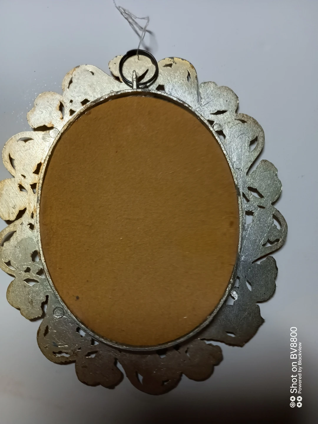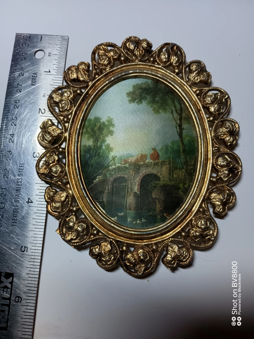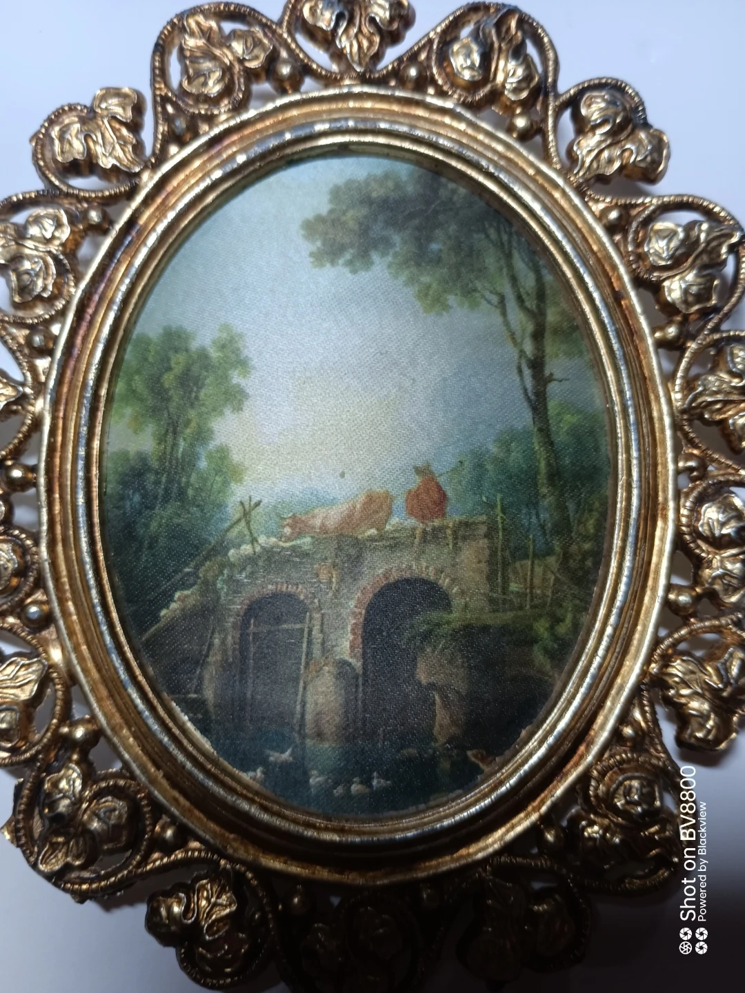 Selling a vintage oval framed print. It features a detailed, ornate gold-tone frame. The print itself depicts a pastoral scene with figures on a bridge. A charming piece to add a touch of classic art to your home decor