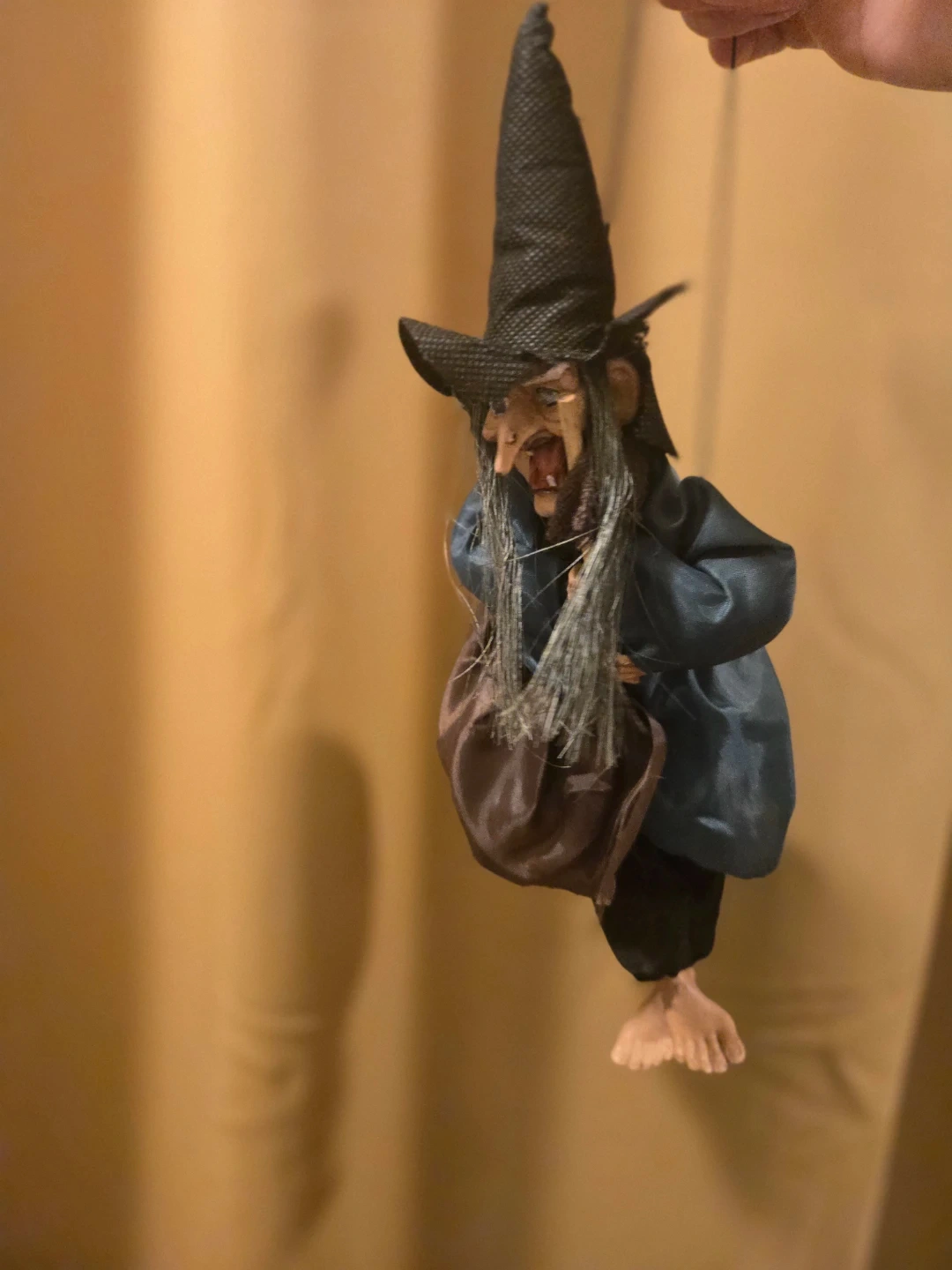 Selling a hanging witch decoration. This spooky little witch is ready to add some charm to your Halloween decor. She's wearing a black hat and blue coat, with a brown bag. Perfect for adding a touch of whimsy to your home this season