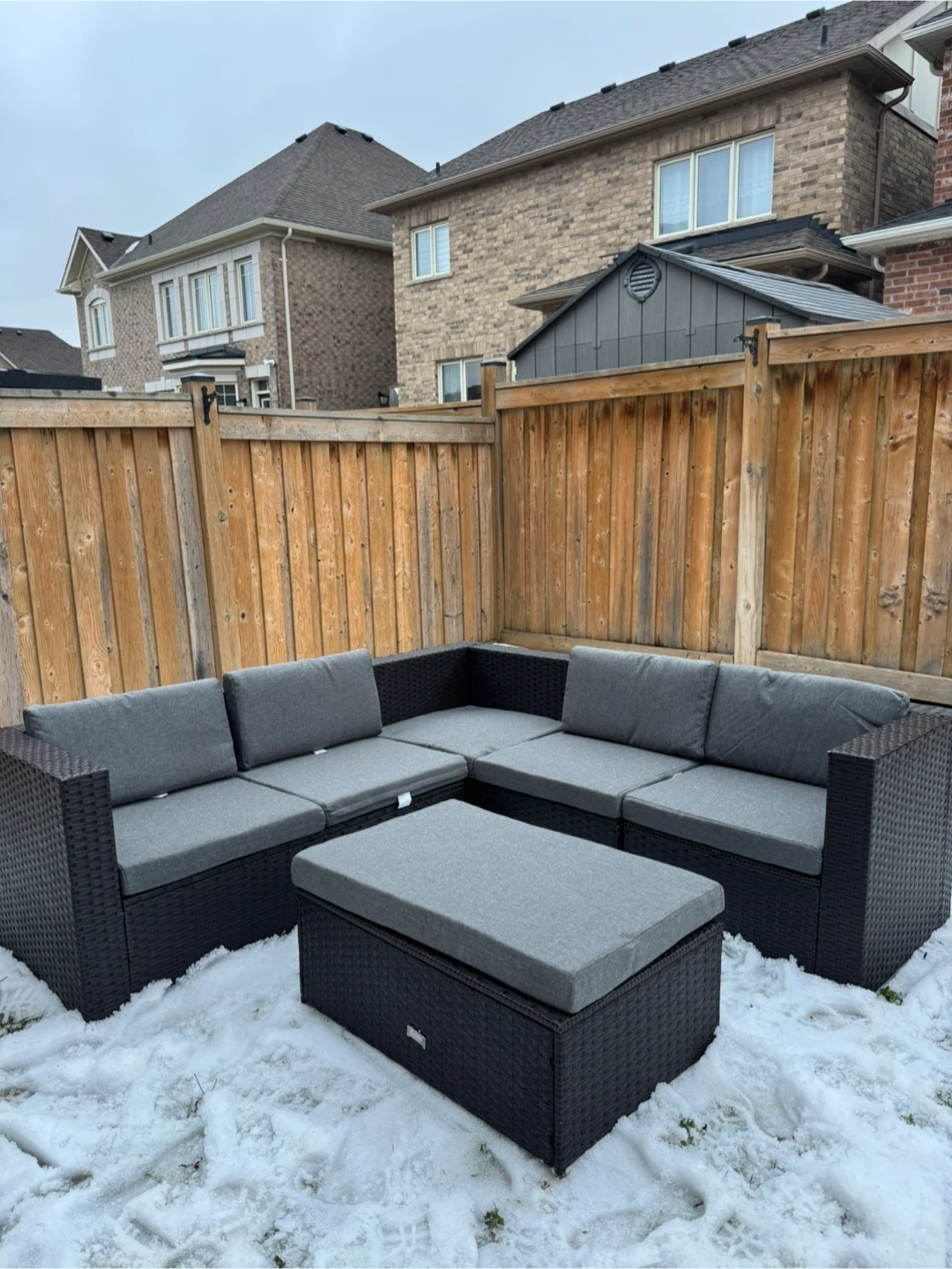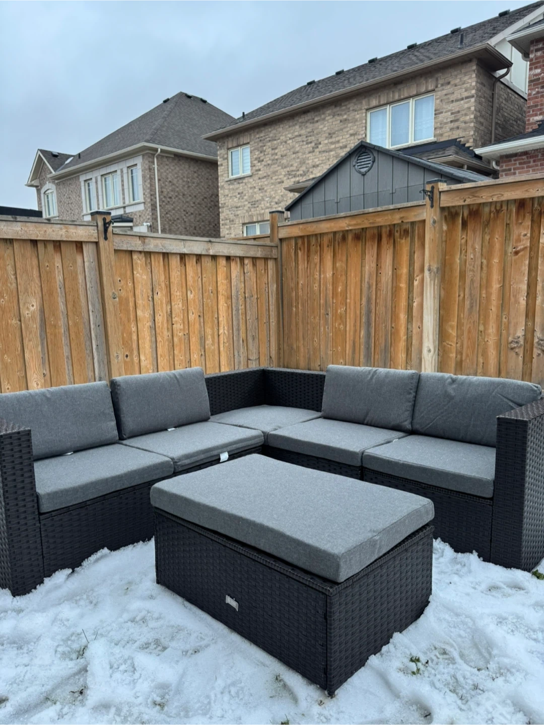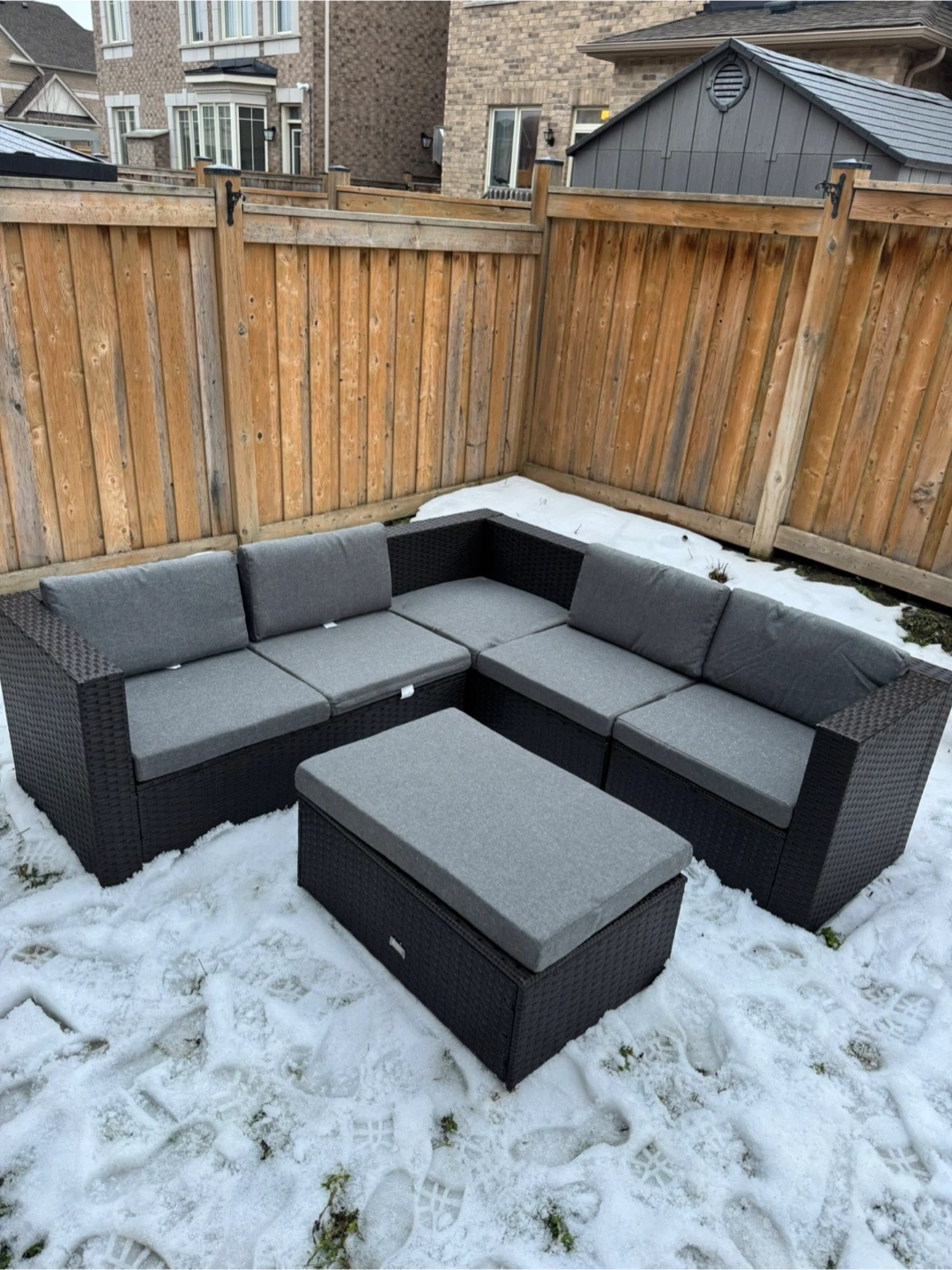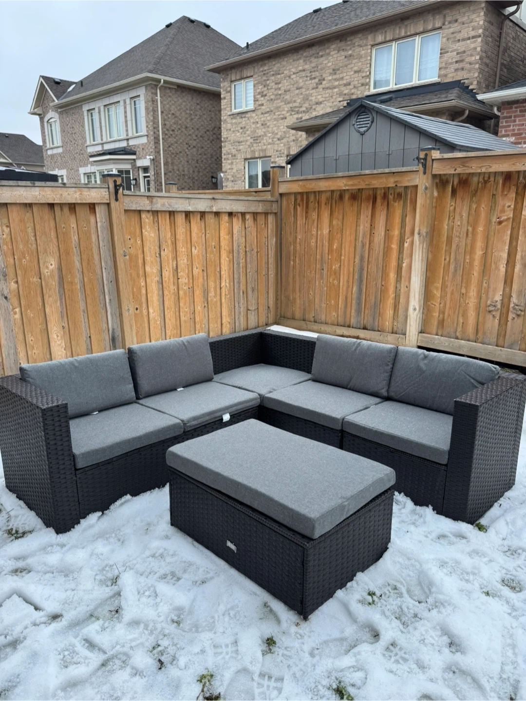 Here's an outdoor sectional sofa set with an ottoman for sale! Dark brown wicker frame and comfy gray cushions. It's in great condition and ready to be enjoyed!
