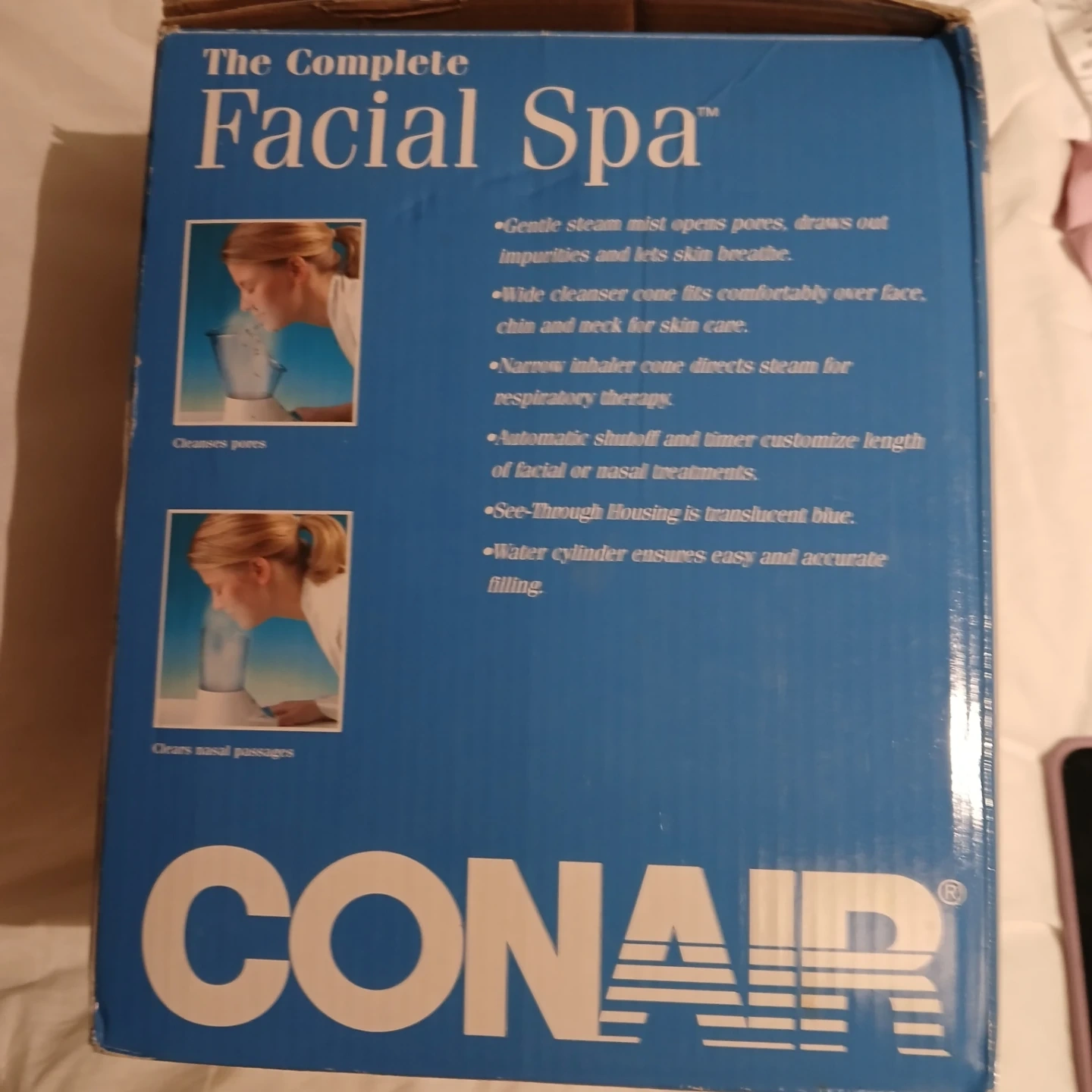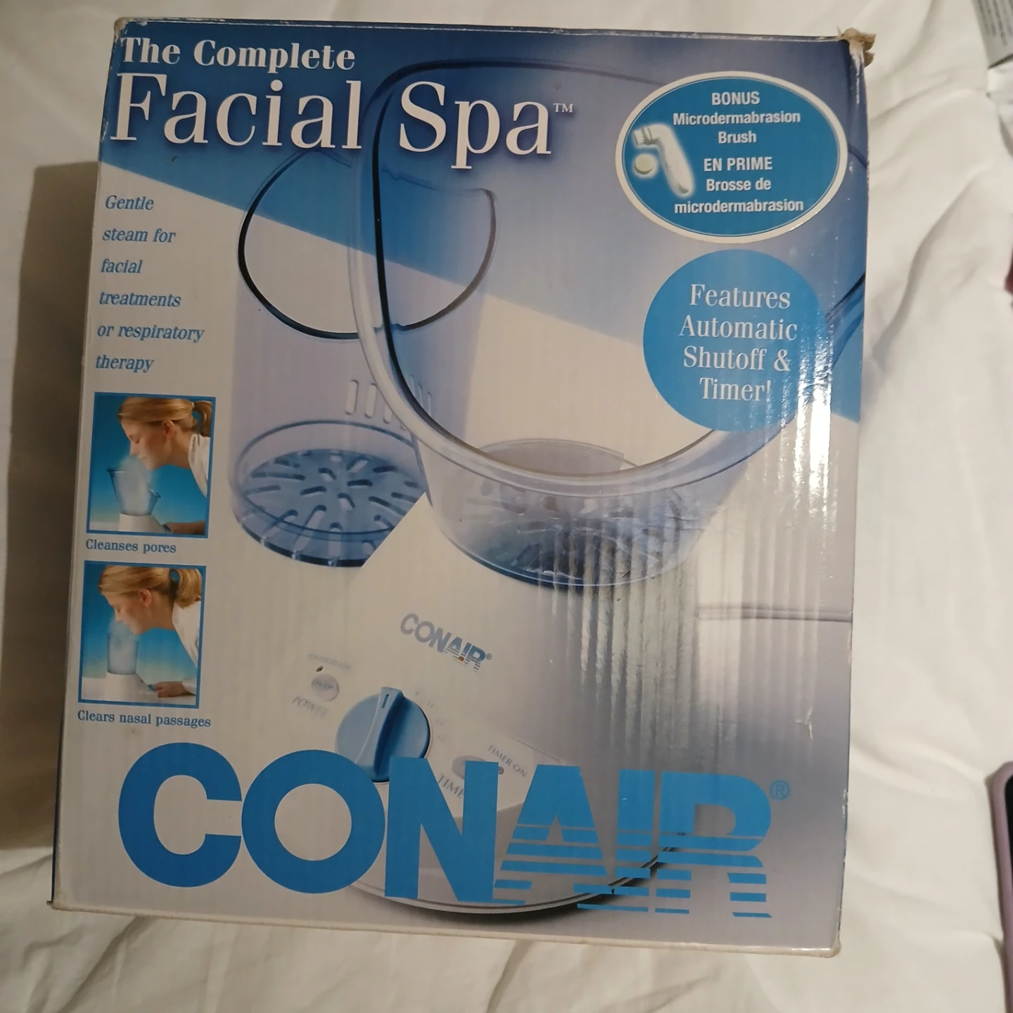 Selling a Conair Facial Spa. It features a gentle steam mist that opens pores and draws out impurities. It also has a wide cleanser cone that fits comfortably over the face, chin, and neck for skin care. The narrow inhaler cone directs steam for respiratory therapy. It also features automatic shutoff and a timer to customize the length of facial or nasal treatments. See-through housing is translucent blue. Water cylinder ensures easy and accurate filling. It also comes with a bonus microdermabrasion brush. The box is included