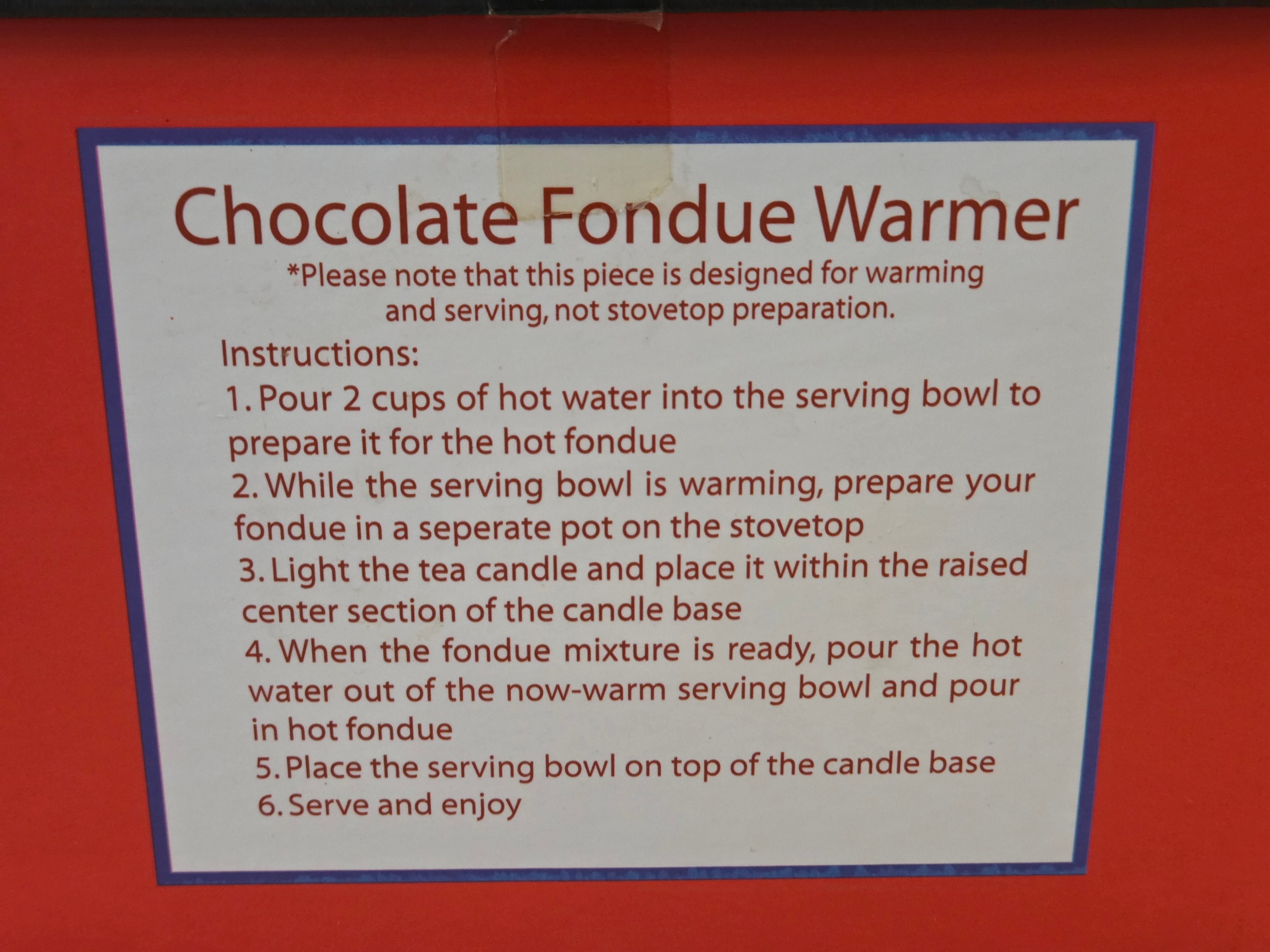– Use: designed for warming/serving only – pre-melt chocolate on the stovetop or microwave, then keep warm over a tealight.