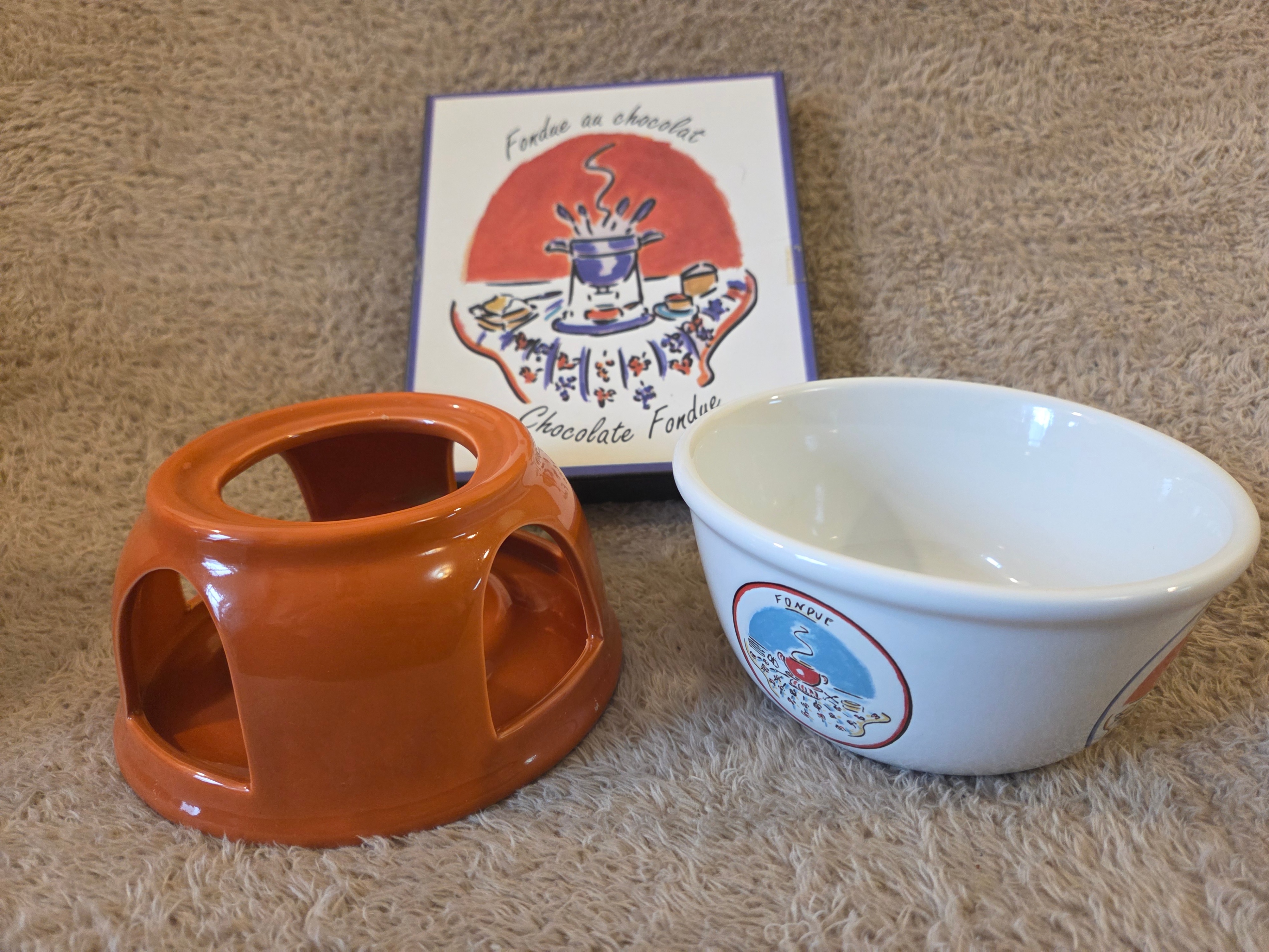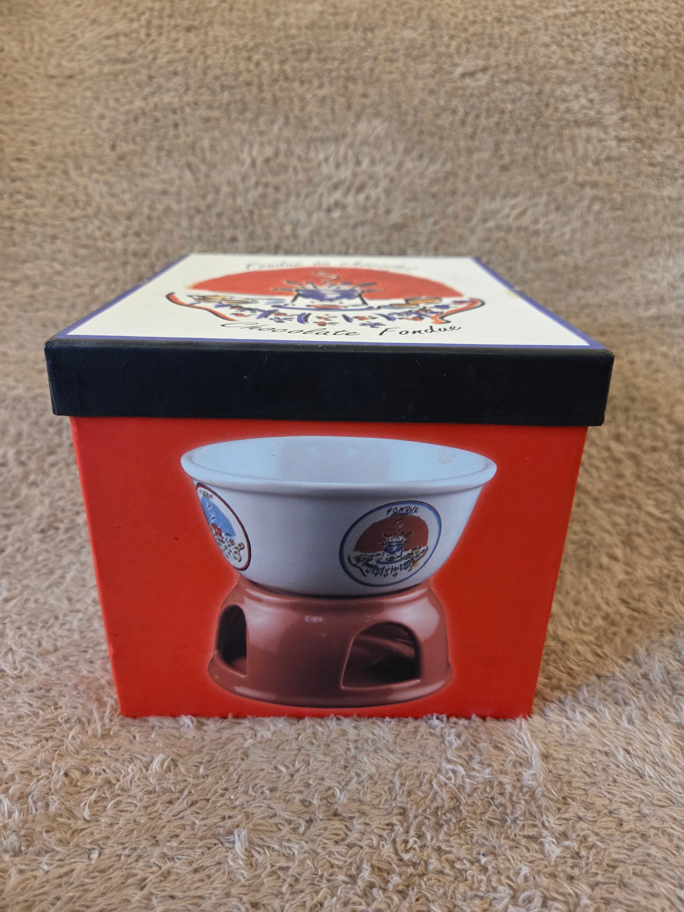 Compact ceramic chocolate fondue warmer by BIA Cordon Bleu. Two-piece design: a glazed stoneware bowl that sits on a candle base and keeps melted chocolate warm with a standard tealight. Original box and instruction card included.