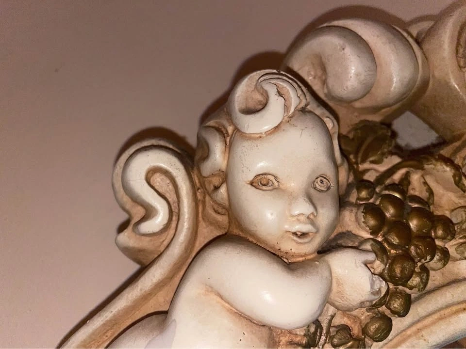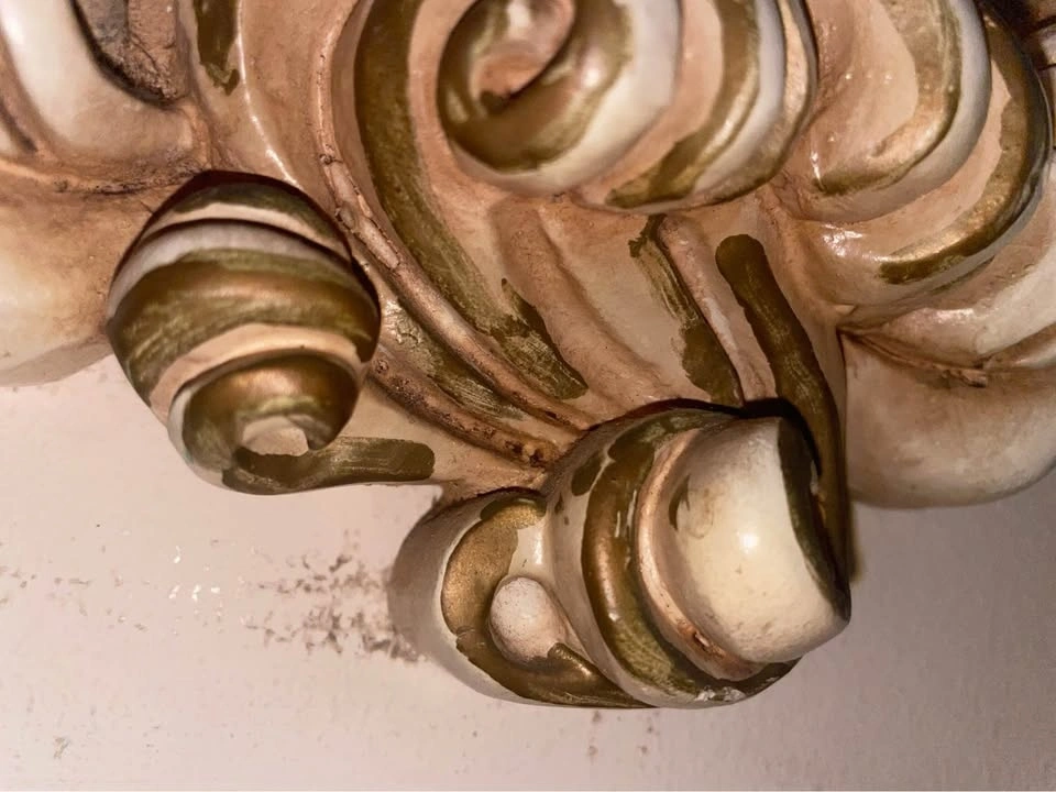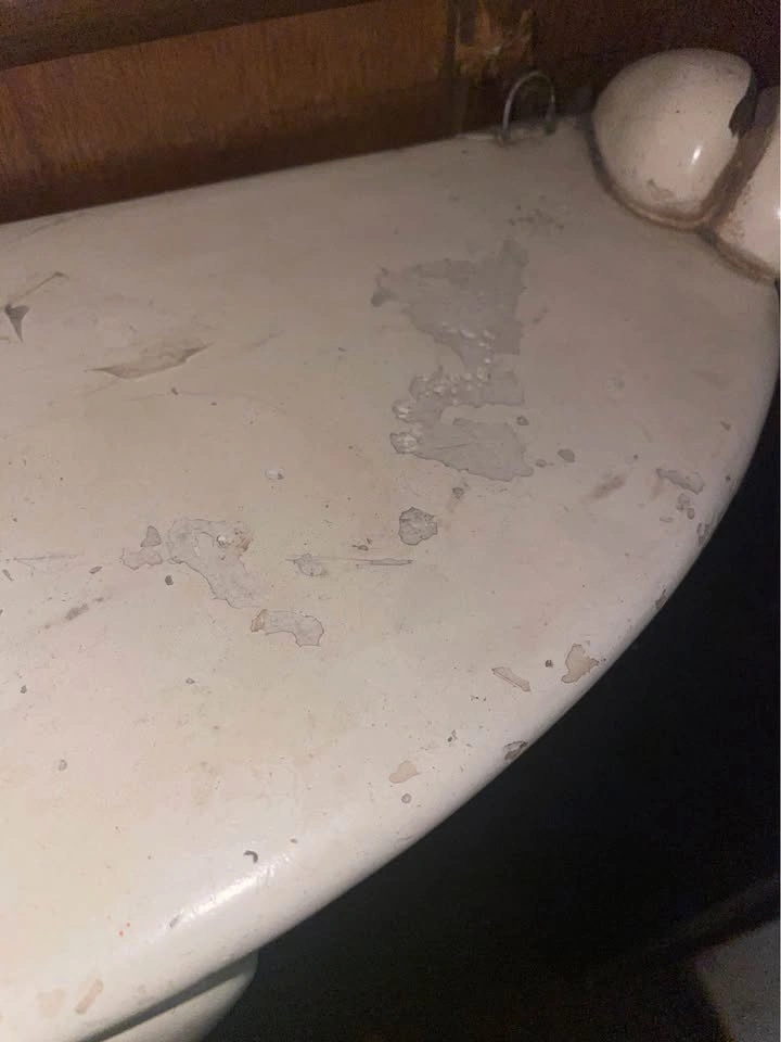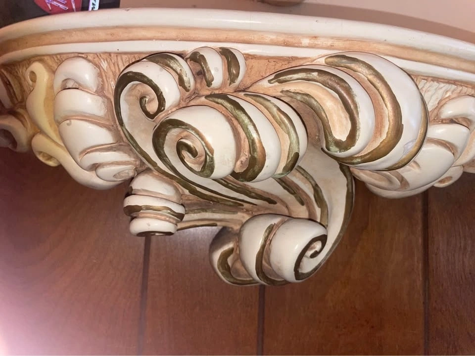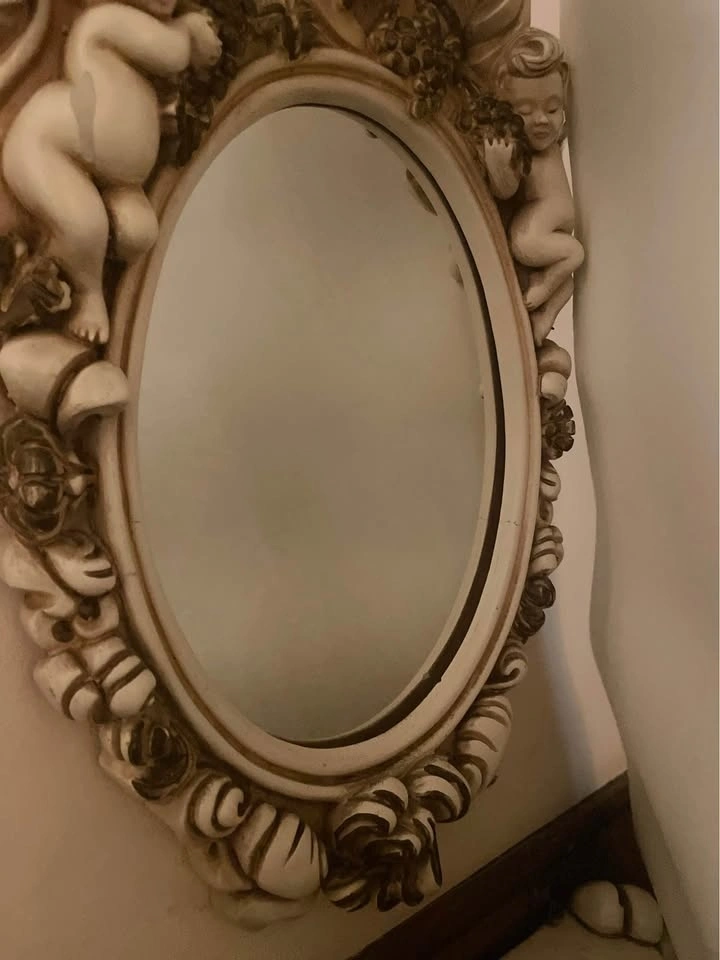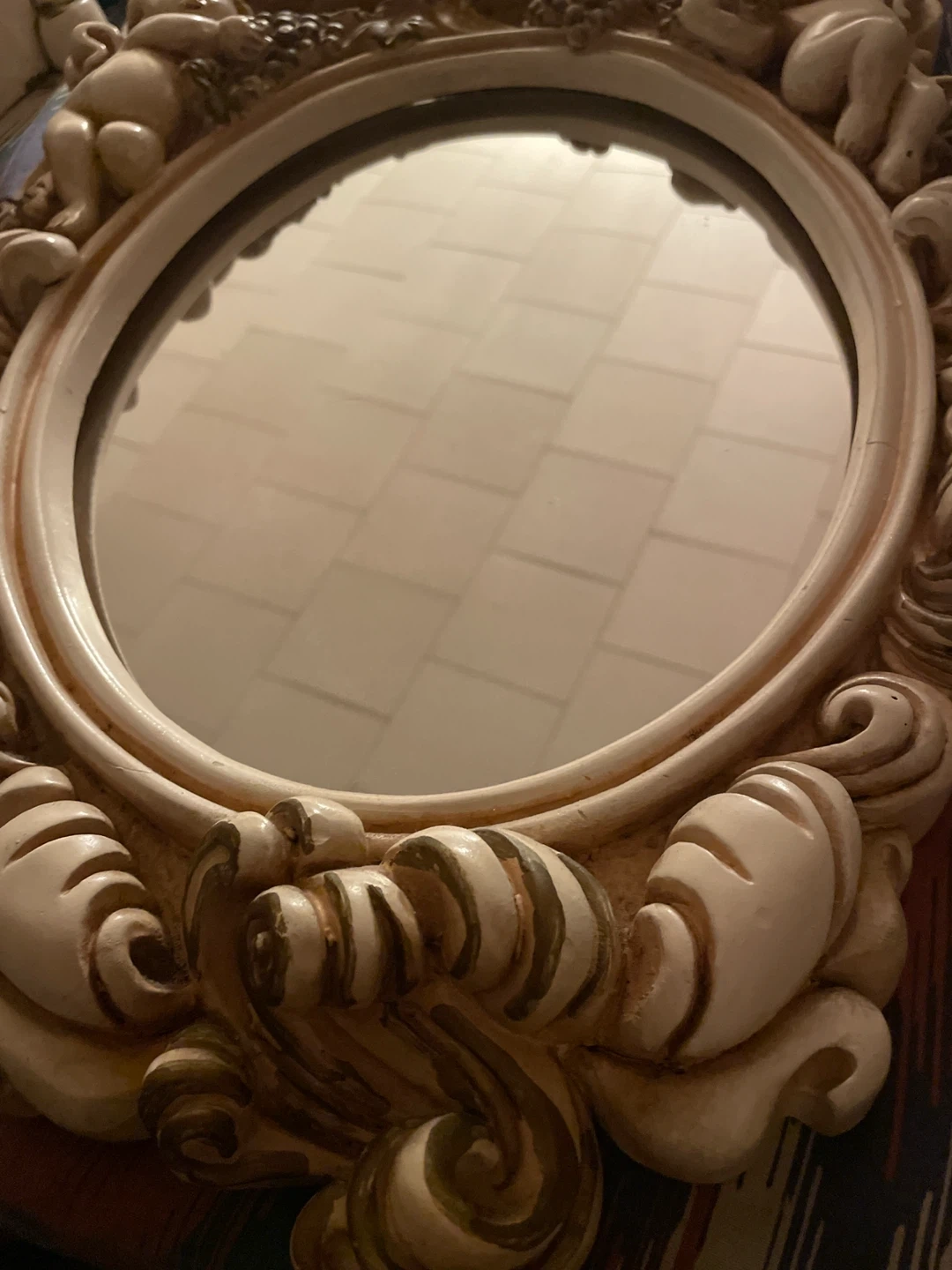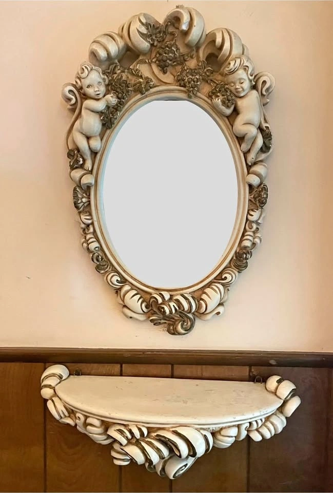 Some damage/chipped paint along the shelf. Mirror is not damaged.