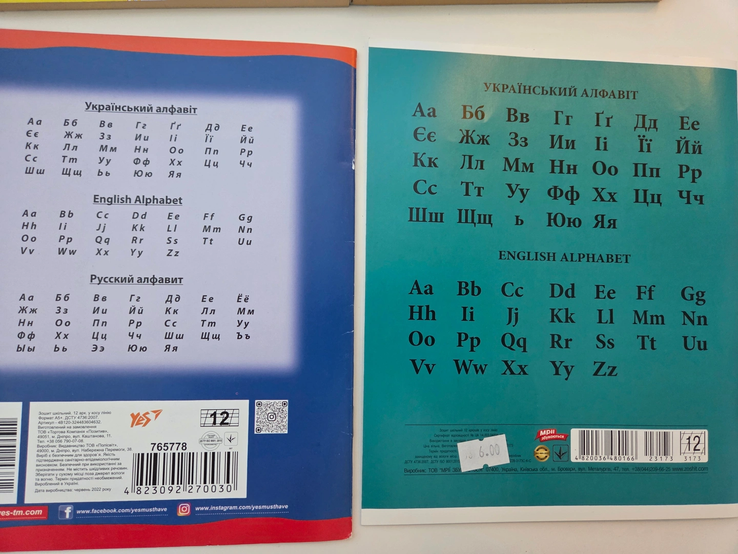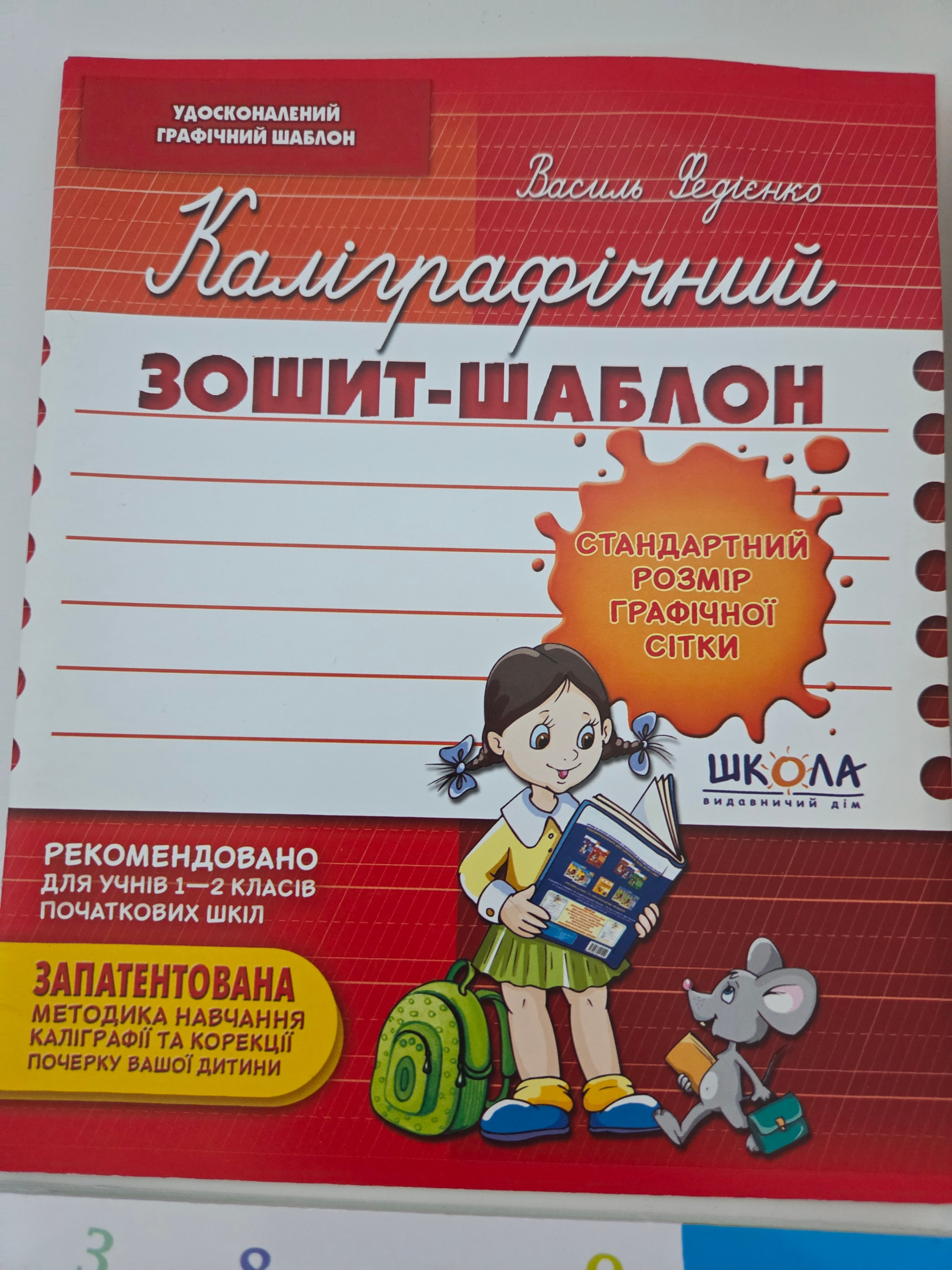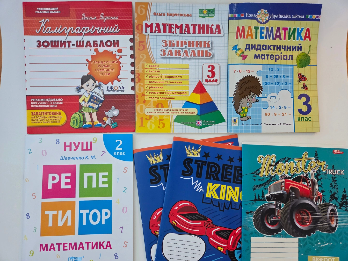 Bundle of Ukrainian school materials – perfect for extra practice or homeschooling. Includes math workbooks for grades 2–3 (НУШ), a calligraphy copybook with angled guide lines, and a few clean lined notebooks with fun covers.