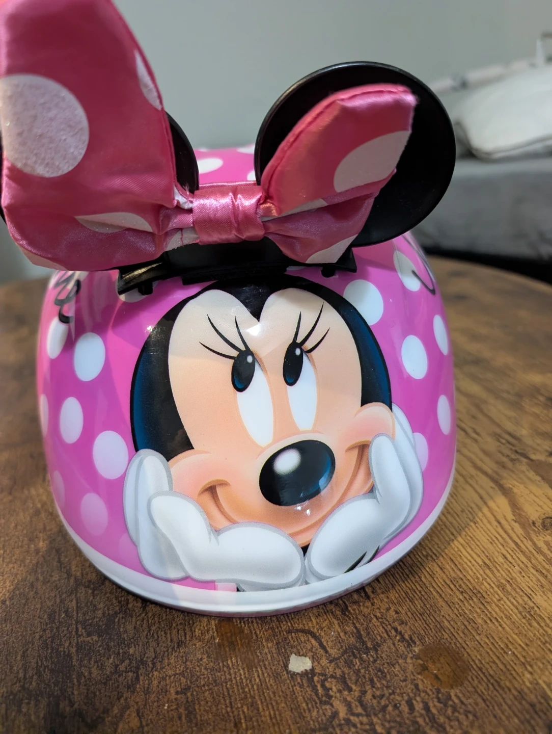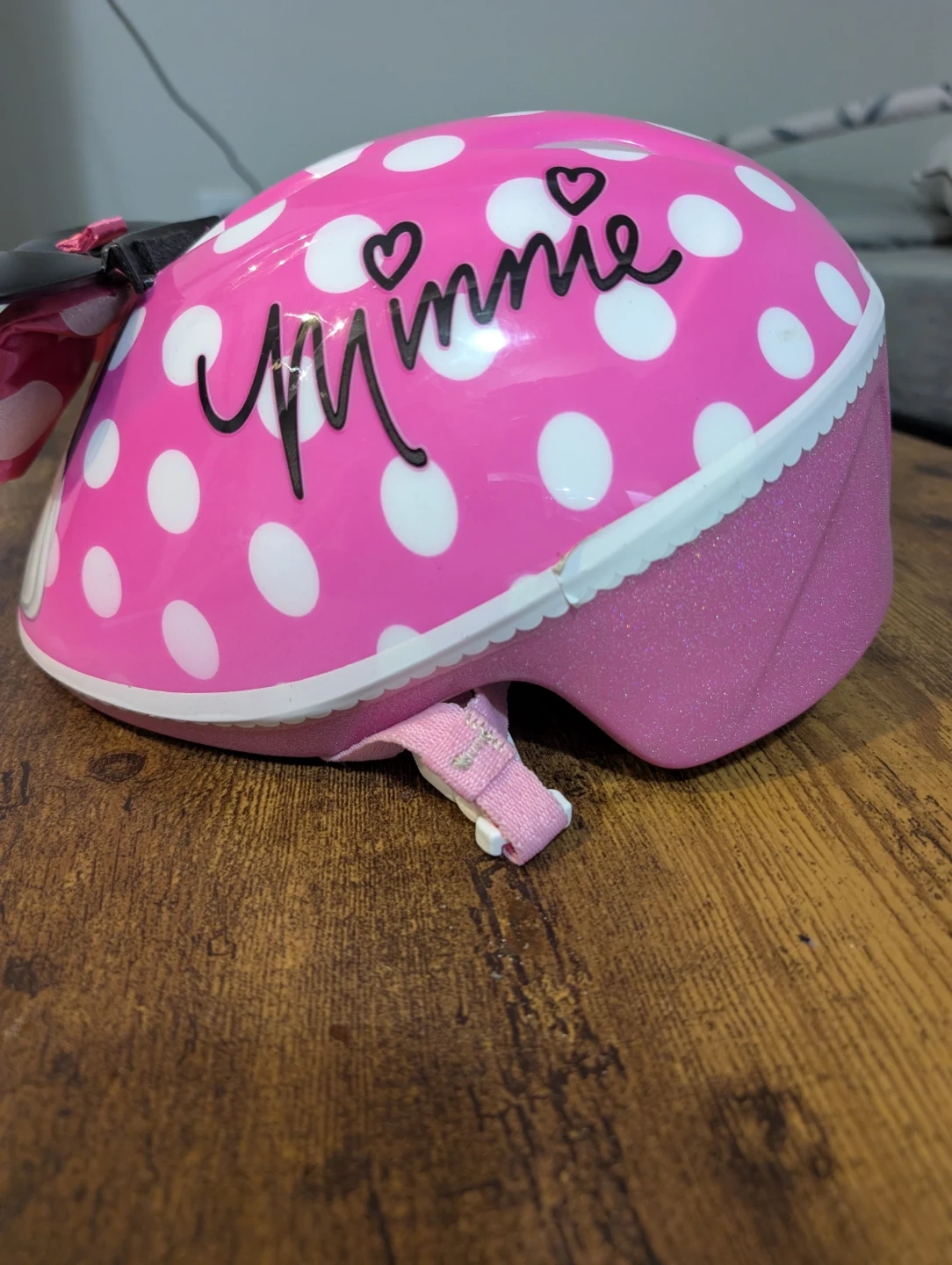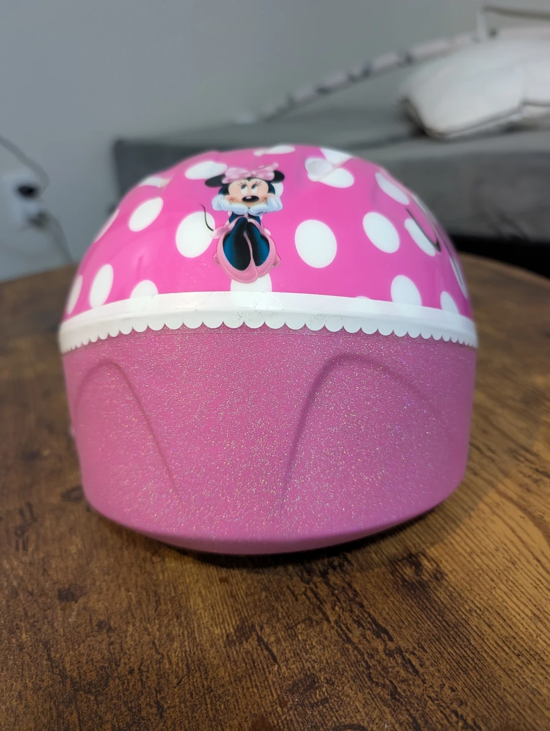 This is a cute Minnie Mouse helmet for kids! It's pink with white polka dots and has a Minnie Mouse design on the front. Perfect for biking, skating, or scootering. Size 48-52 cm