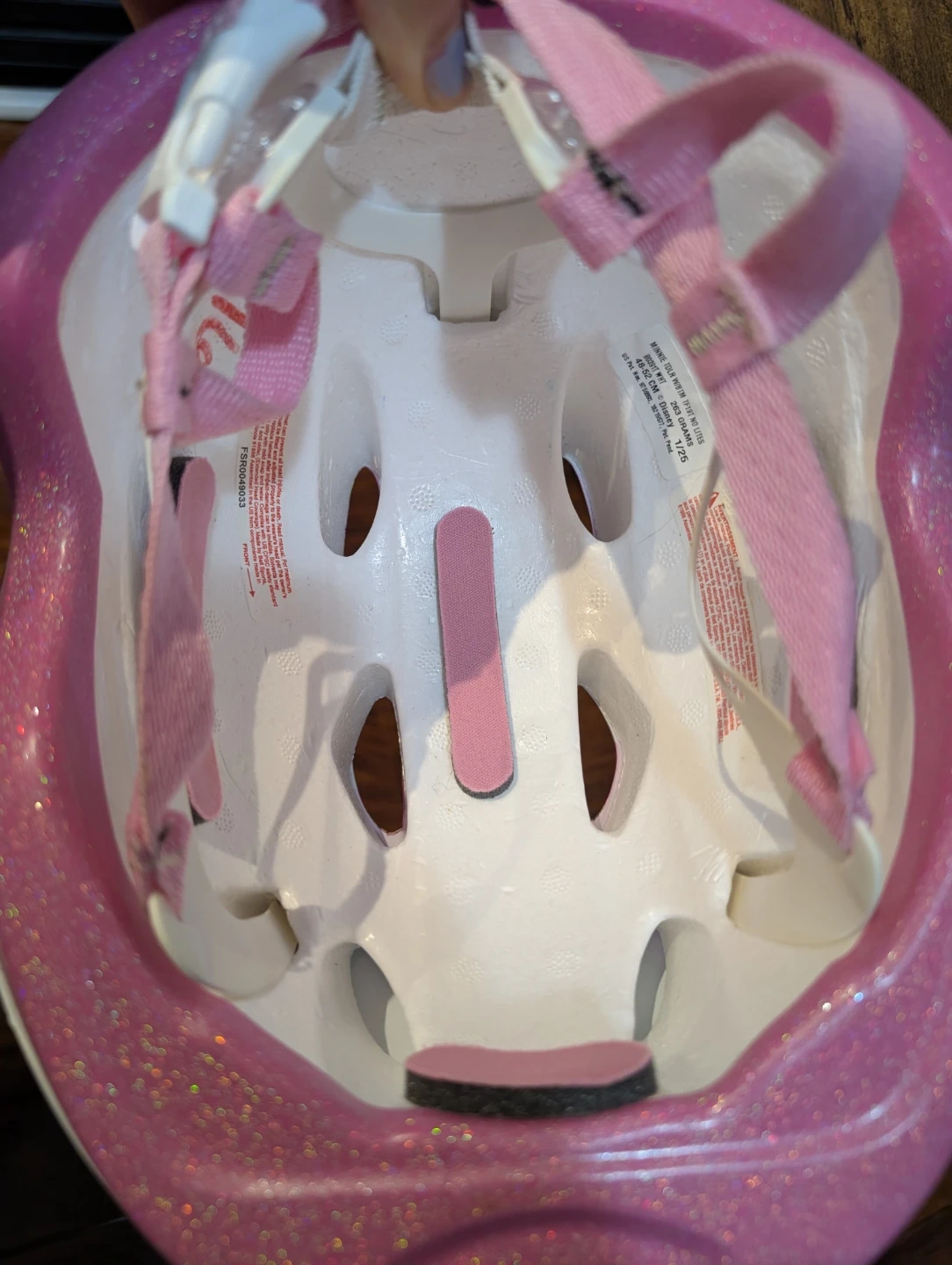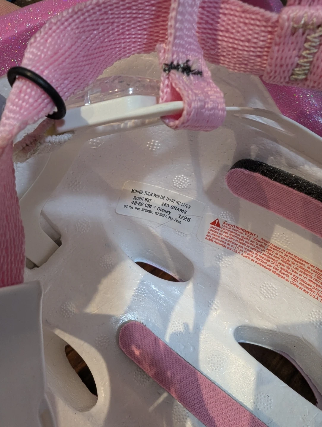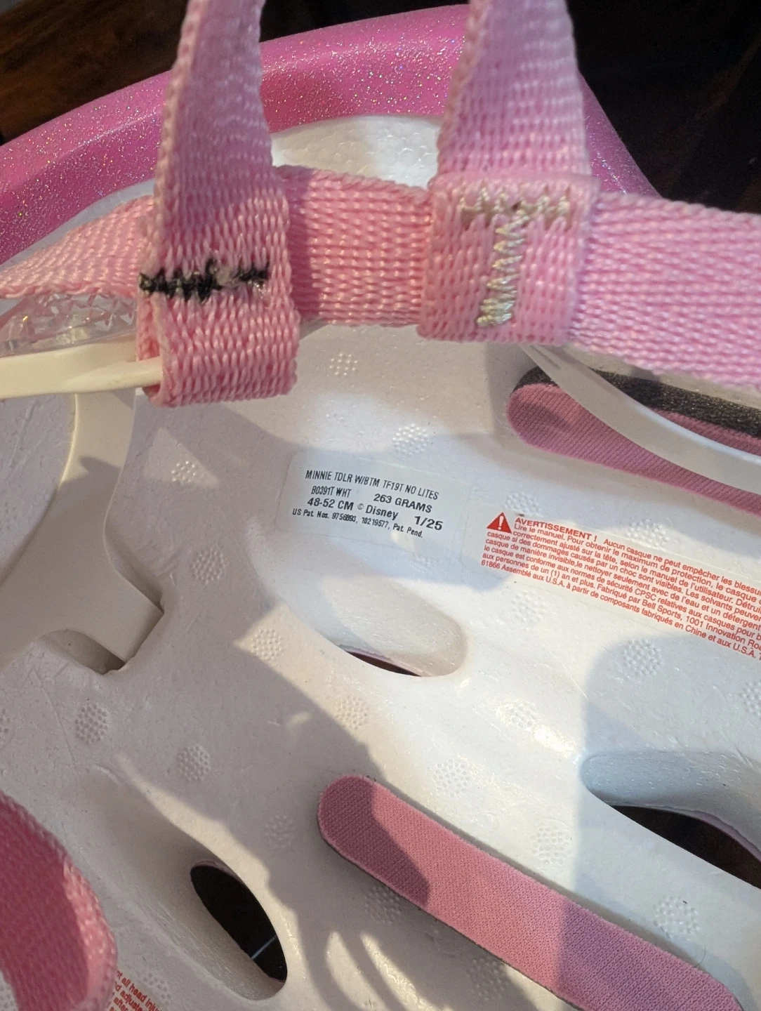 This is a cute Minnie Mouse helmet for kids! It's pink with white polka dots and has a Minnie Mouse design on the front. Perfect for biking, skating, or scootering. Size 48-52 cm