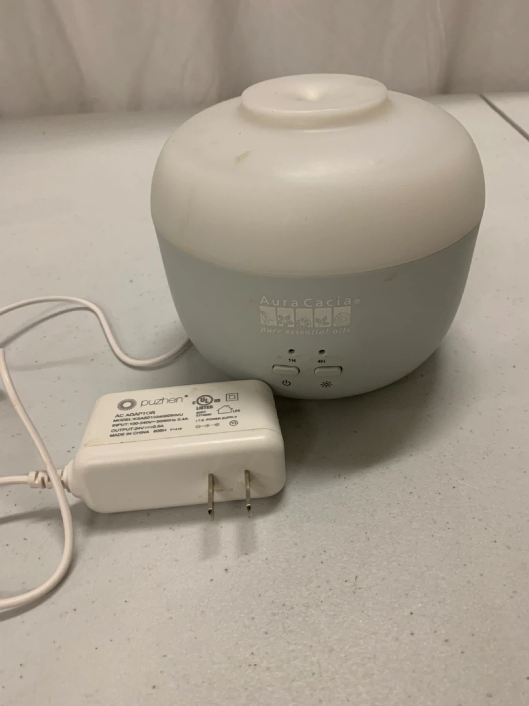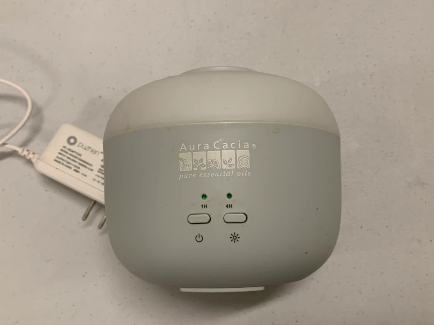 Features: Ultrasonic diffuser (cool mist), timer settings (1H / 4H), and LED light button.