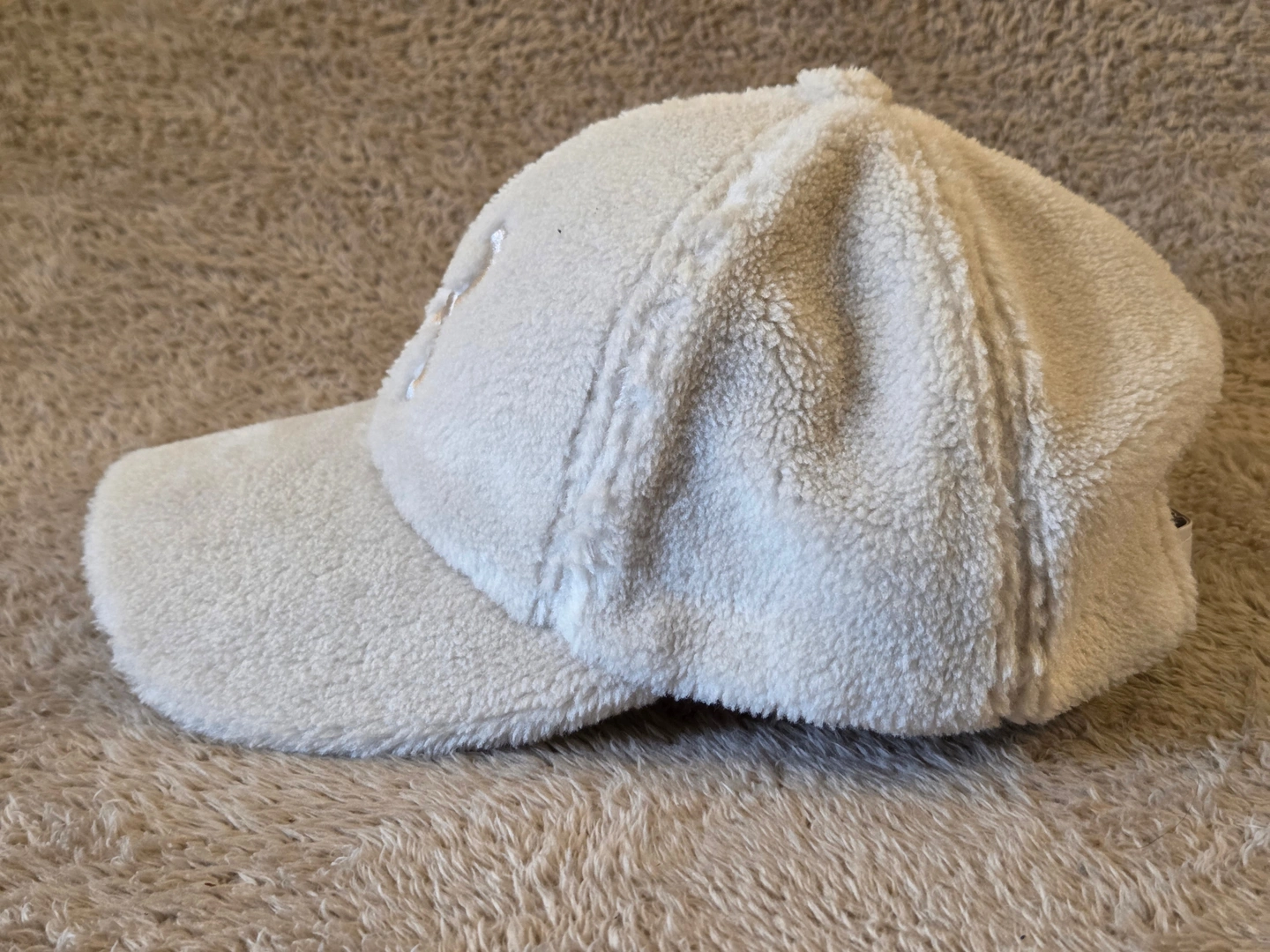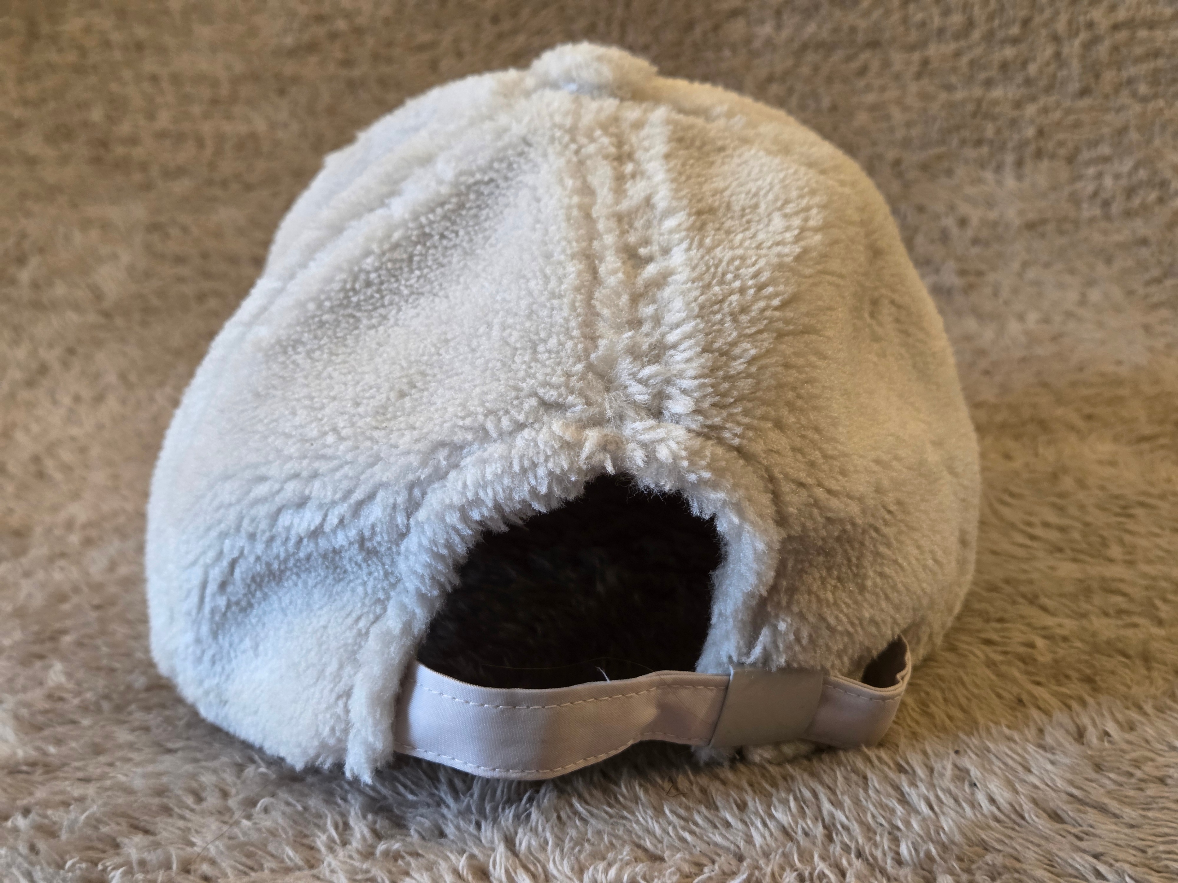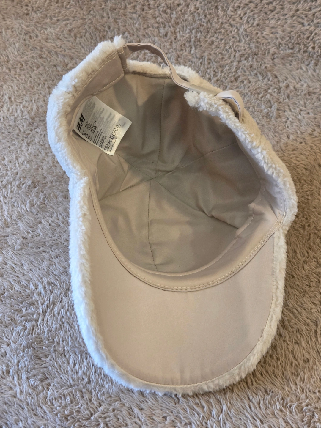 Cozy sherpa baseball cap from H&M in a clean cream tone – looks and feels like new. Soft fleece outside, smooth quilted lining inside, and an adjustable back strap for a comfy fit.
