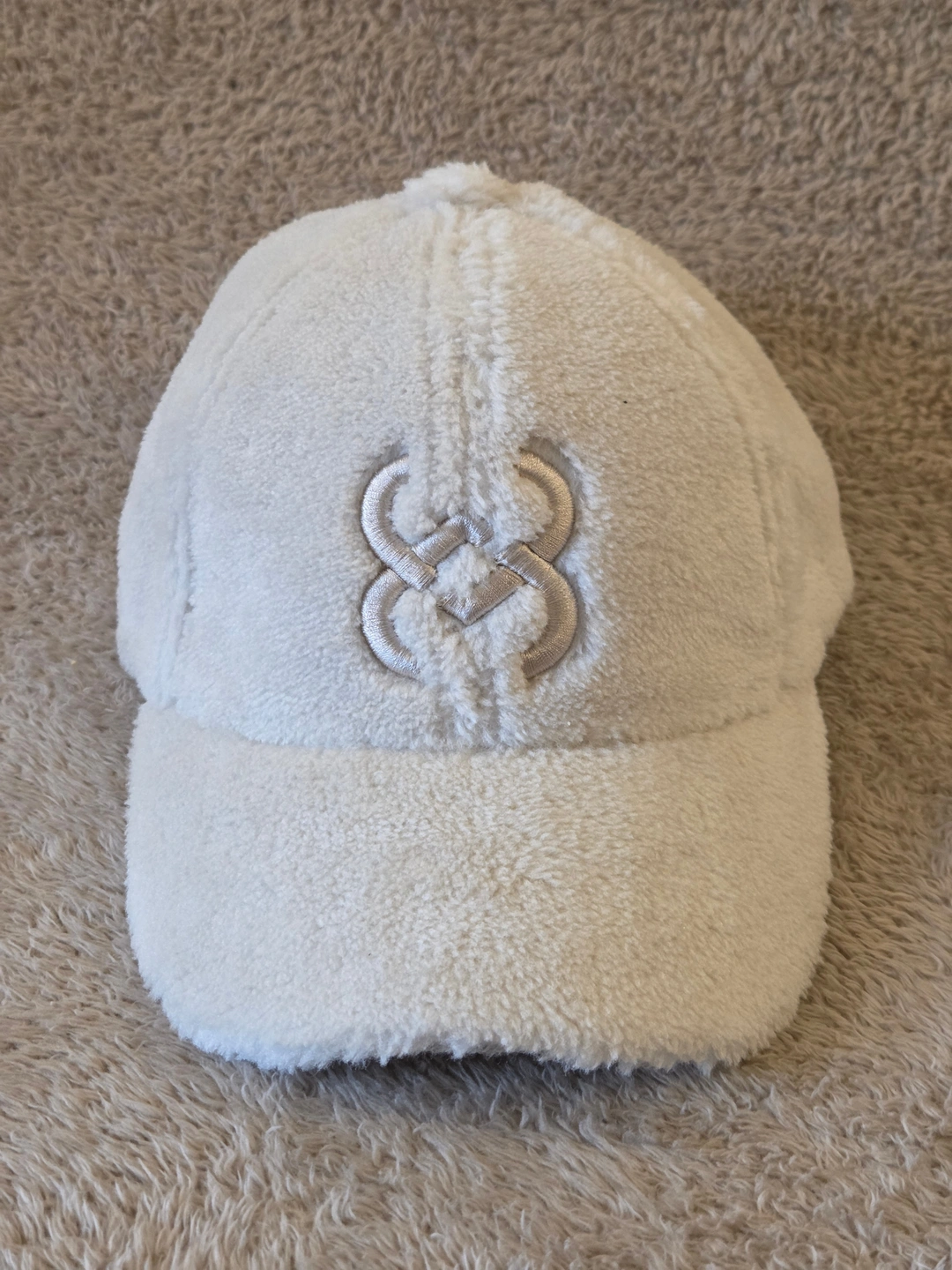 – Key specs: sherpa-fleece shell, quilted lining, curved brim, tonal embroidered logo, adjustable strap; size XS/S fits head 52–54 cm; colour: cream/ivory; care label: machine wash cold 30°C, do not bleach, line dry.