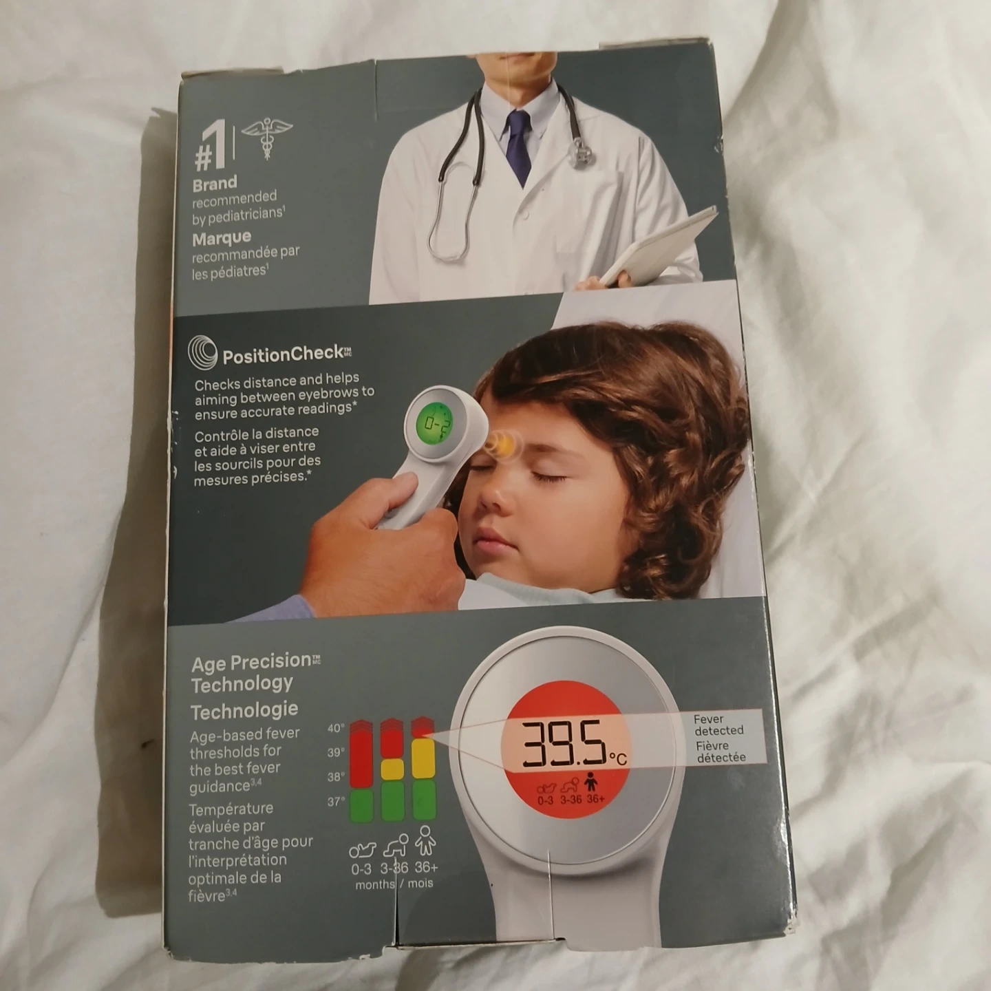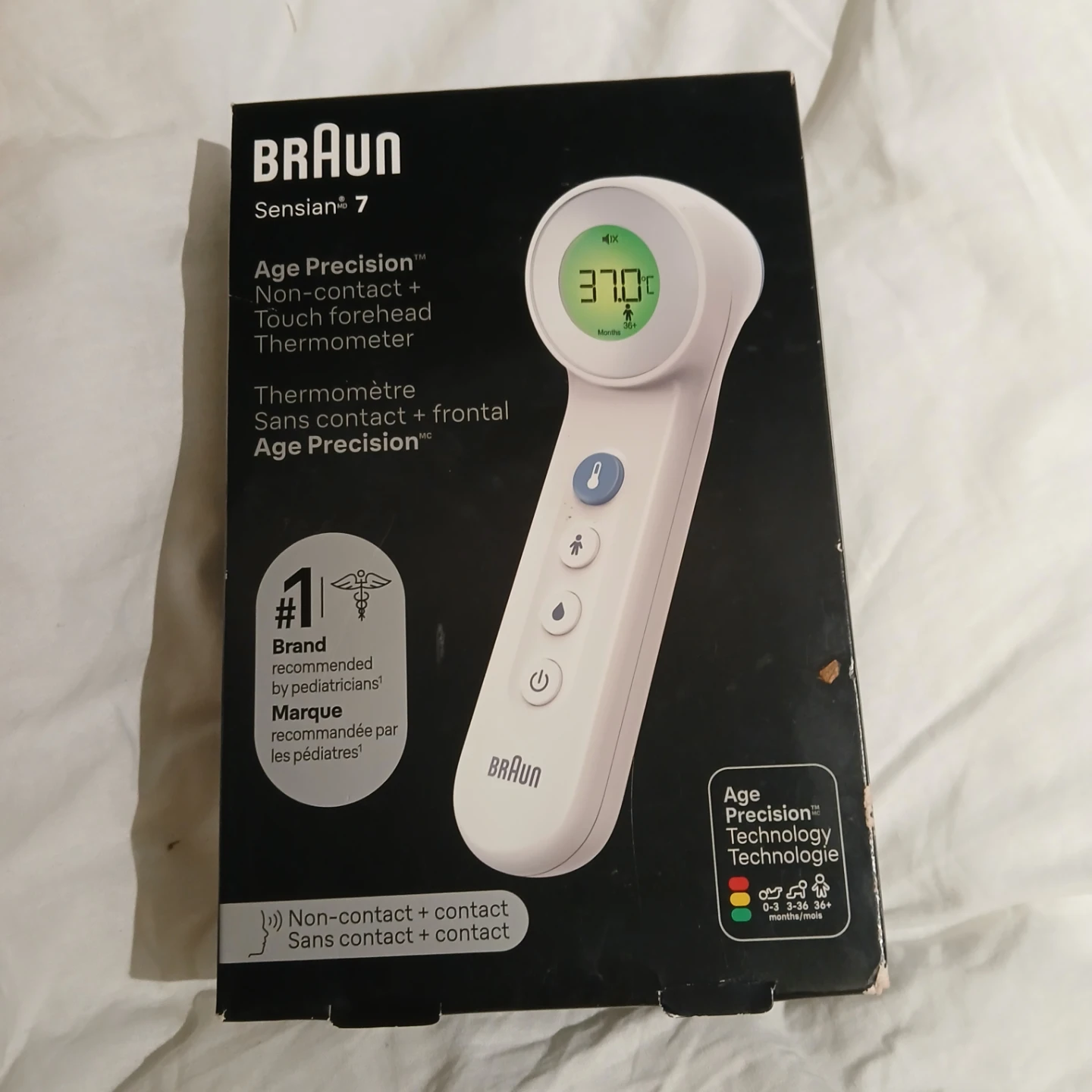 Selling a Braun Sensian+ 7 non-contact thermometer. It features age precision technology and touch forehead functionality. It's recommended by pediatricians and provides accurate readings. The box is included.
