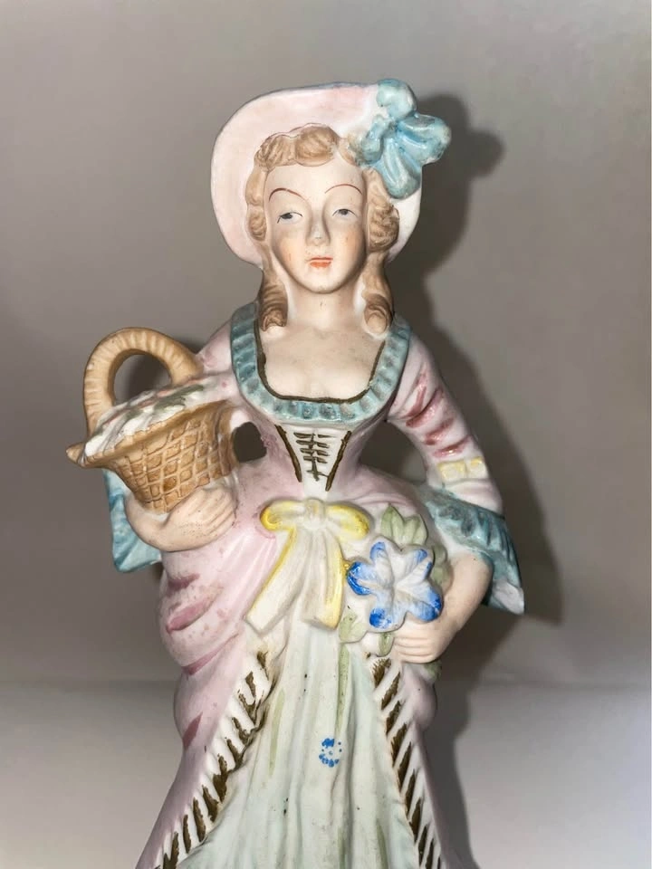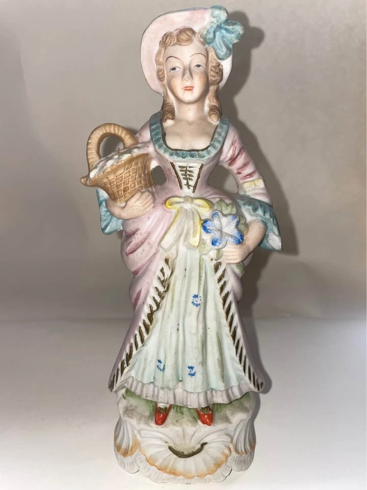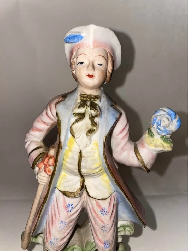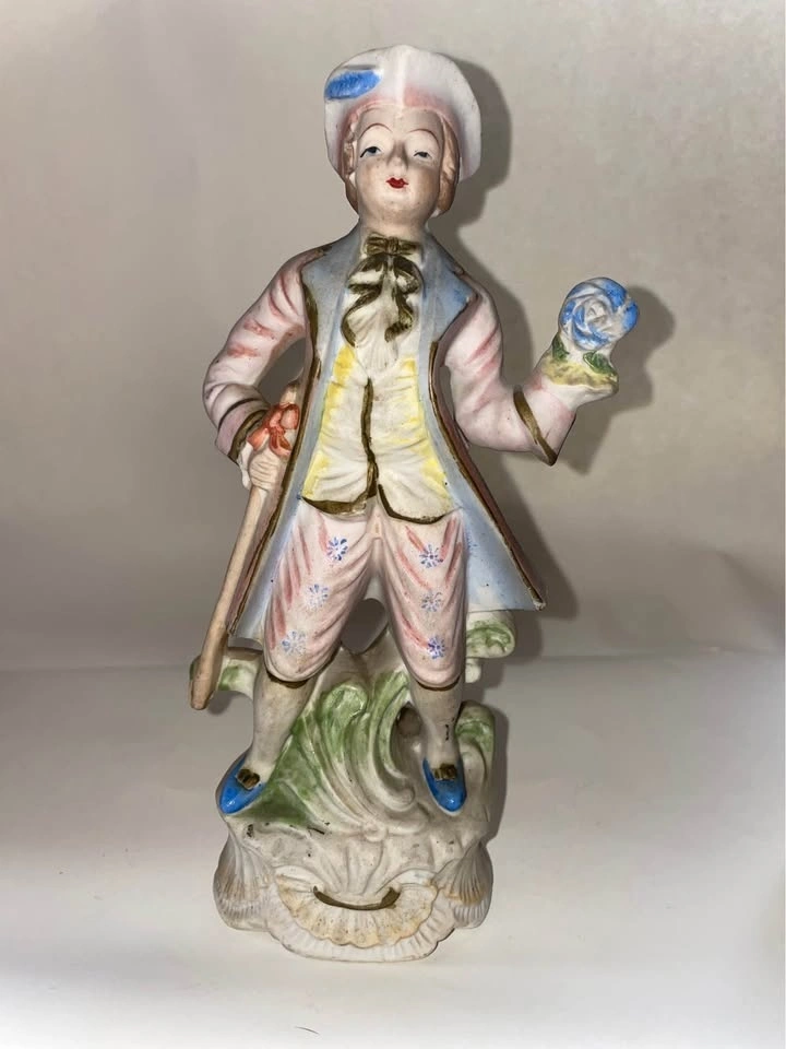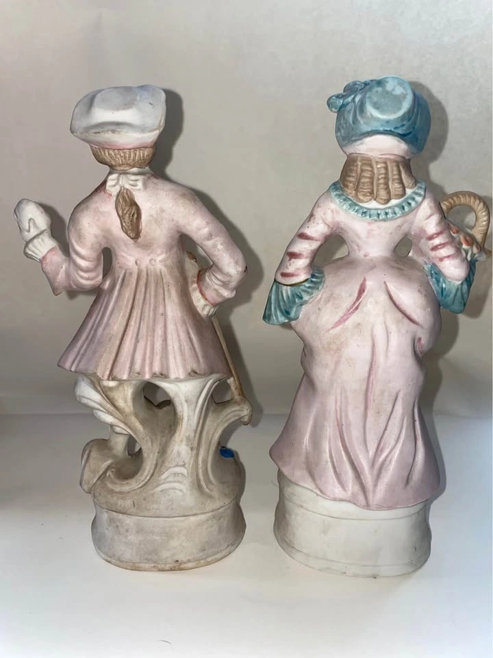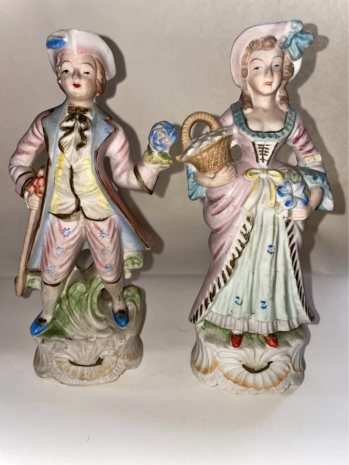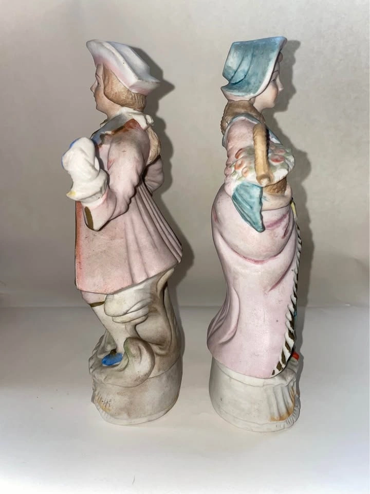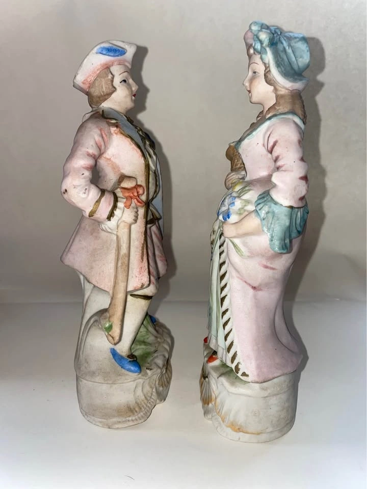 This product is a set of vintage porcelain figurines from Japan, specifically made during the time period of 1920-1949. These figurines are original and have a matte finish, reflecting the Colonial style of the era.